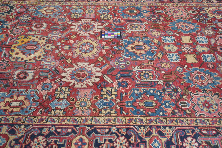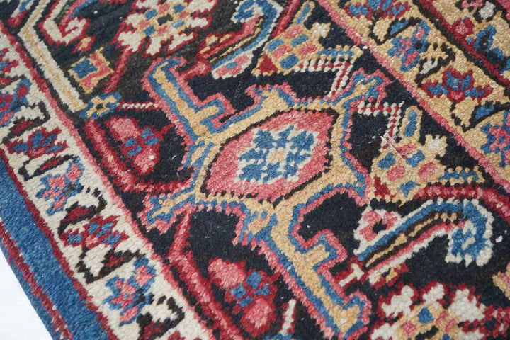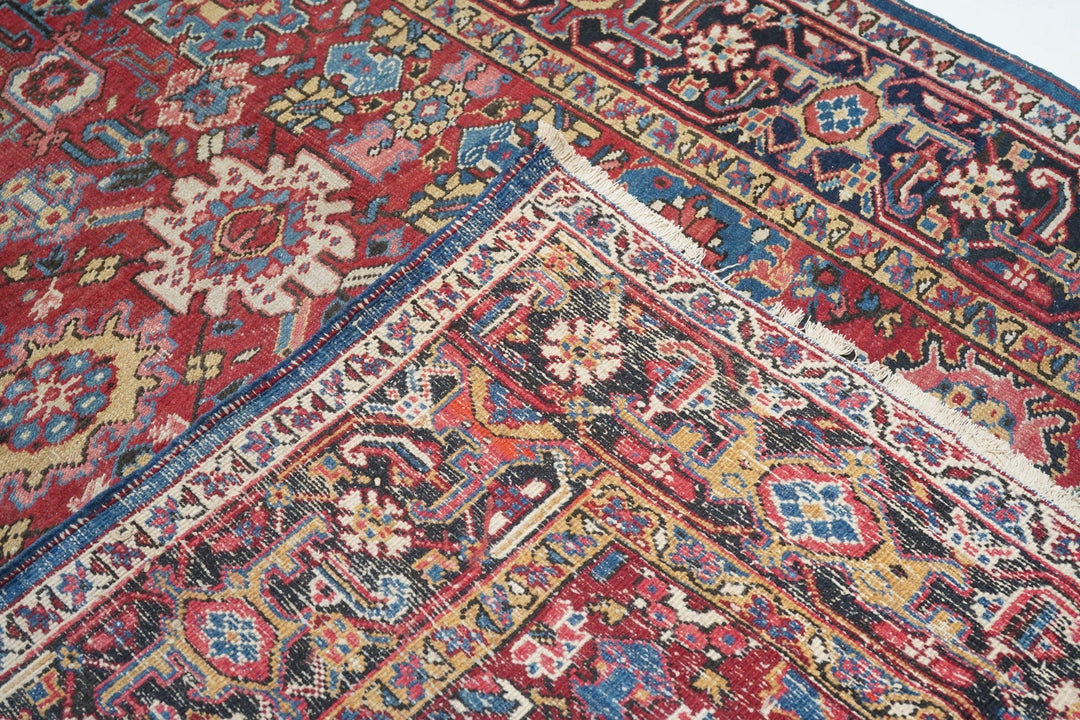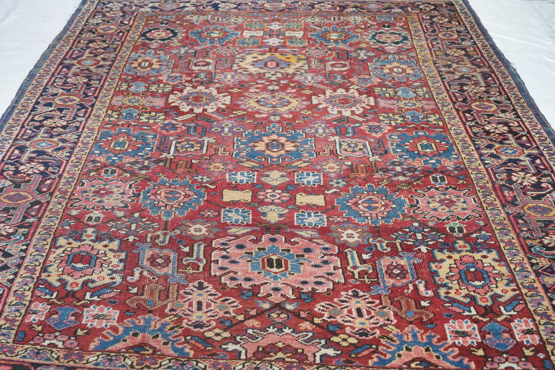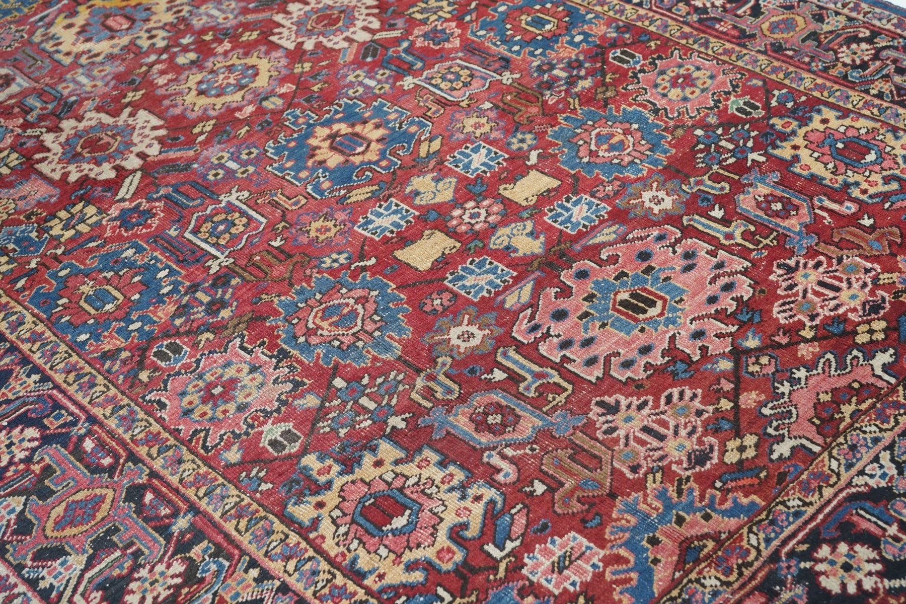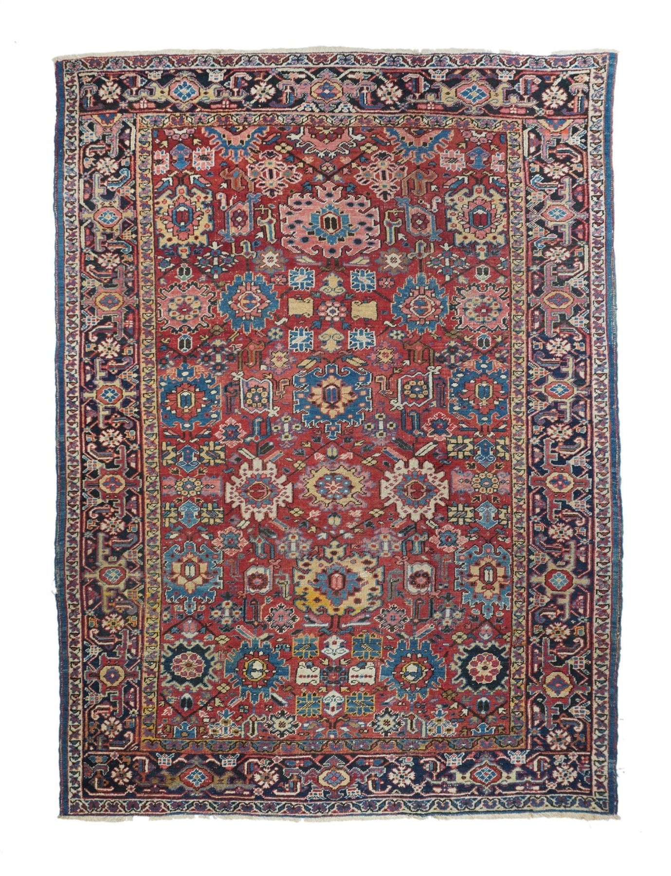 The coral field is dominated by eight giant bitonal fringed, bent and strongly hooked leaves. Teal, medium-dark blue, ecru and navy details. Light blue inner border. Navy strip style main border with reversing turtles in cream and blues/Areas of visible wear. Medium-coarse weave.