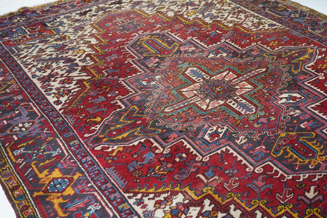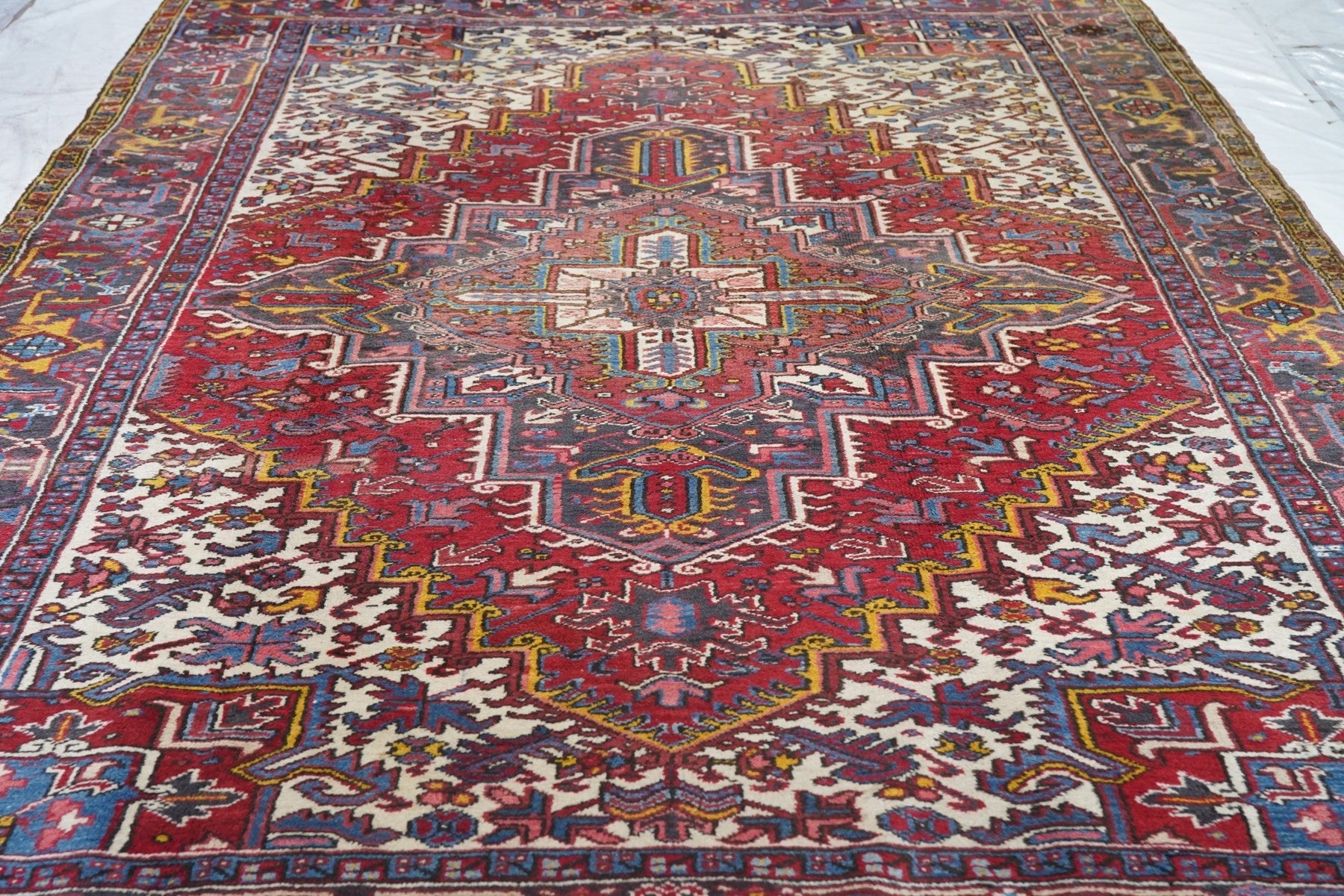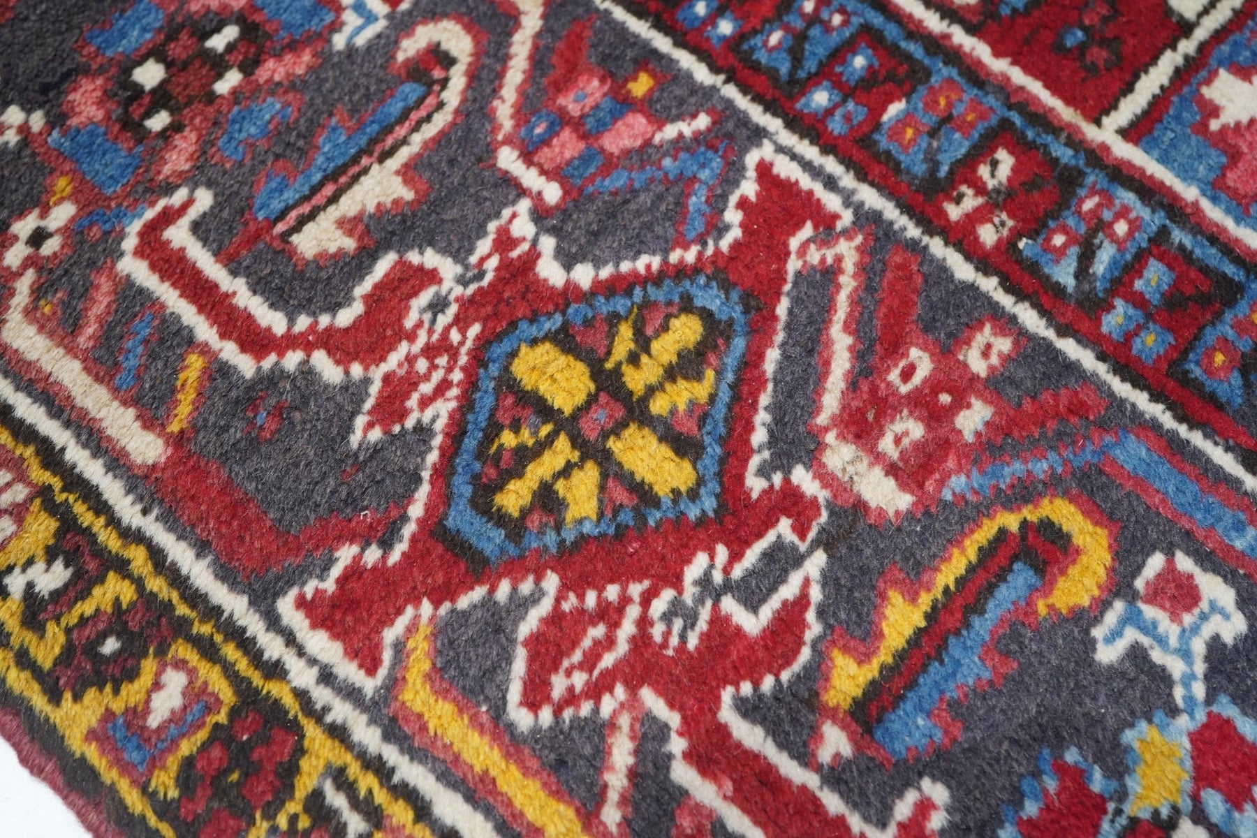The stepped red field is very slightly concave, centred by a layered blue, rose and cream medallion with internal pendants and radiating flowers. Radiating flowers decorate the field and broad cream spandrels. Red and blue corner squares. Dark greenish-blue strip style main border with reversing turtles. Moderate NW Persian village weave in a characteristic Heriz design and palette. Good condition.