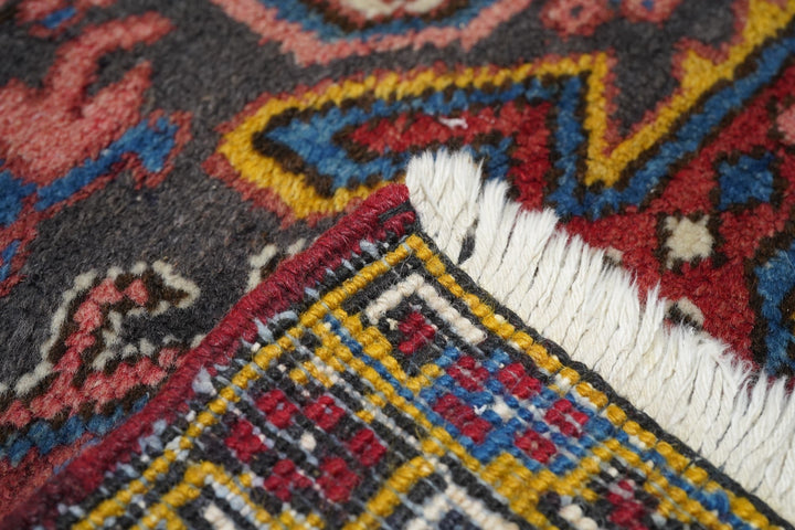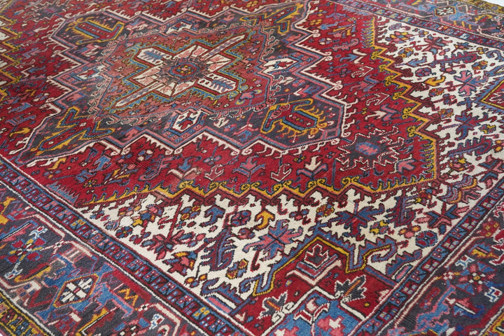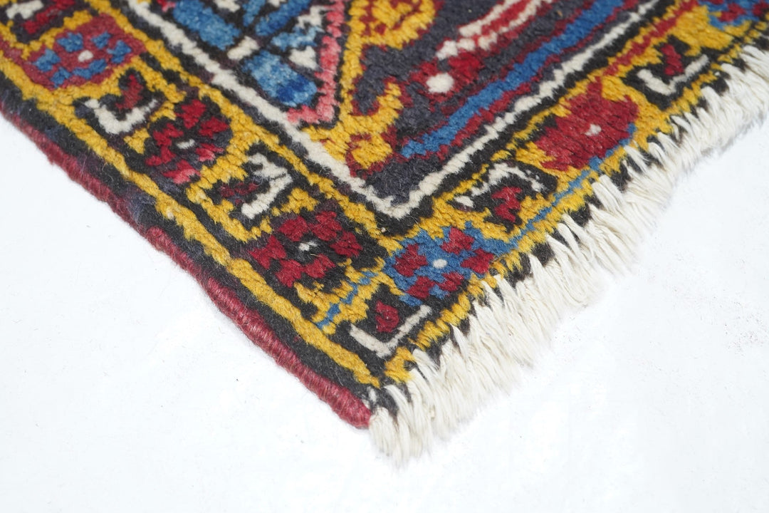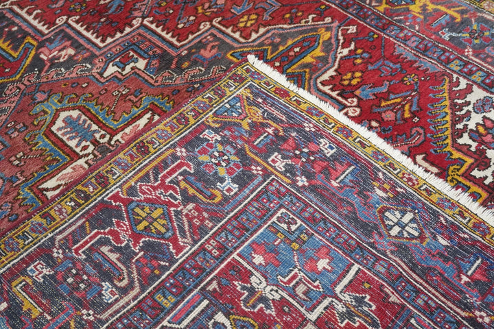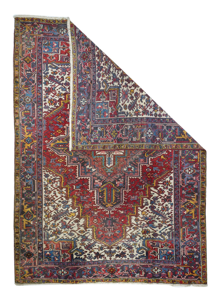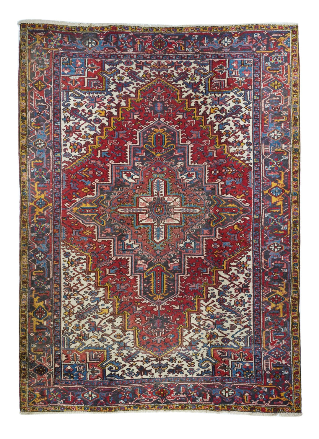The stepped red field is very slightly concave, centred by a layered blue, rose and cream medallion with internal pendants and radiating flowers. Radiating flowers decorate the field and broad cream spandrels. Red and blue corner squares. Dark greenish-blue strip style main border with reversing turtles. Moderate NW Persian village weave in a characteristic Heriz design and palette. Good condition.