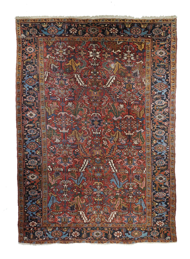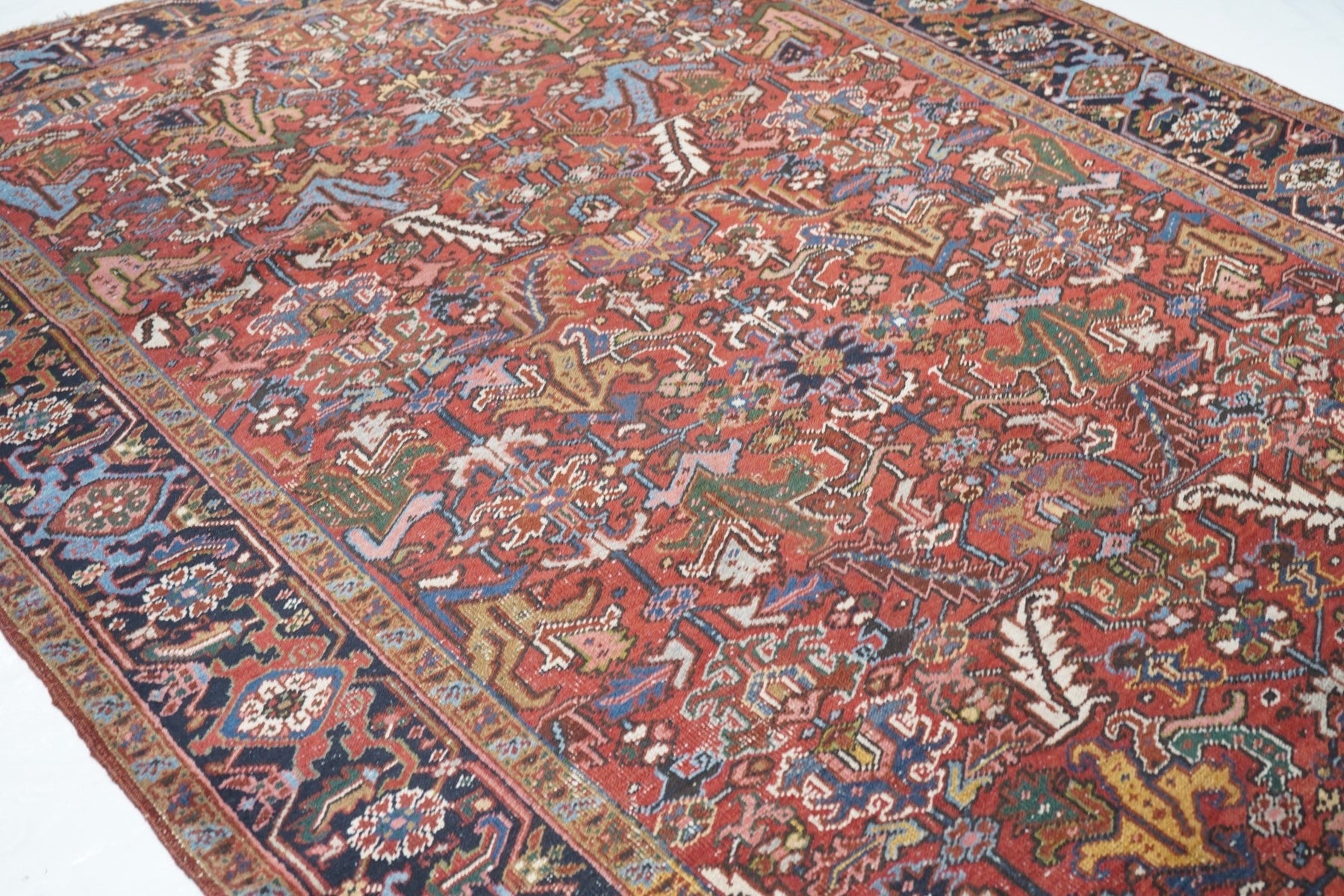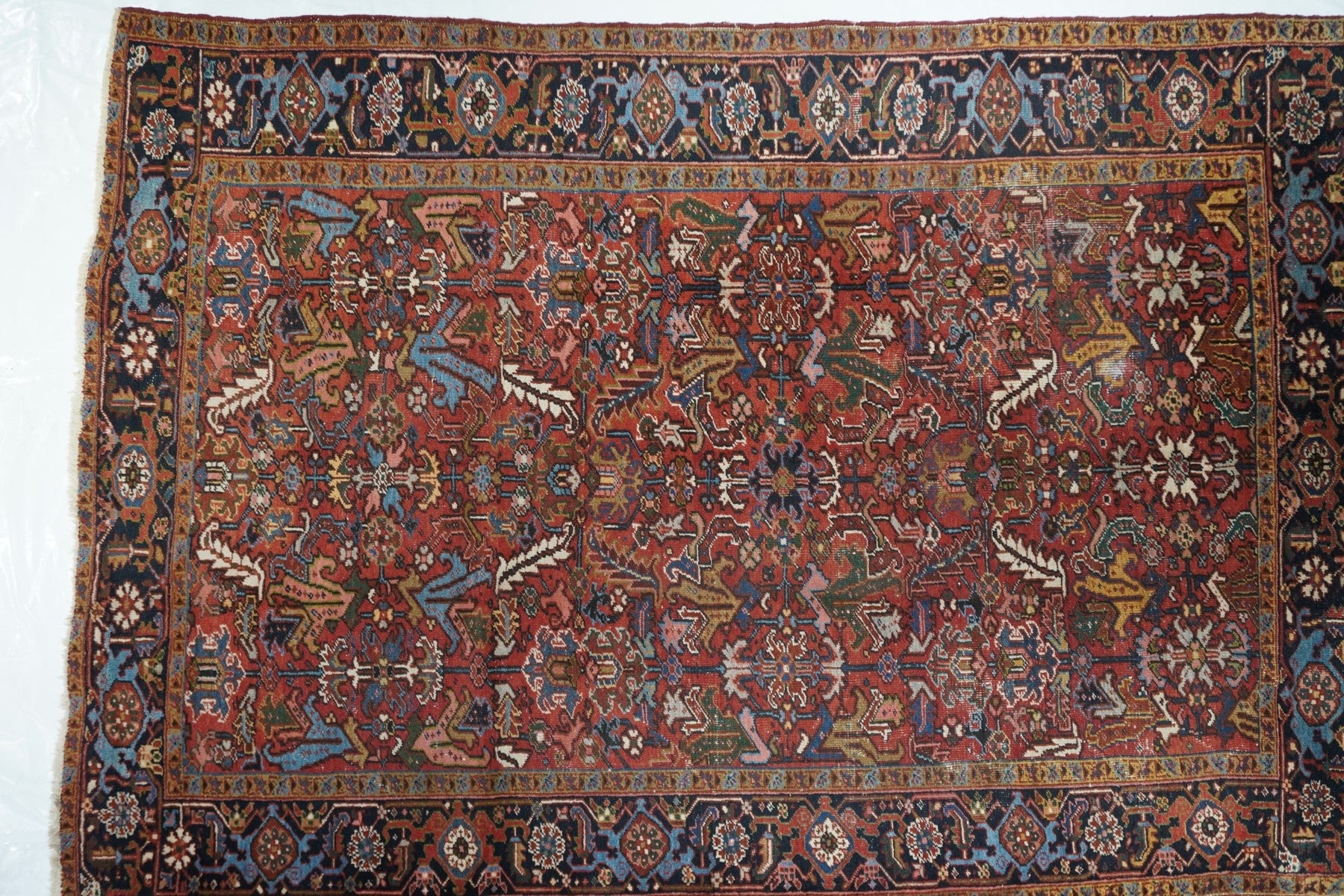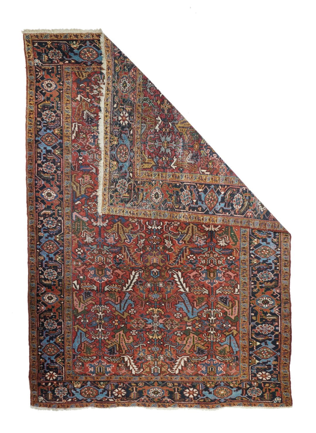 The madder red field hosts a centred, allover design of barbed leaves, radiating simple blossoms and eccentric profile palmettes, accented in ecru, light blue, mustard and teal. Navy strip-style main border with reversing turtles highlighted in luminous light blue. Slight end reduction. Moderate weave on cotton. Good condition.