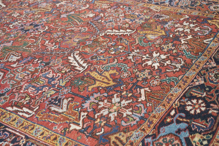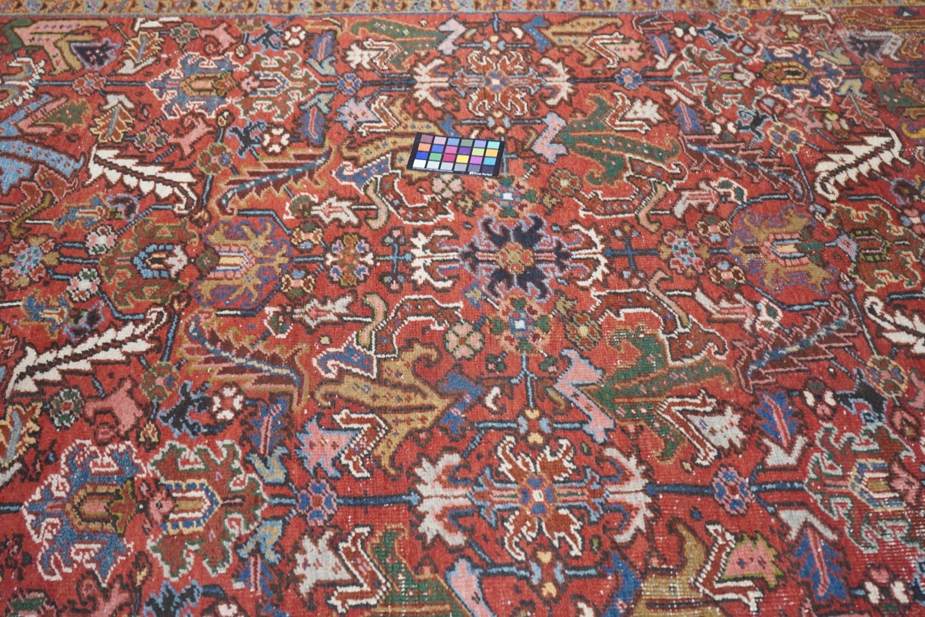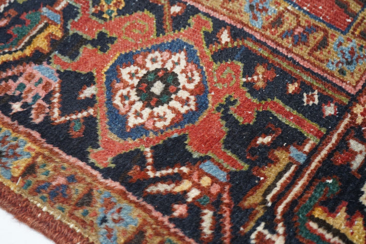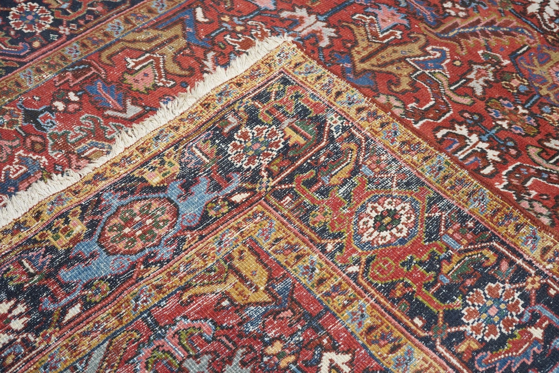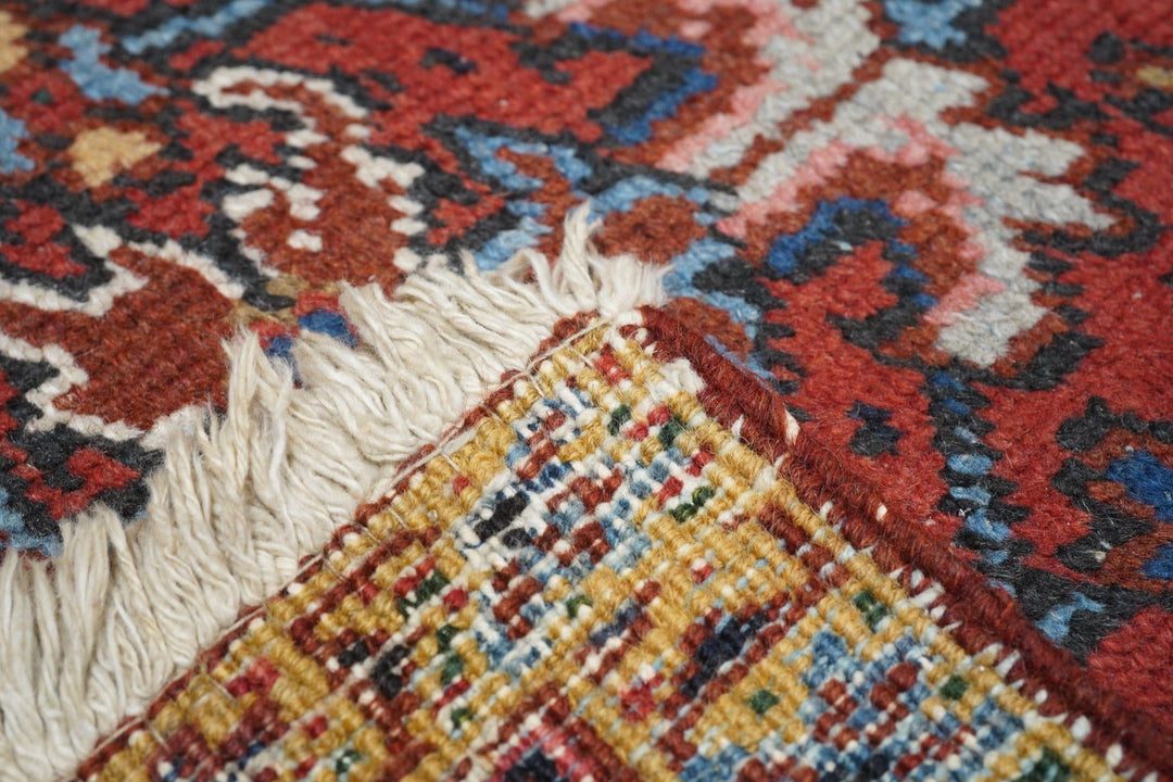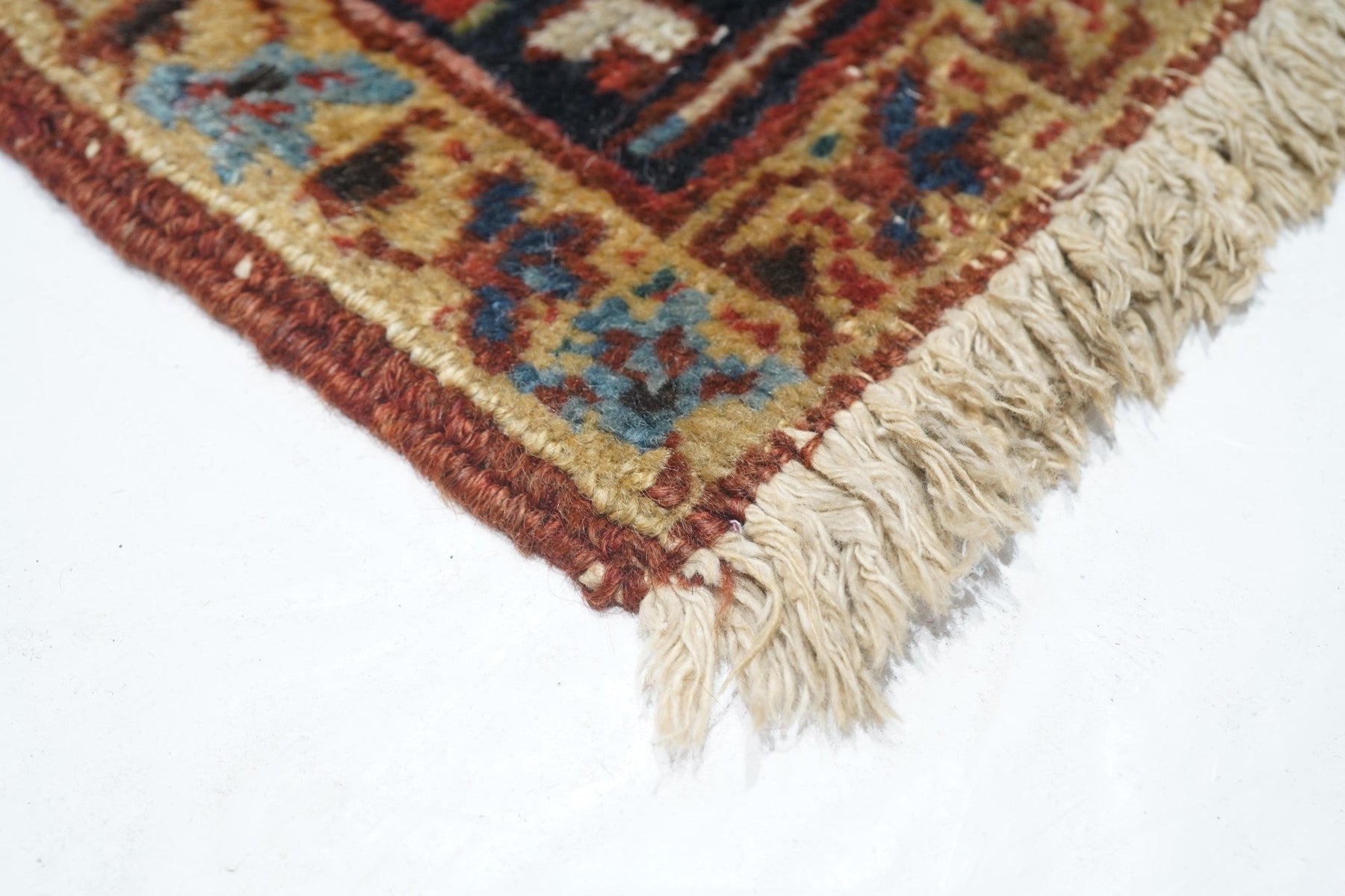 The madder red field hosts a centred, allover design of barbed leaves, radiating simple blossoms and eccentric profile palmettes, accented in ecru, light blue, mustard and teal. Navy strip-style main border with reversing turtles highlighted in luminous light blue. Slight end reduction. Moderate weave on cotton. Good condition.