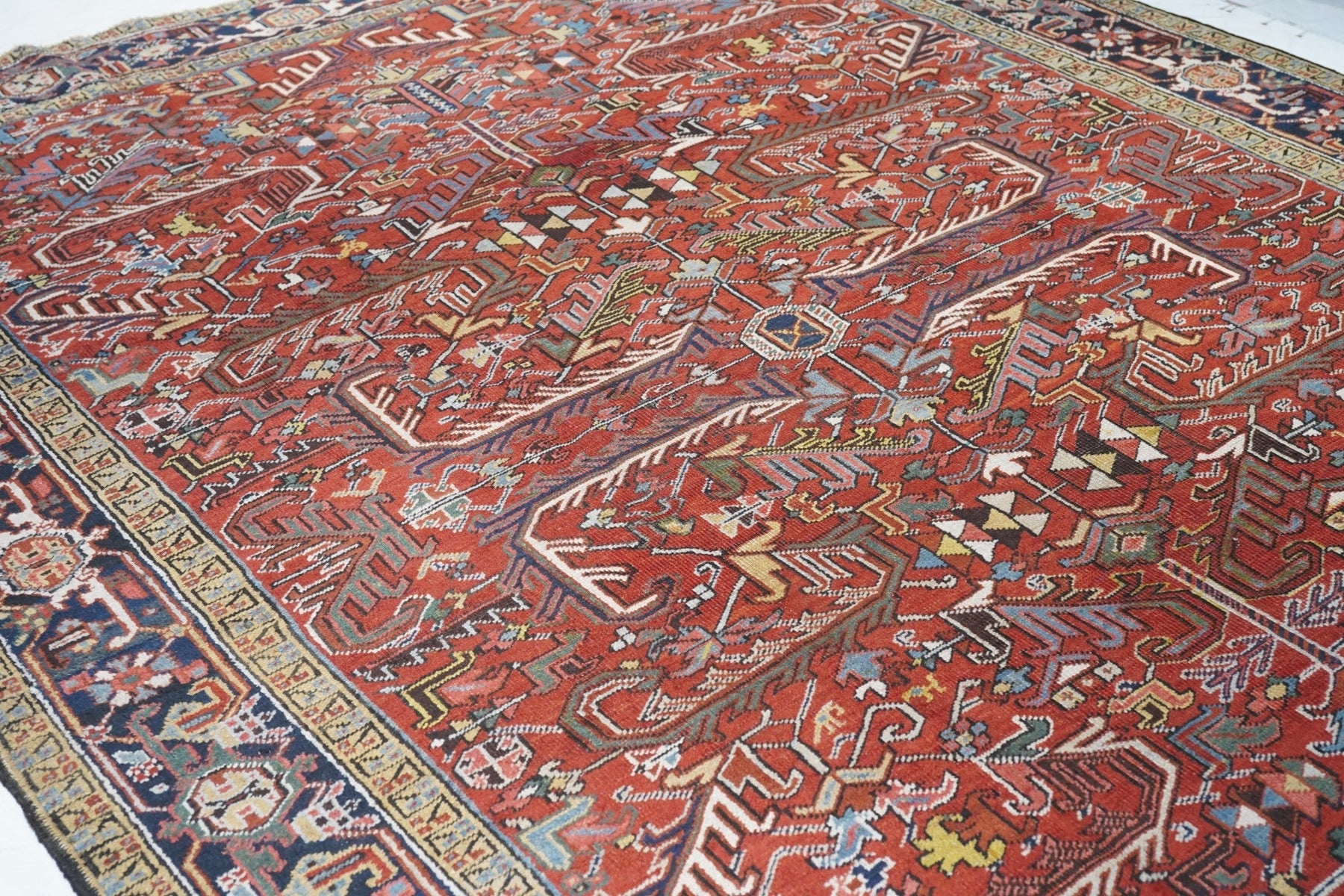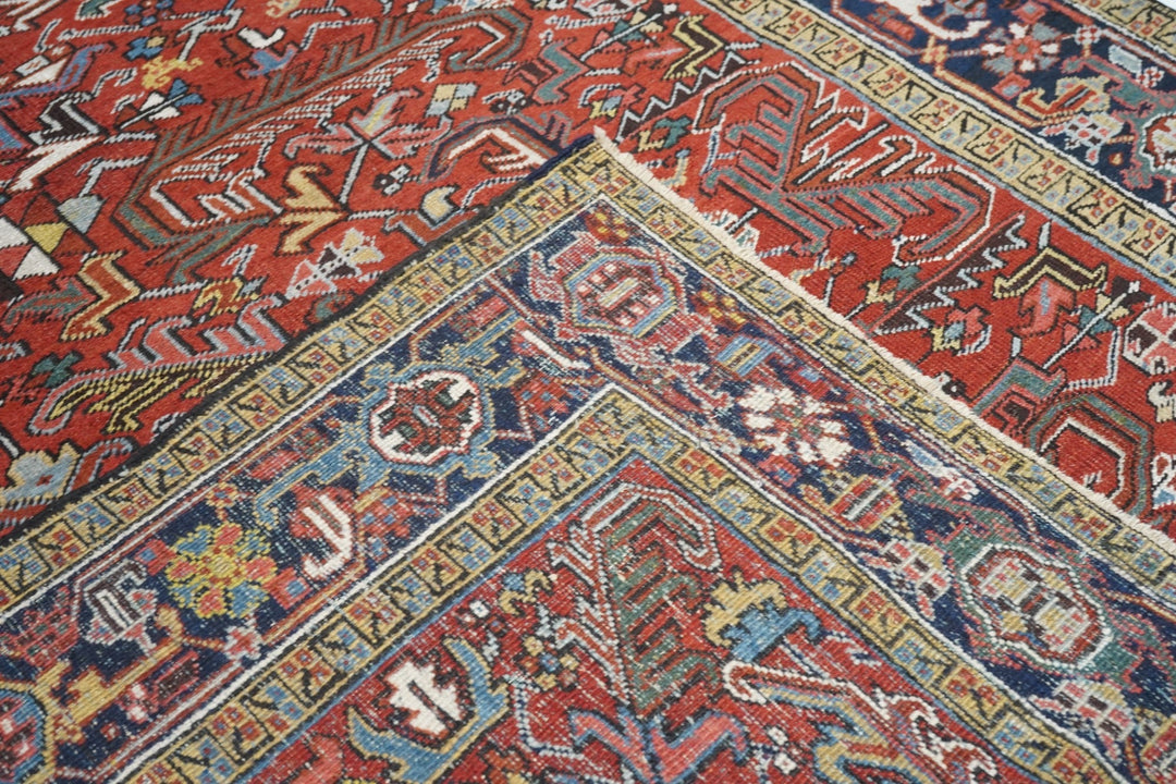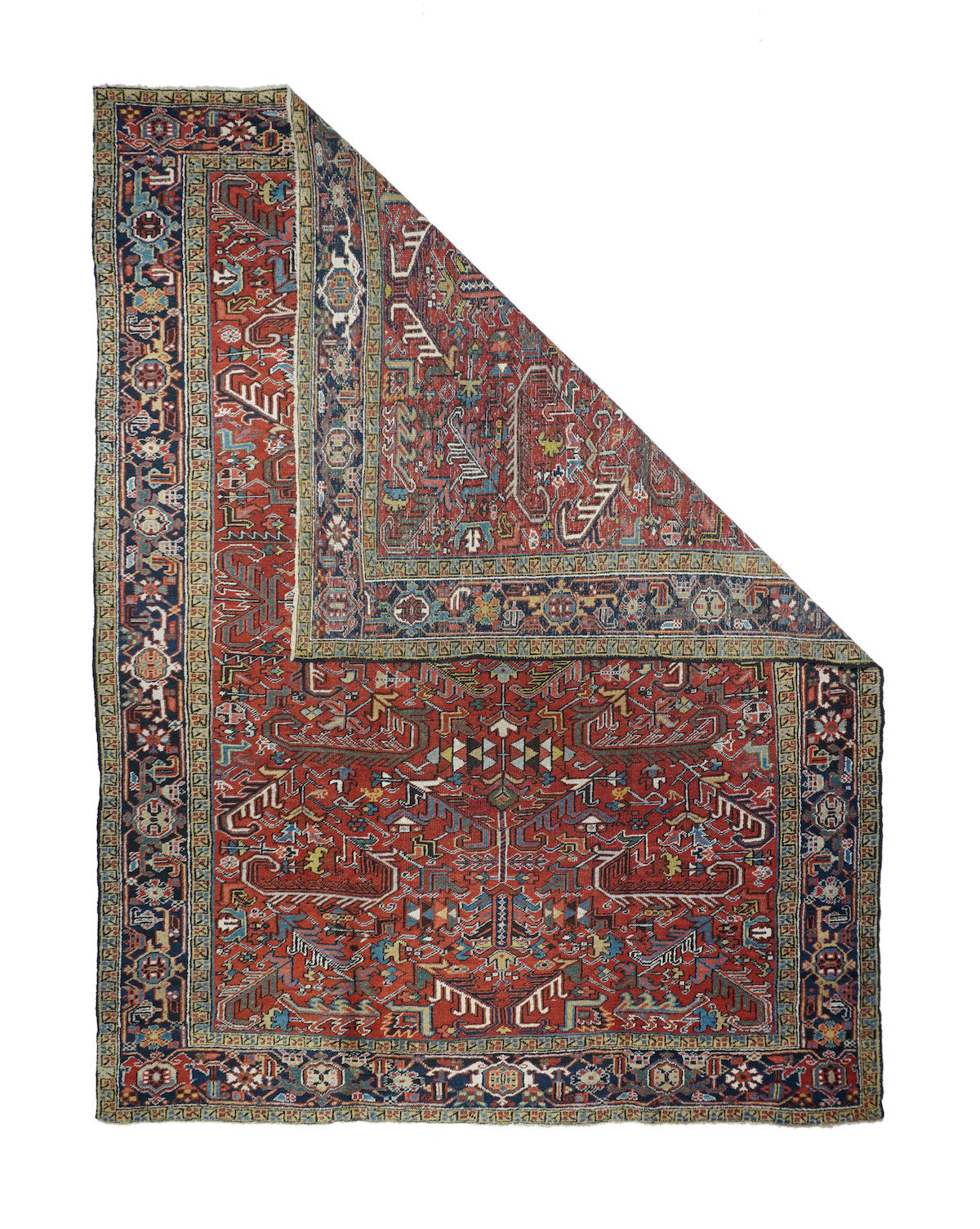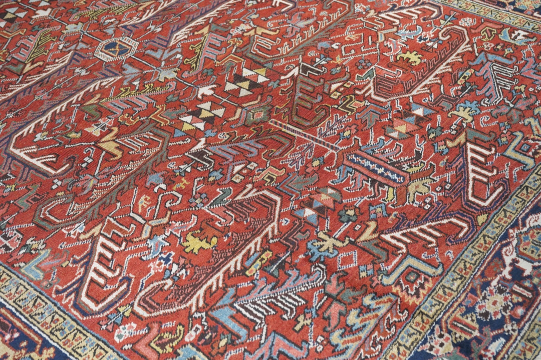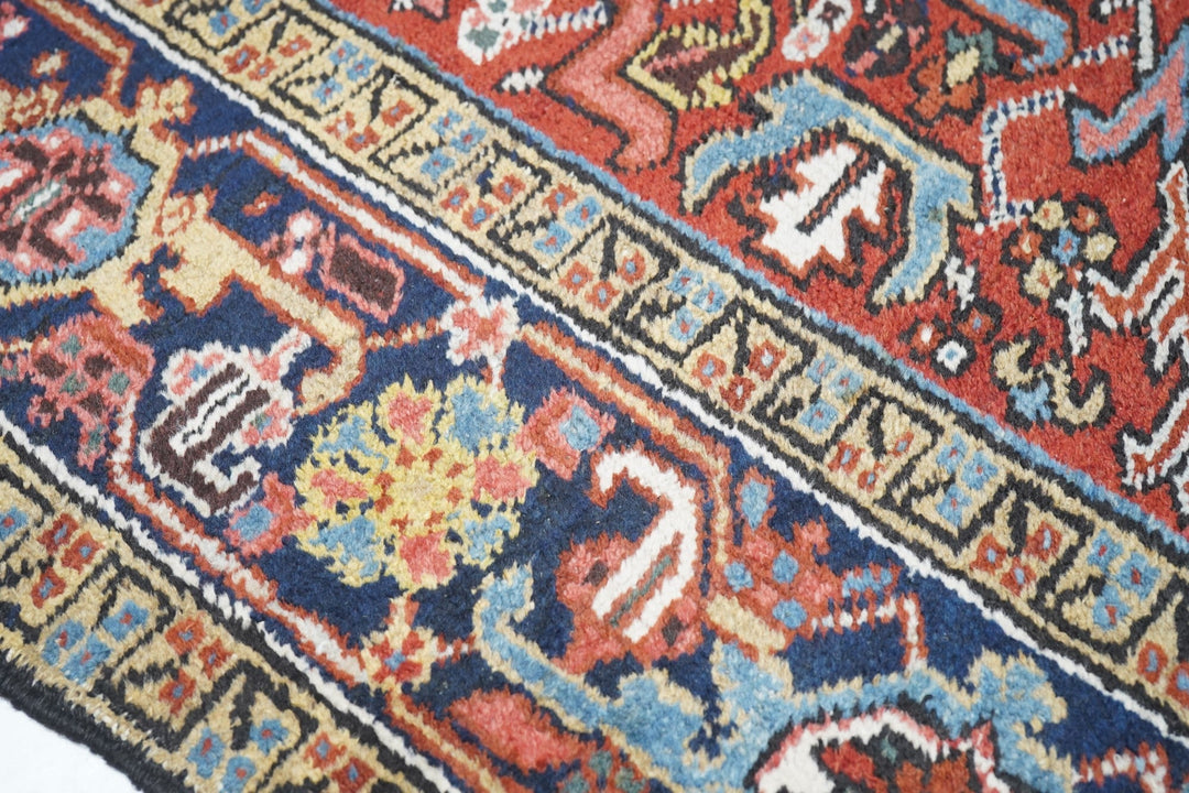 Red field, overall patterns with large barbed or fringed leaves and an under 7' by 10' size are characteristic of Mehriban/Heriz Interwar carpets. This example with a cotton foundation and medium-coarse weave is accented in cream, lemon, straw, green, light blue and brown-black. Near black border with reversing turtle palmettes. Good condition.
