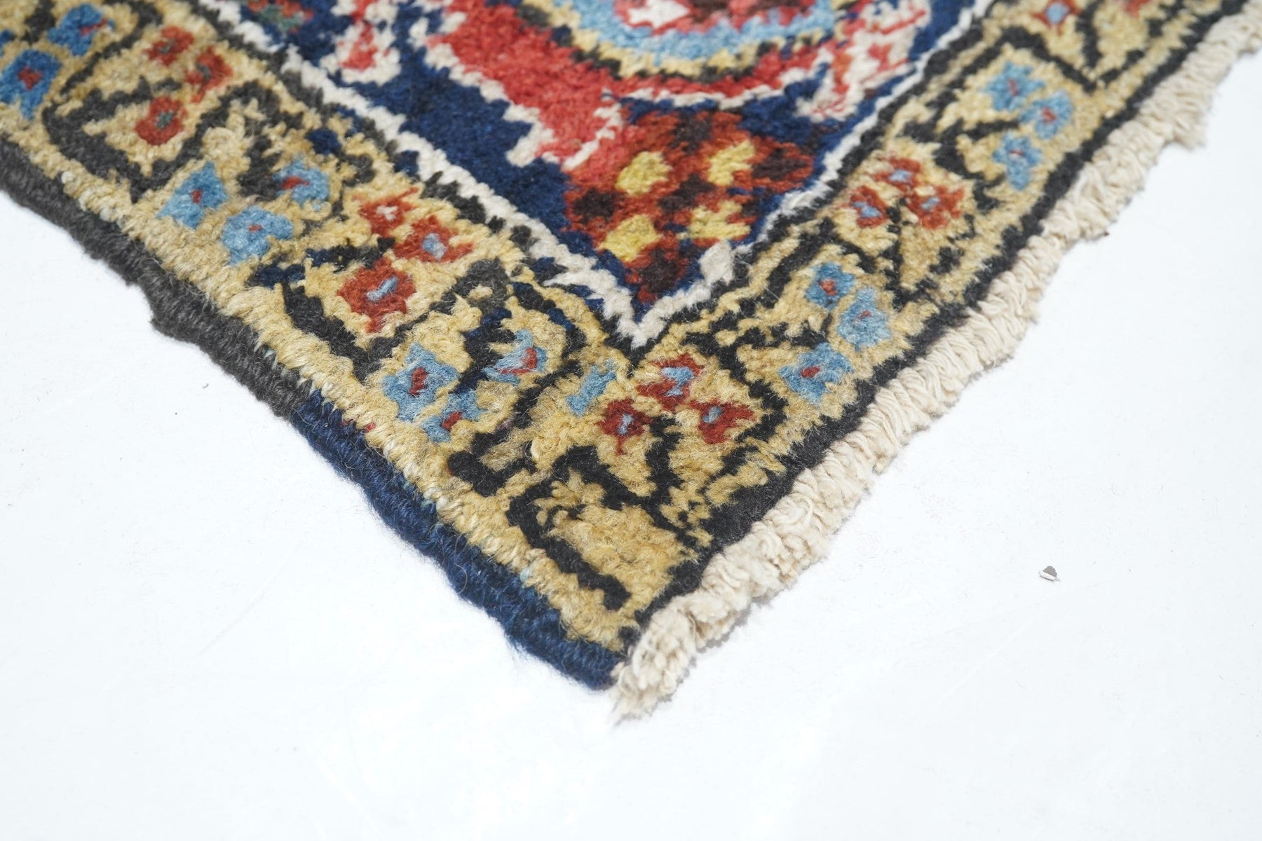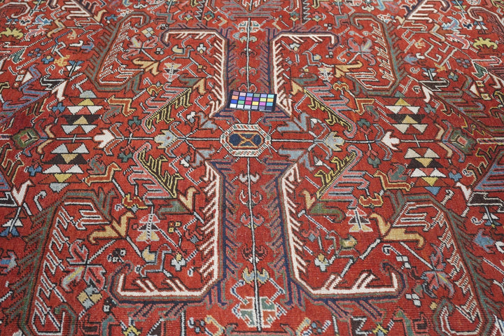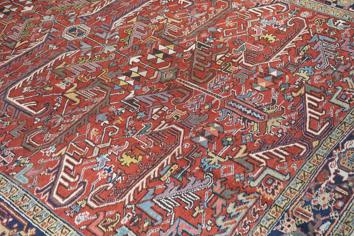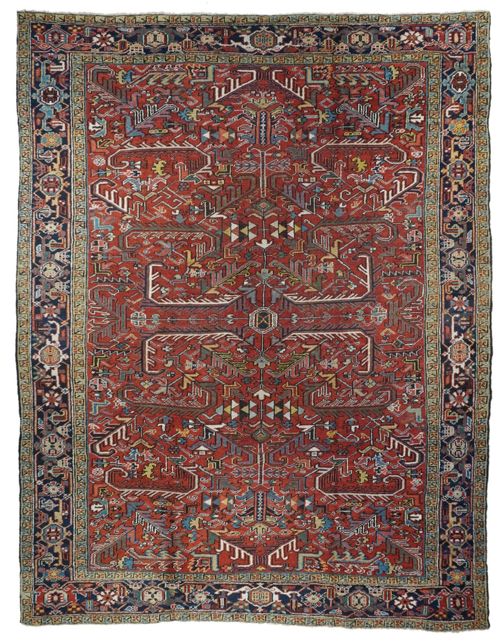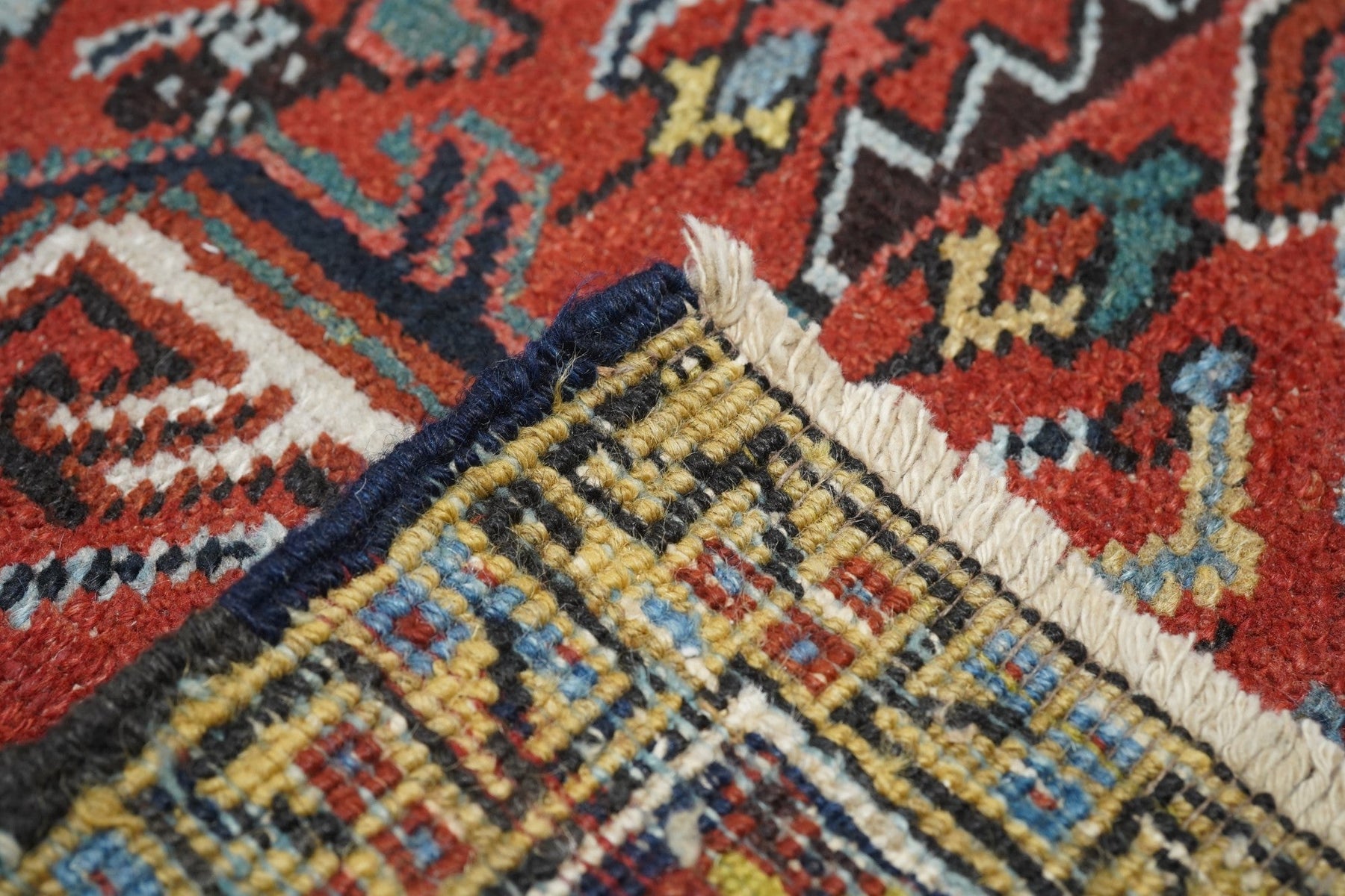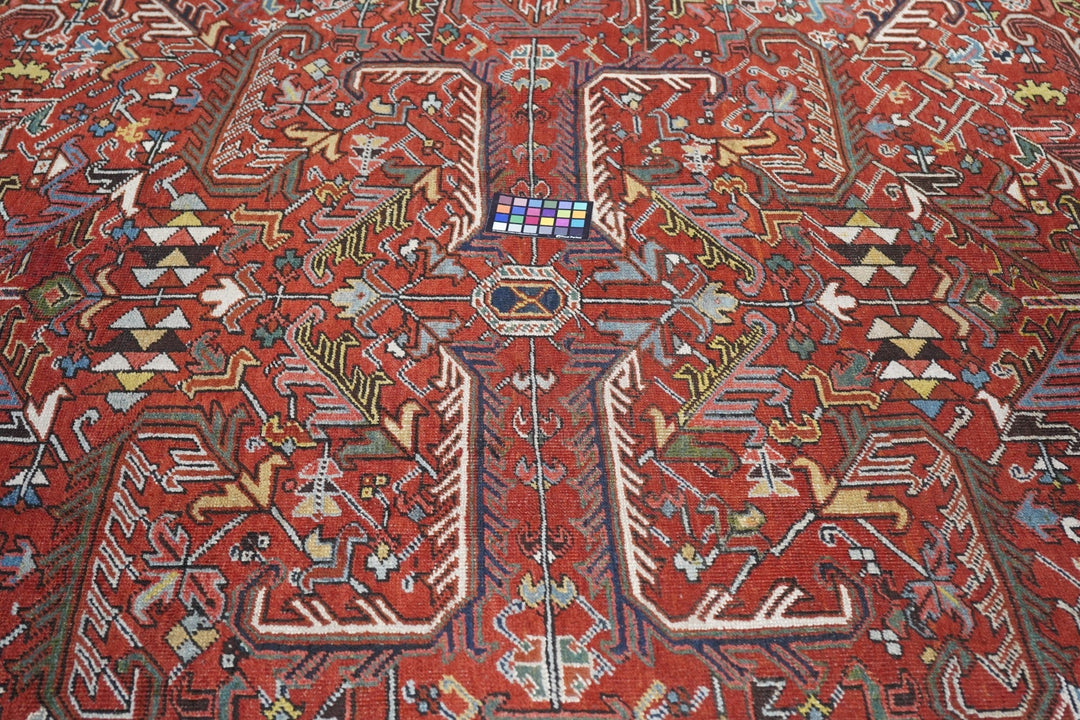 Red field, overall patterns with large barbed or fringed leaves and an under 7' by 10' size are characteristic of Mehriban/Heriz Interwar carpets. This example with a cotton foundation and medium-coarse weave is accented in cream, lemon, straw, green, light blue and brown-black. Near black border with reversing turtle palmettes. Good condition.