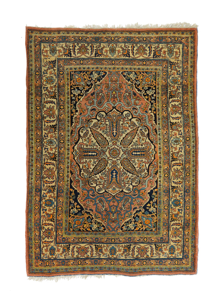 The cusp ivory medallion sports floriated double head botehs alternating with radiating barbed cypresses, on the rut-red boteh accented field, within navy flowering vine corners. Strip-style cream straw border with ragged palmettes and upright barbed slender leaves. Finely woven on cotton, brisk pile, in the classic "Haji Jalili" manner. The treatment of the medallion is especially attractive.