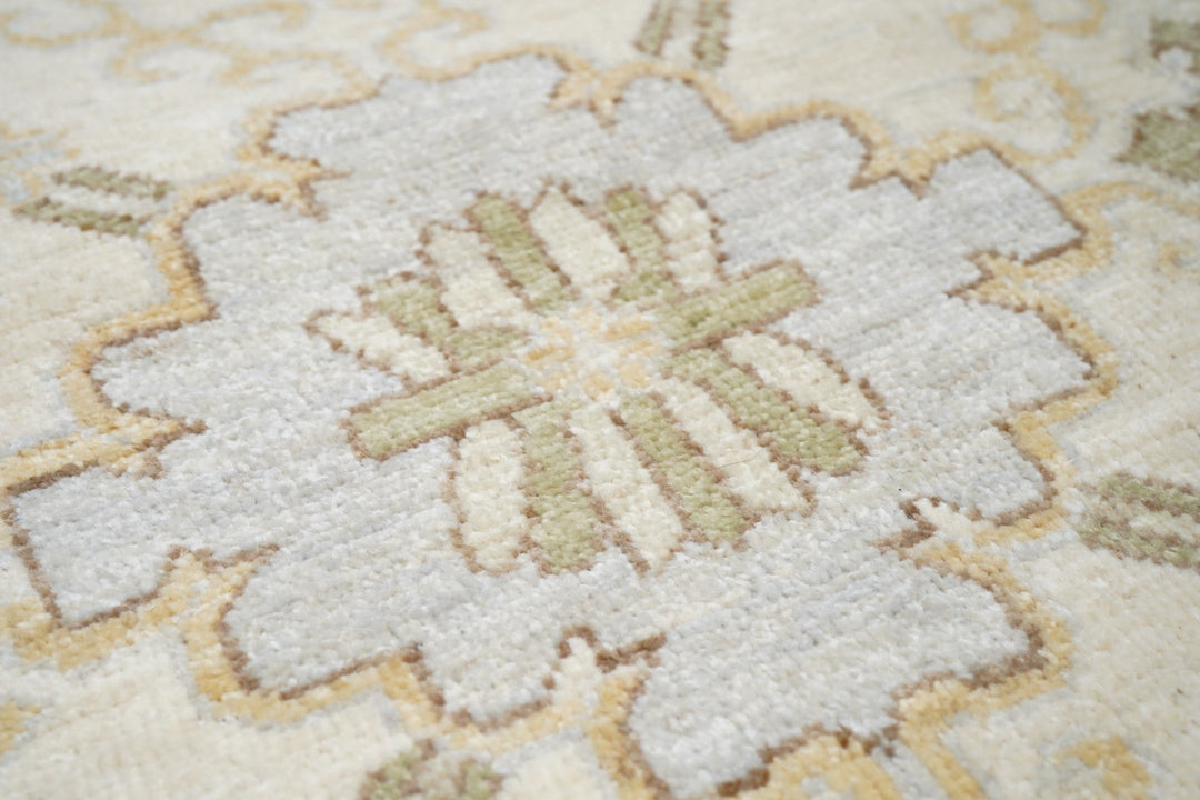 This northern Pakistani rug shows a sand field overlaid by a strong diamond lattice with two types of bosses, reminiscent of some Khotanese carpets. Powder blue main border with a peaked double meander. Medium weave, cotton foundation, reduced palette. As new condition.