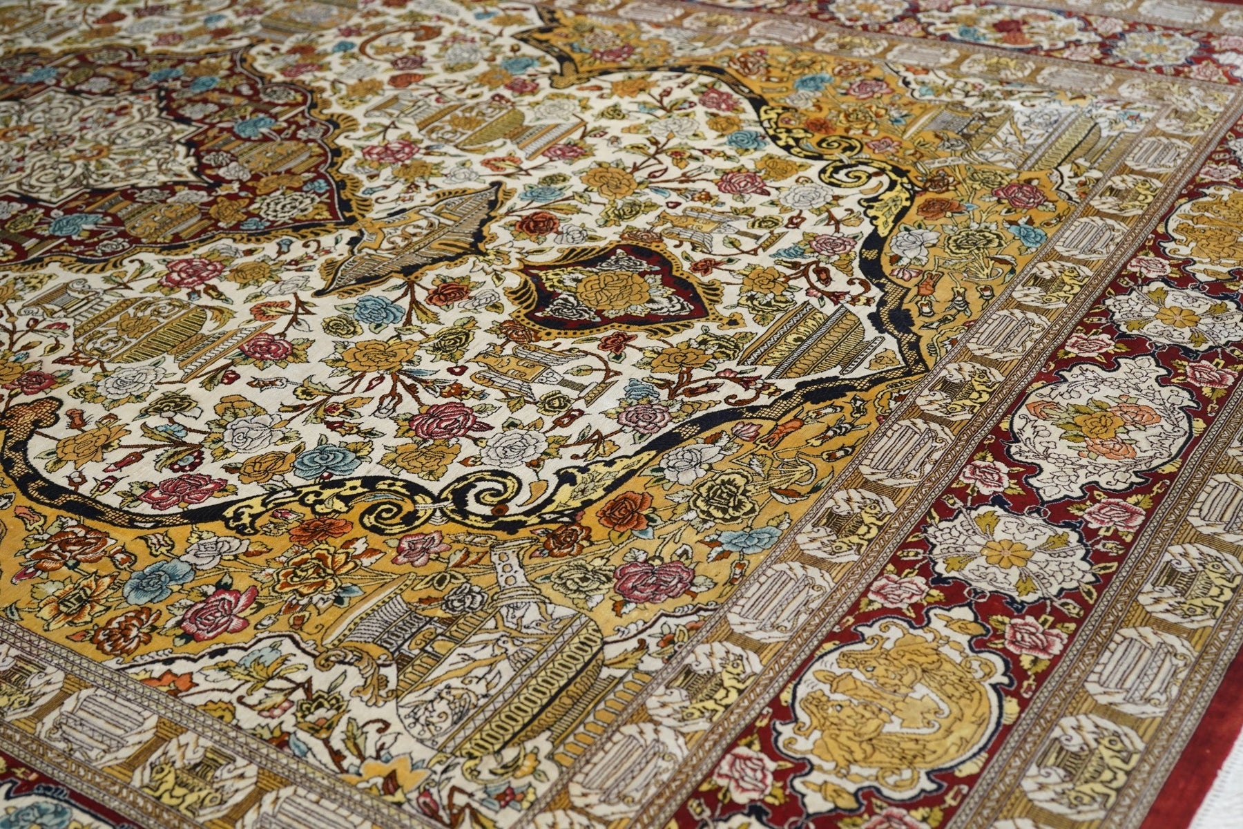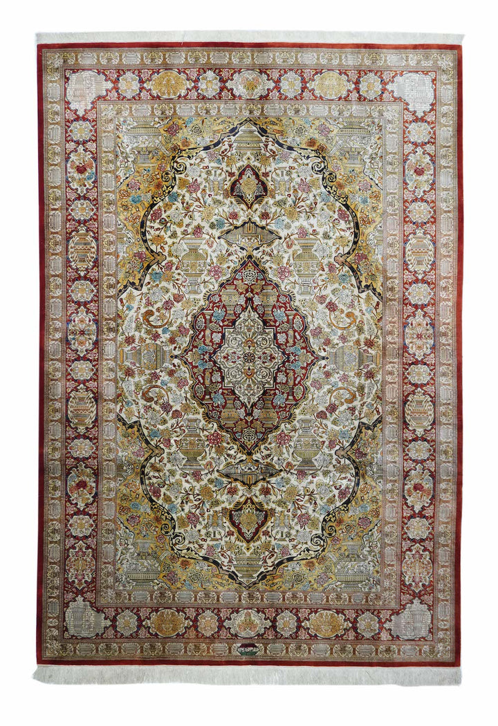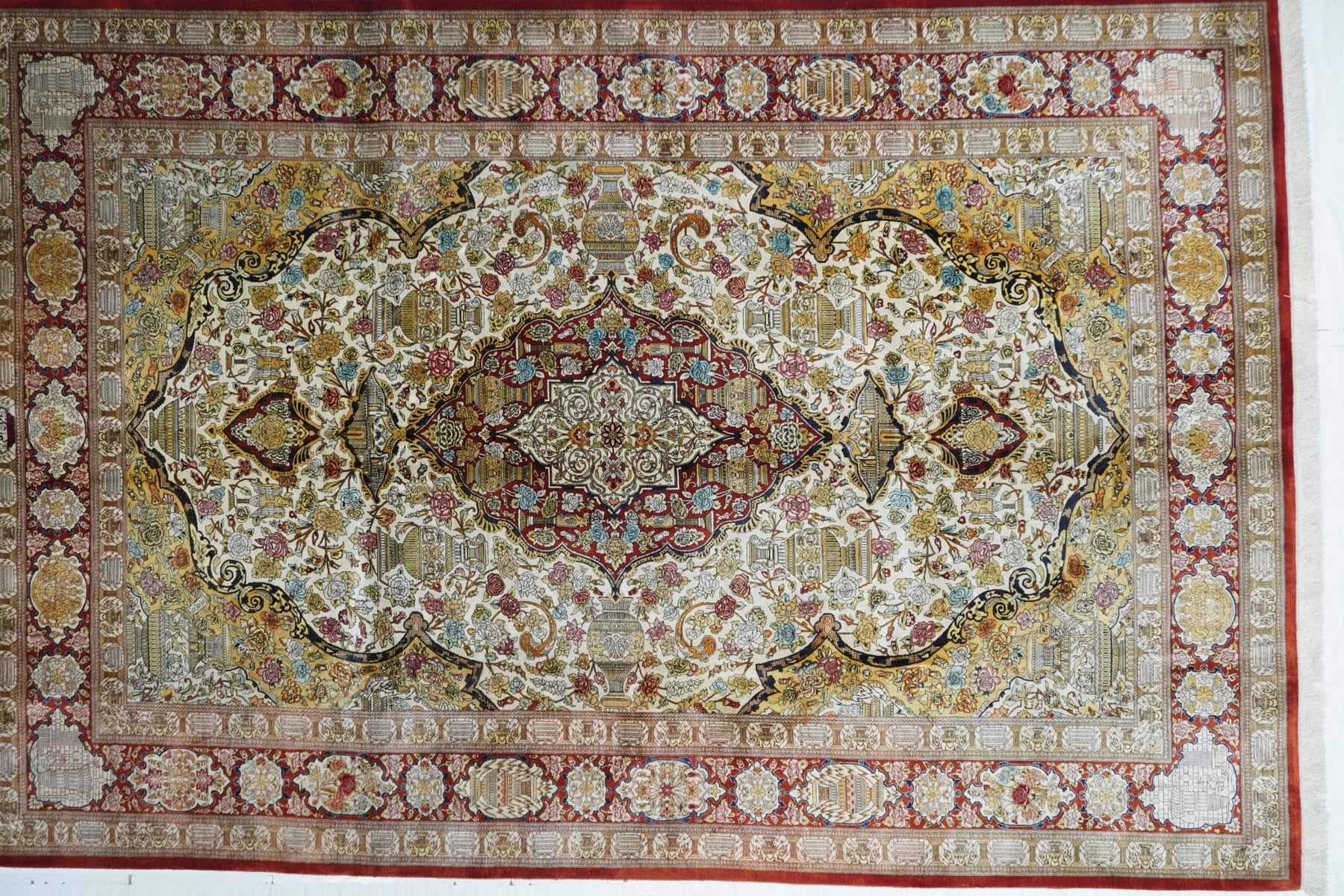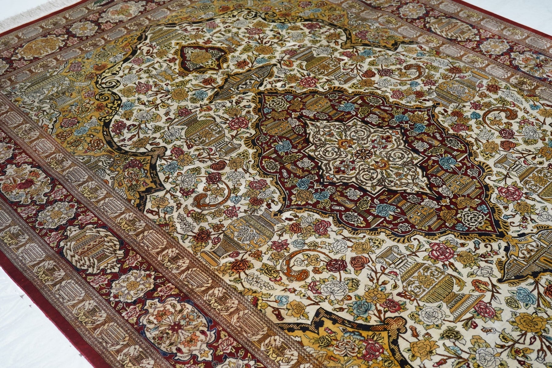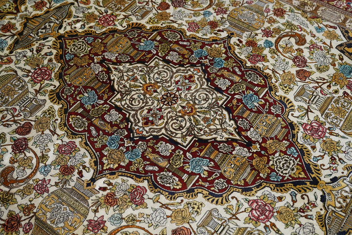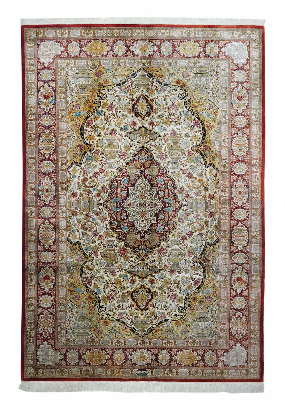 Vases everywhere! In the near black medallion. in the ecru field, in the ecru corners, and in the near black border. Otherwise this finely knotted, all silk pieces is much in the style of antique silk Kashans. The immediate pendants are scenic cartouches, and are followed by near black escutcheons enclosing colorful palmettes. The minor borders aldo feature vases and the bent main border cartouches show brickwork vignettes. Characteristic Persian size-format. New condition. Recent.