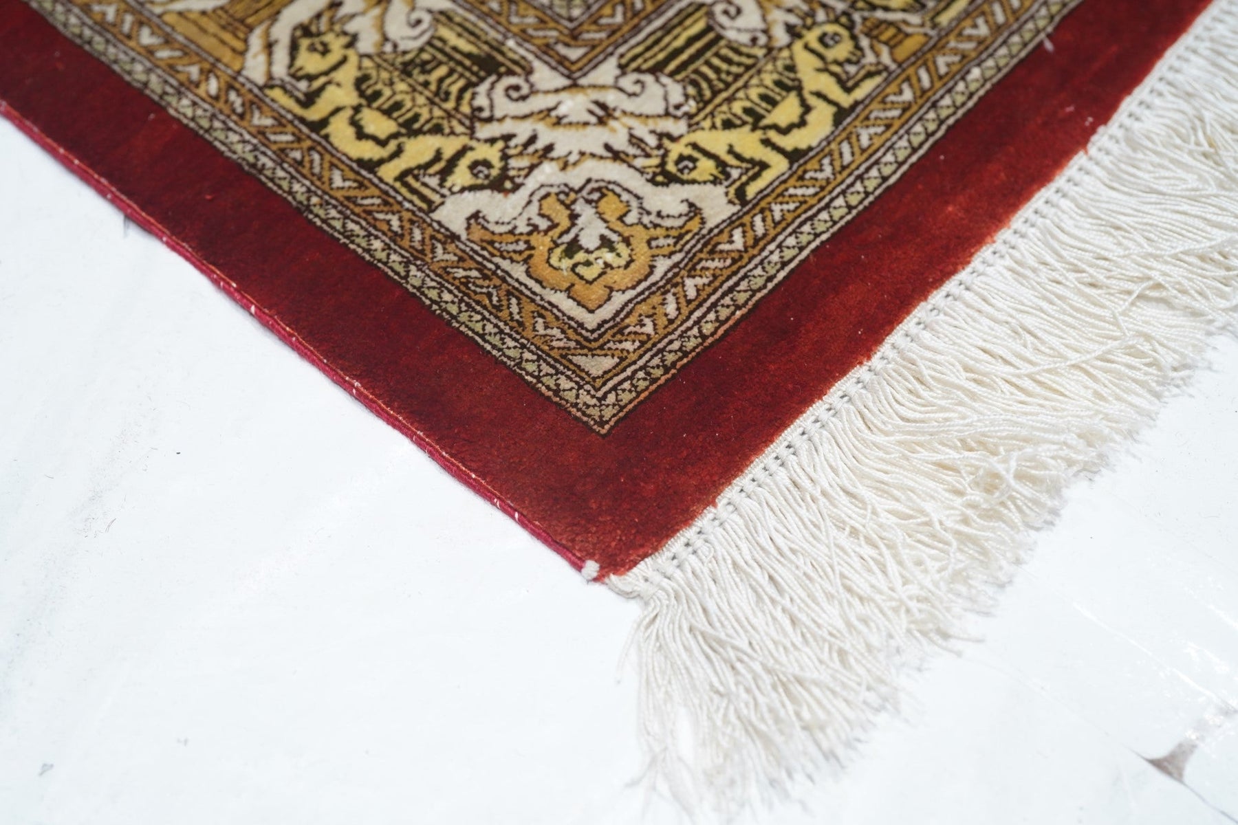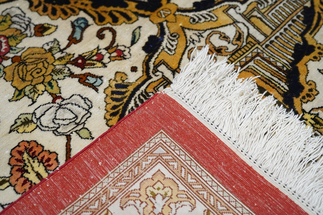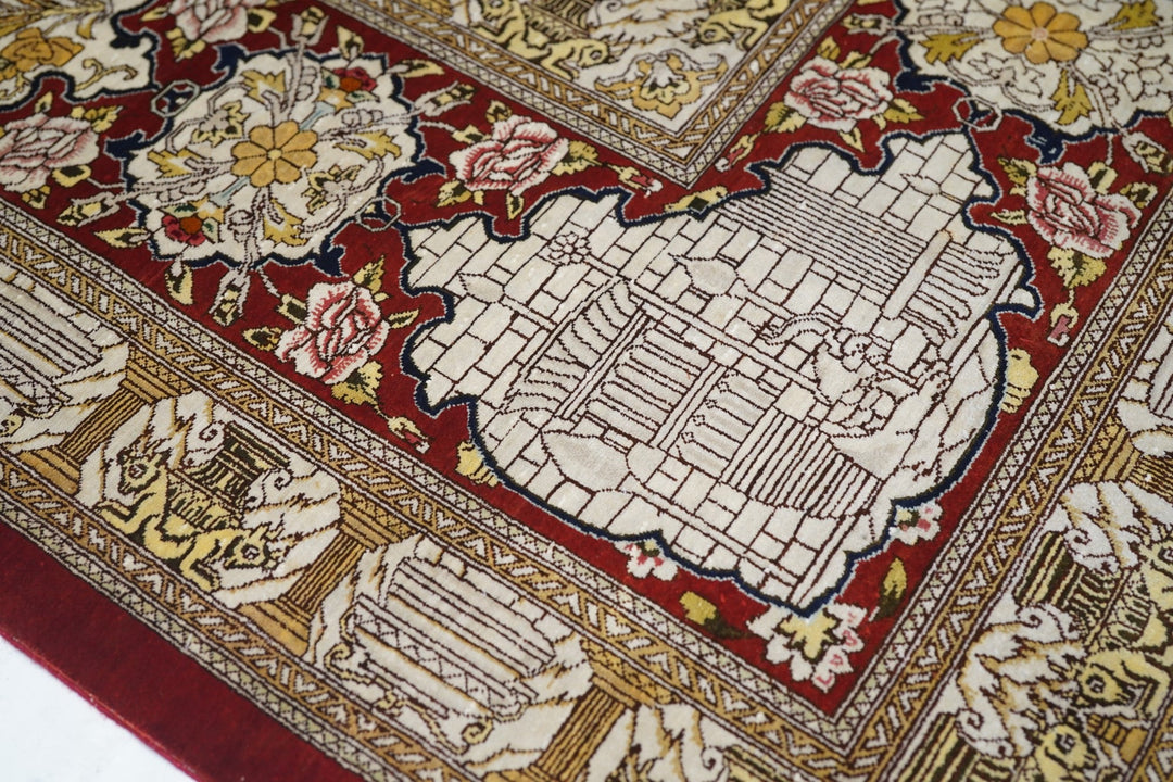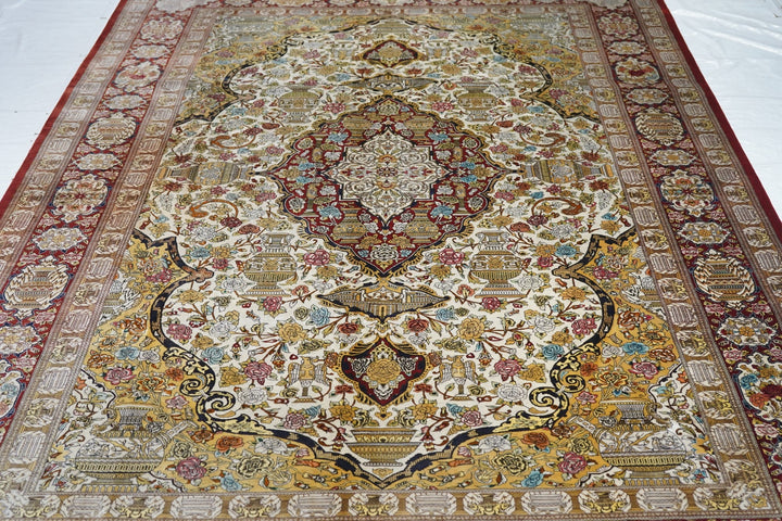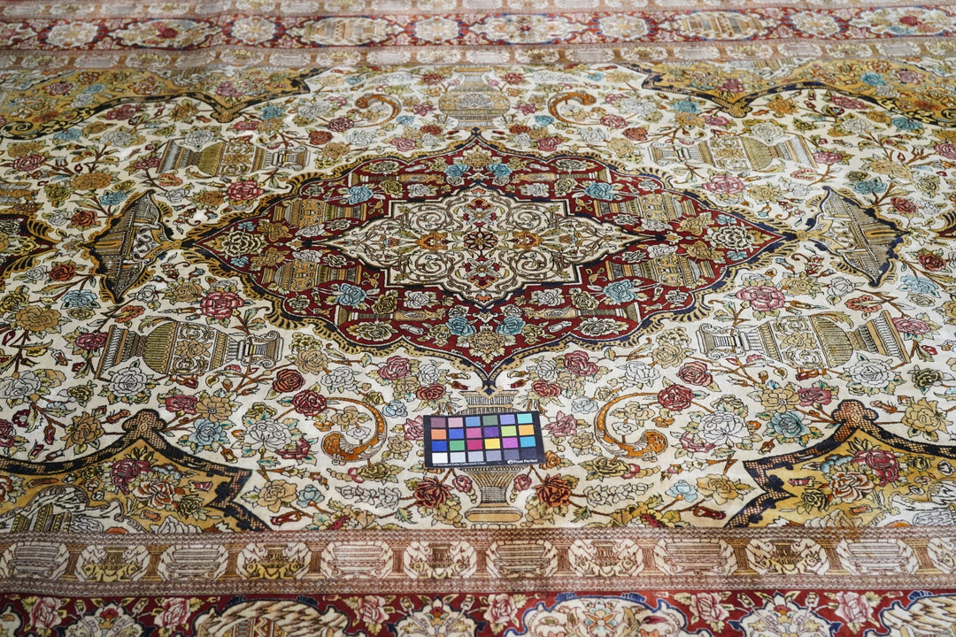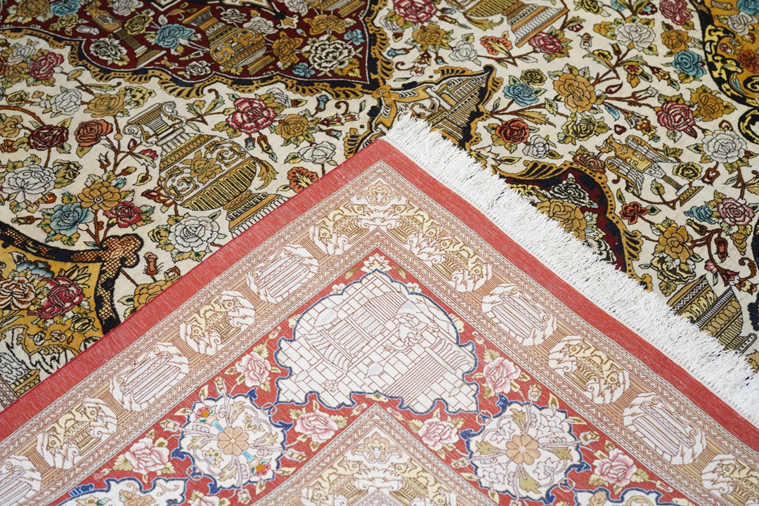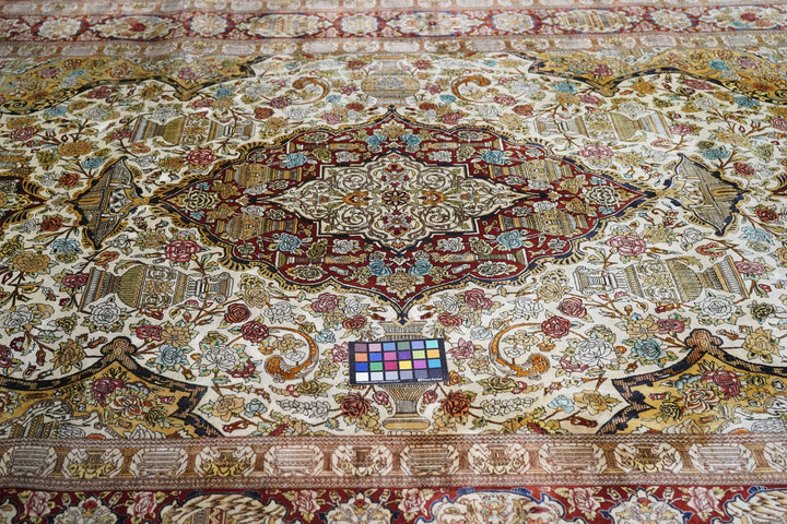 Vases everywhere! In the near black medallion. in the ecru field, in the ecru corners, and in the near black border. Otherwise this finely knotted, all silk pieces is much in the style of antique silk Kashans. The immediate pendants are scenic cartouches, and are followed by near black escutcheons enclosing colorful palmettes. The minor borders aldo feature vases and the bent main border cartouches show brickwork vignettes. Characteristic Persian size-format. New condition. Recent.