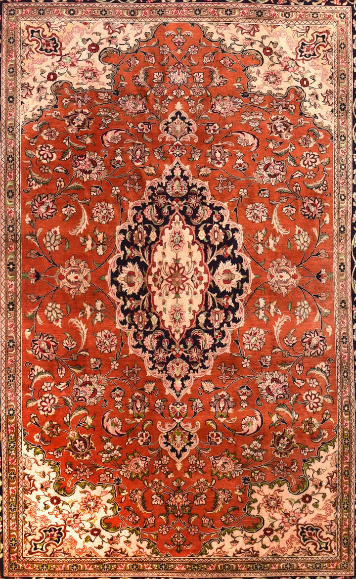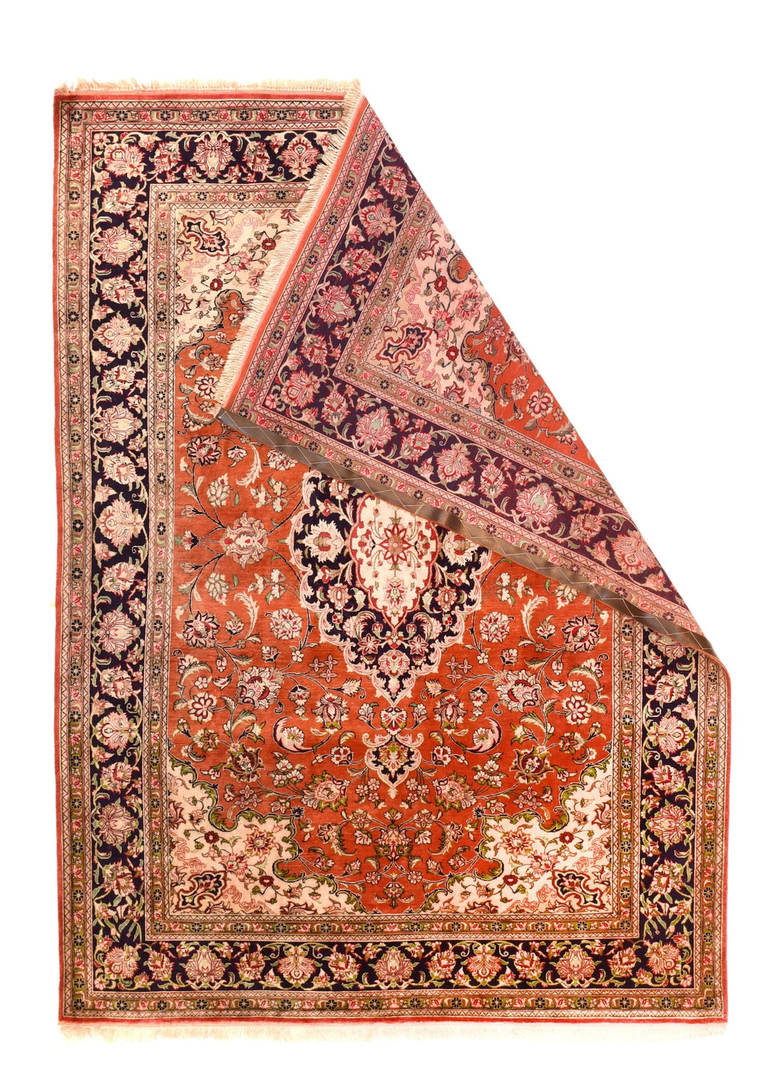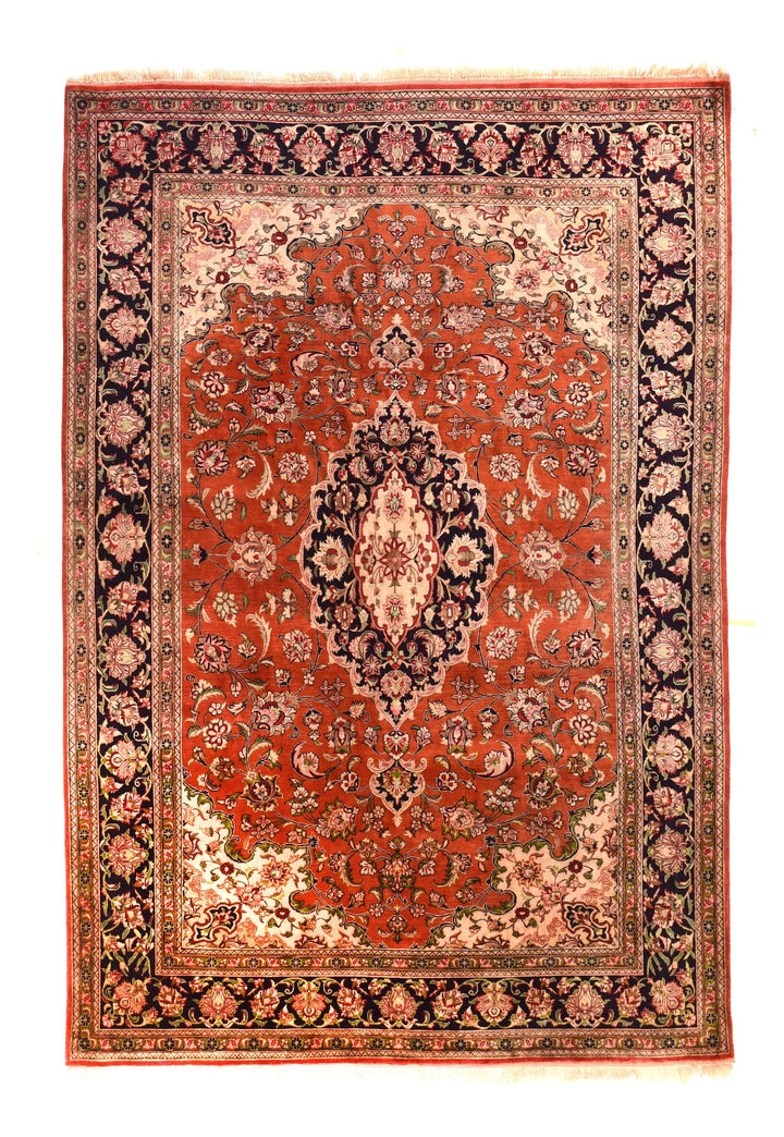 The warm almost deep rust red field of this central Persian, finely woven, city scatter shows a “Shah ‘Abbas” palmette and thin arabesque pattern flowing around a relatively small navy, medallion with pointed lobes, set off by ivory corners with projecting points, all within a navy main border of two types of upright and a single style of tilted palmettes. Fine (=Good) condition.