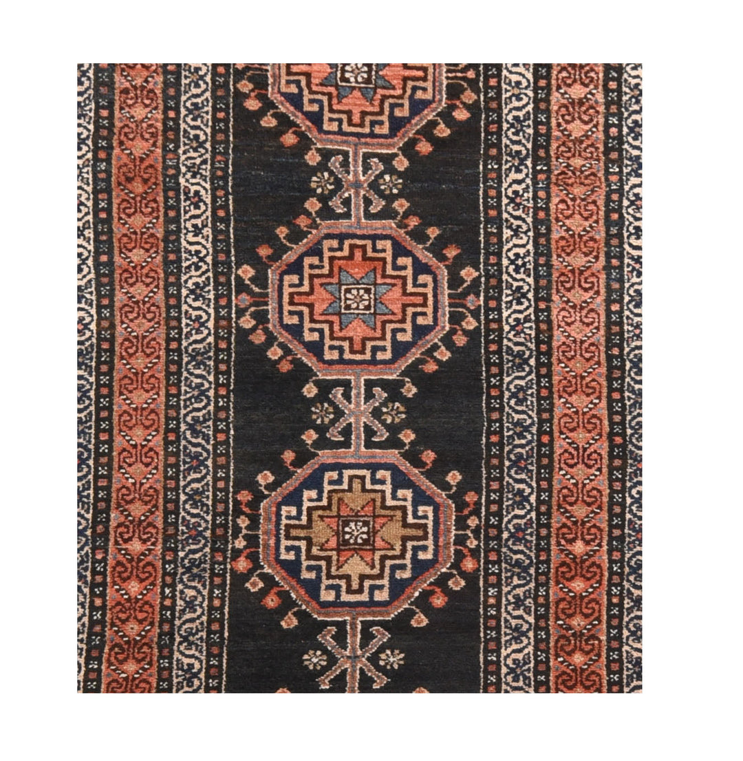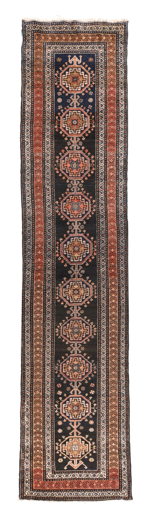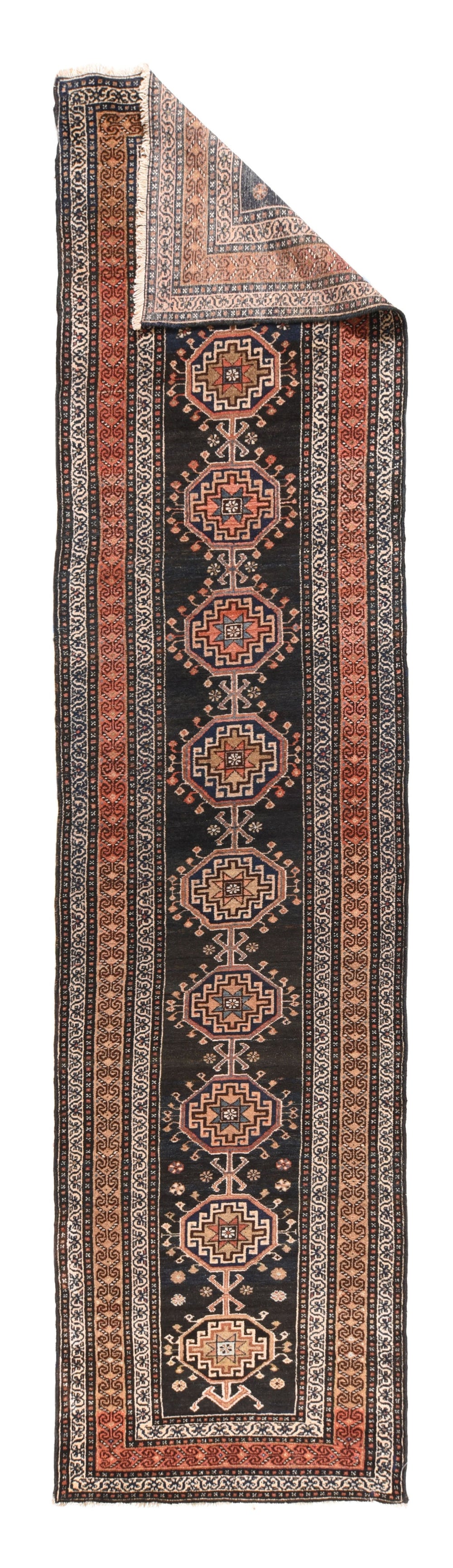 A near black field shows off the pole medallion of nine connected “Memling guls”, with attendant dots only near the field ends. Salmon main border with chain of volute arrowheads and cream minors with reversing winged palmettes. Cotton foundation, moderate weave. Good condition.