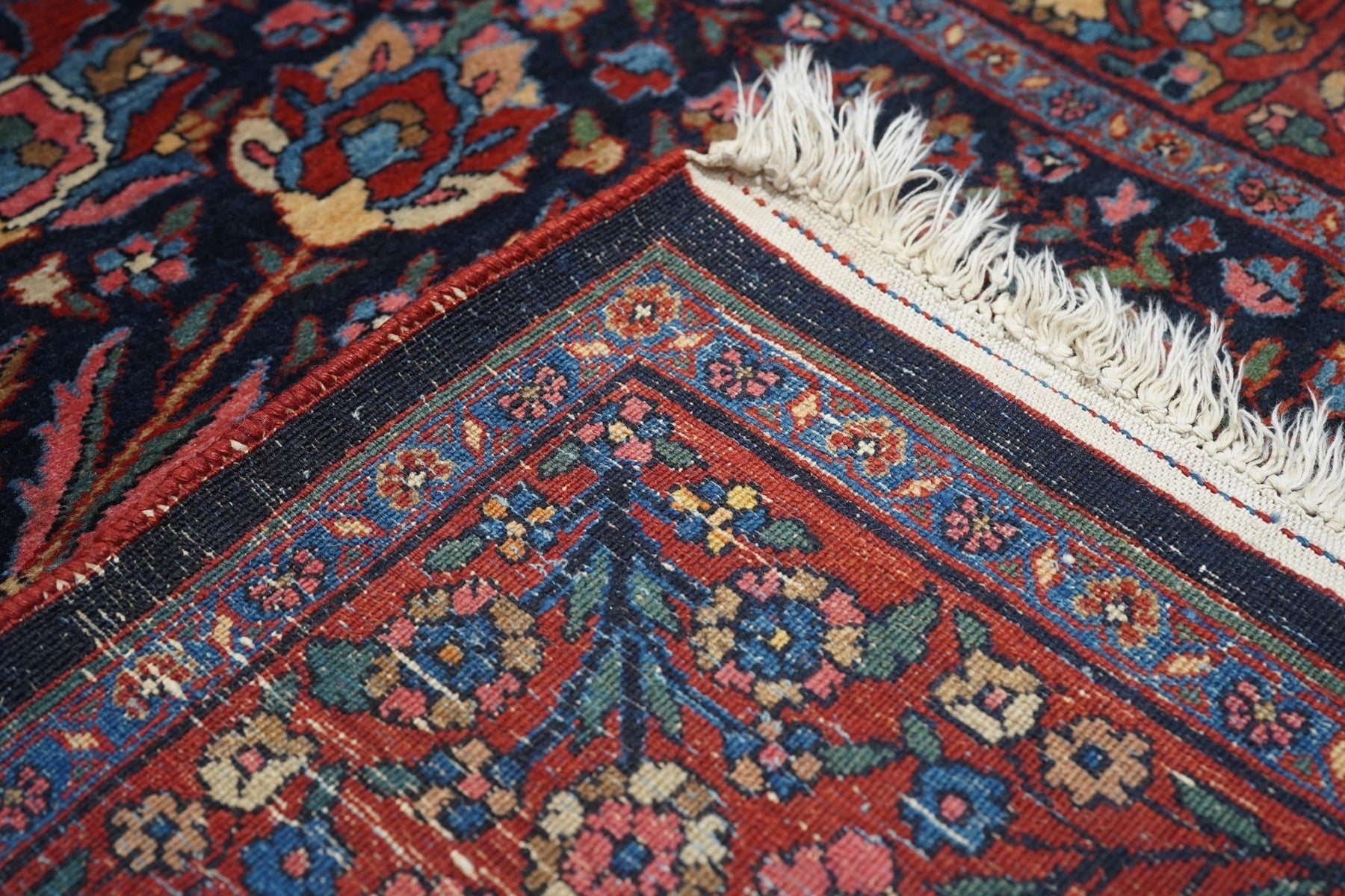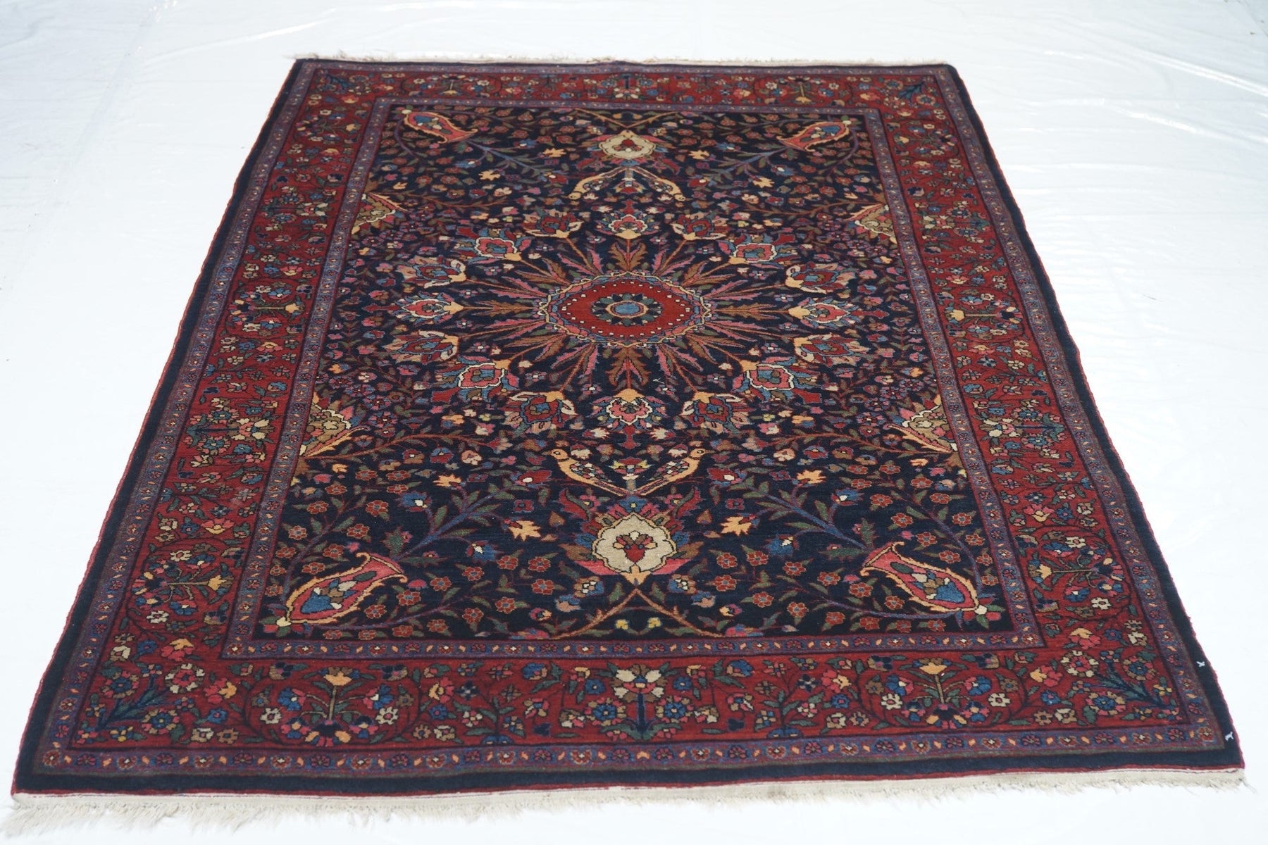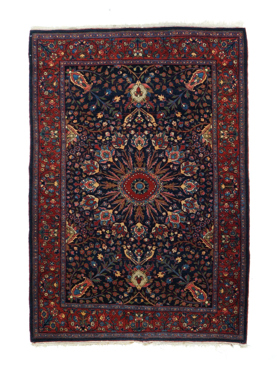 The town and surrounding Kurdish carpets of the eponym city, often in room or larger sizes. All wool before 1920, cotton warp afterward. Medallion and allover patterns. Heavy and compact. City weavers work from samplers (wagirehs). Village Bidjars are in scatter sizes, with more geometric patterns. Bidjar weaves range from moderate to very fine. Scatters yes, runners very few. Expensive, but incredibly long-wearing.