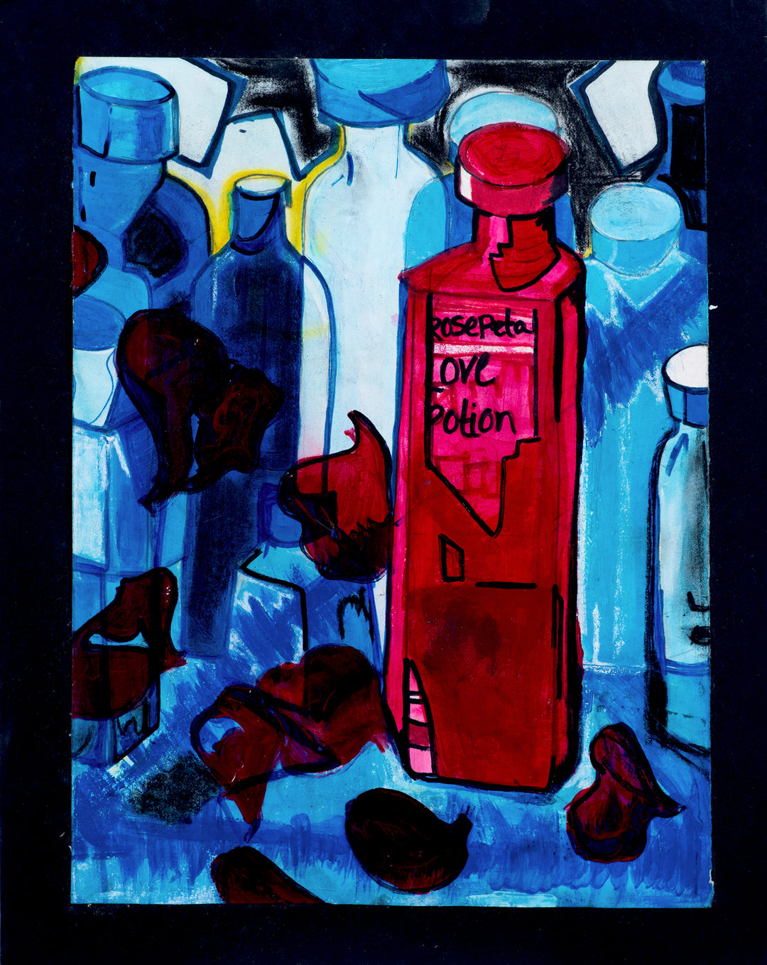 Rose Petal Love Potion. Painted in the teens. Gouache, and pastel on paper. 9' x 12' (22.5 x 30.5 cm).