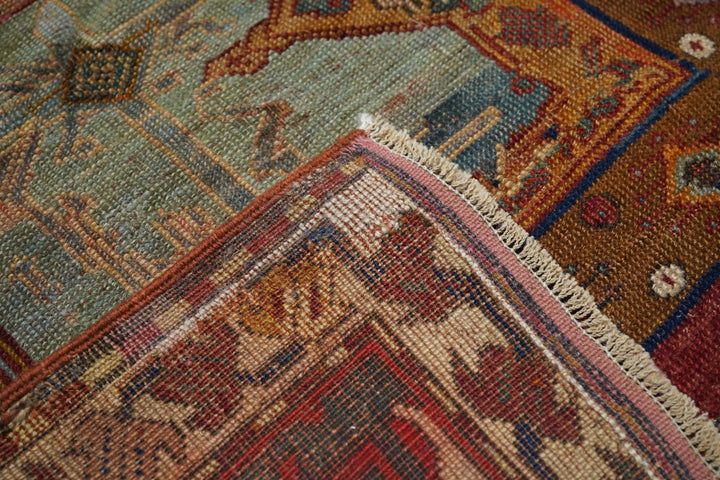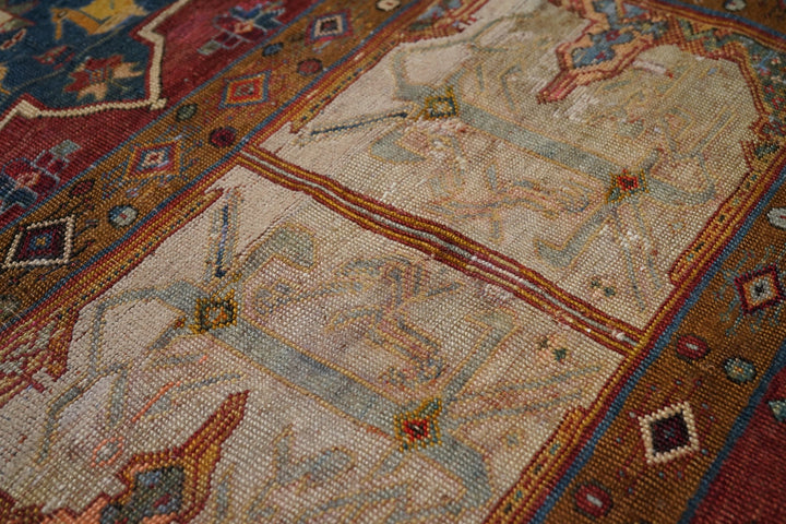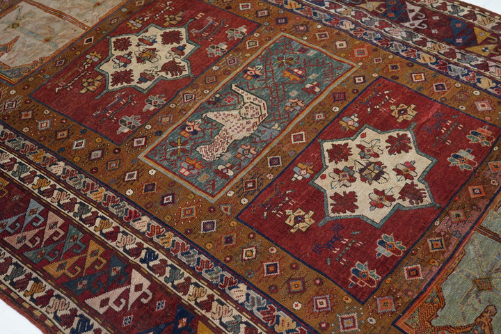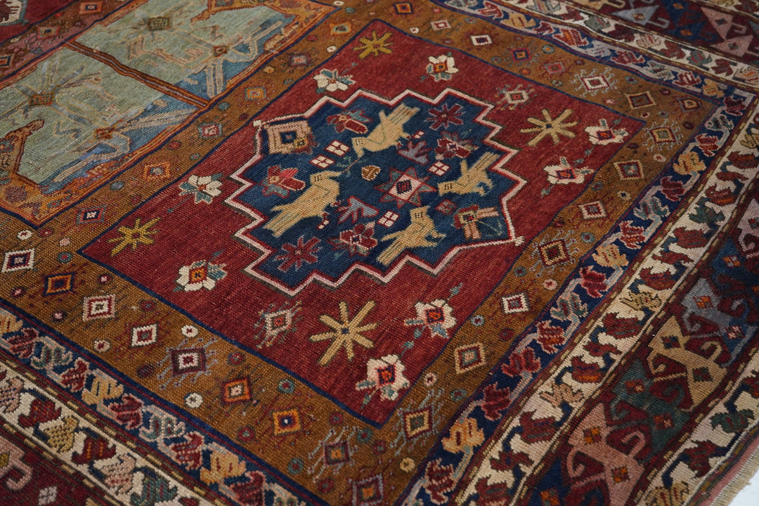 The tomato red field displays seven separate panels in dark red, green, navy, straw and beige. Birds in central green rectangle flanked by two panels with ivory octogramme stars Dark red border with variously colored "wedgie shoes". South Caucasian village work, wool foundation, moderate weave. Good condition.