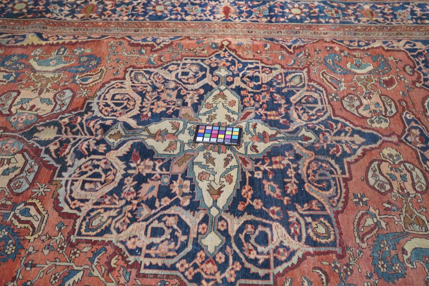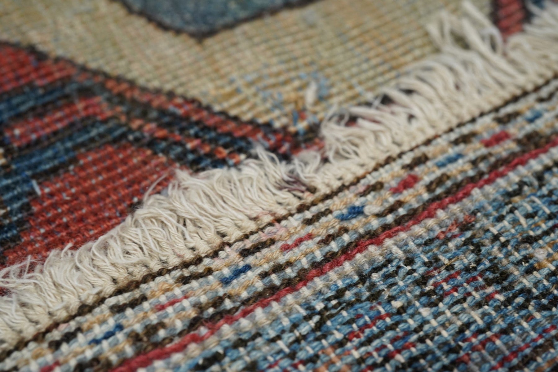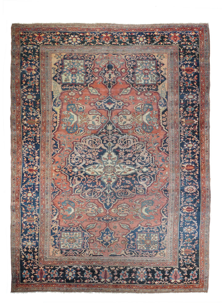 The well-woven village carpets from the Arak/Sultanabad area, especially the red field/navy border, detached floral spray pattern “American Sarouks” of the 1920-1970 period. Robust and leathery, on cotton. Recent examples show medallions and classic allover patterns. Best Sarouks are reputed to be Mohajerans. Moderate to medium priced.