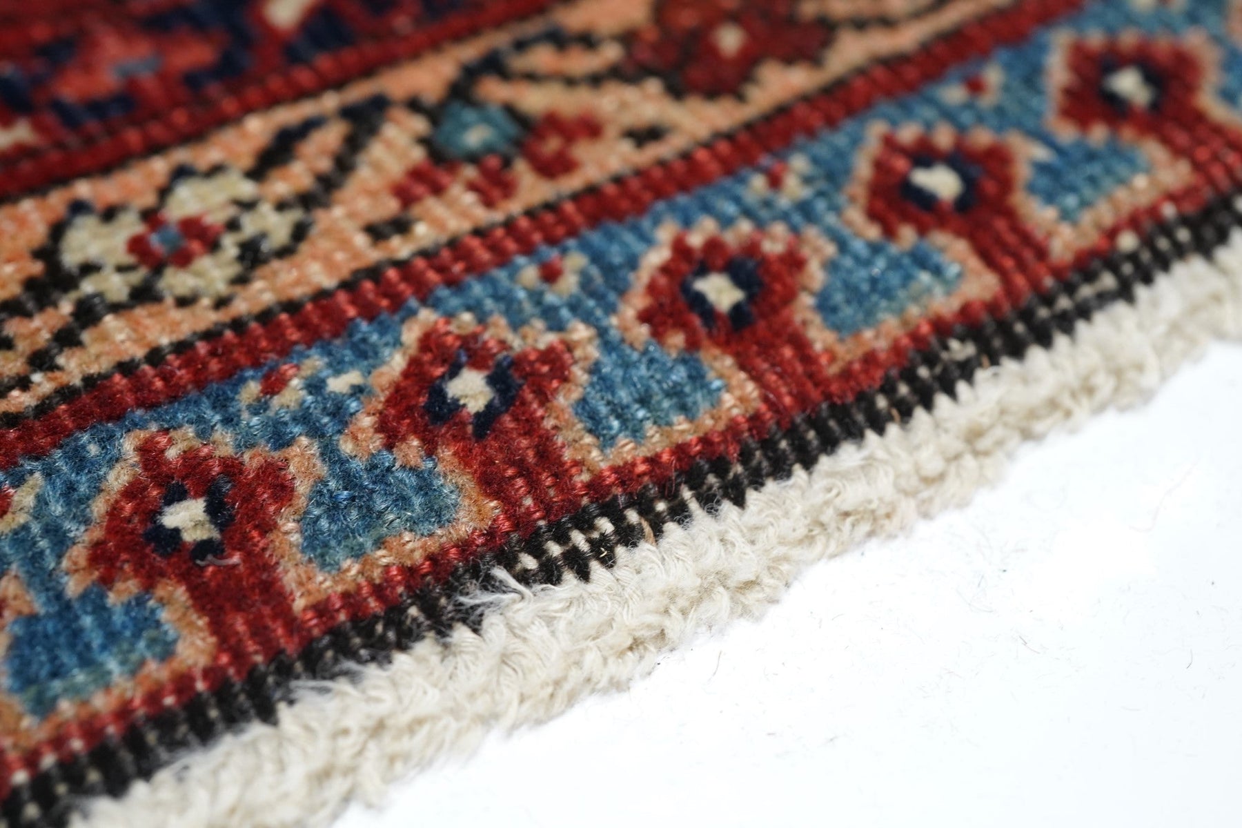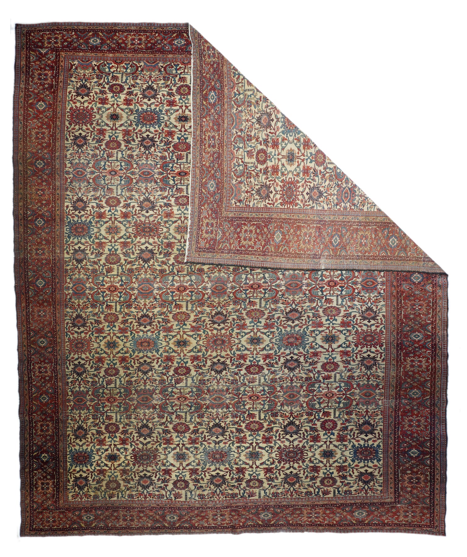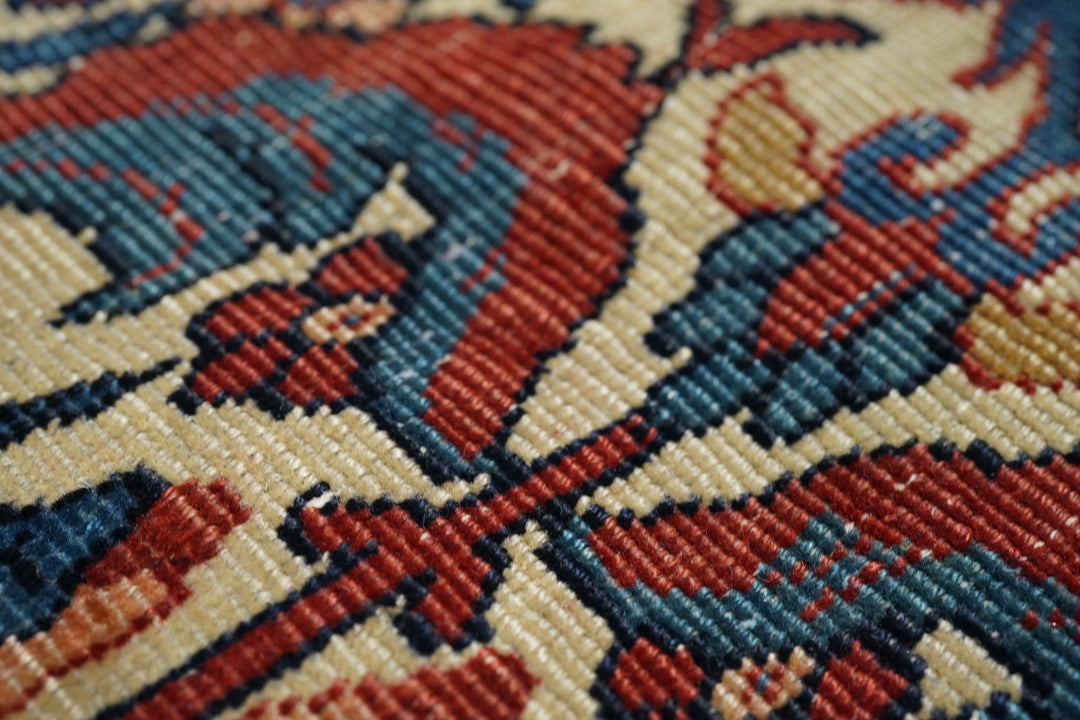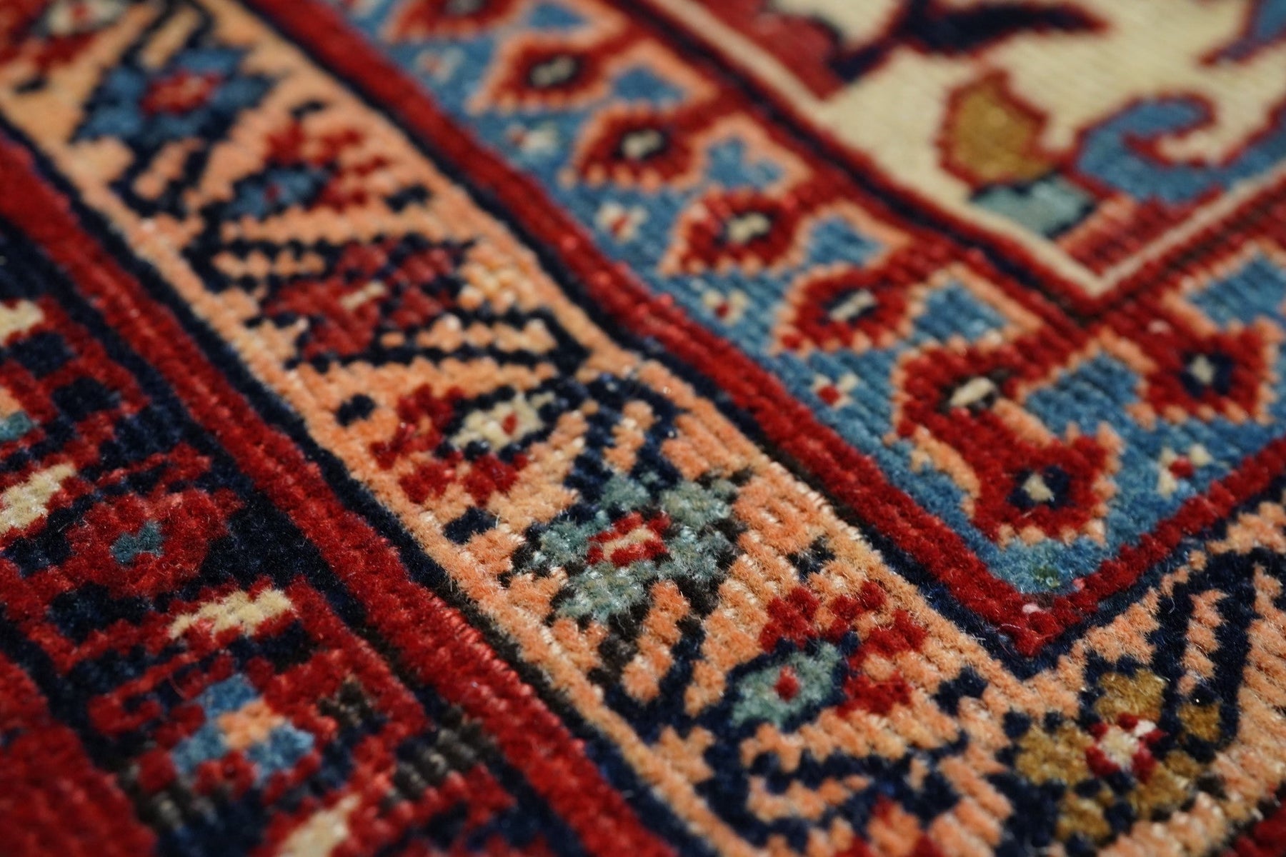 The well-woven village carpets from the Arak/Sultanabad area, especially the red field/navy border, detached floral spray pattern “American Sarouks” of the 1920-1970 period. Robust and leathery, on cotton. Recent examples show medallions and classic allover patterns. Best Sarouks are reputed to be Mohajerans. Moderate to medium priced.