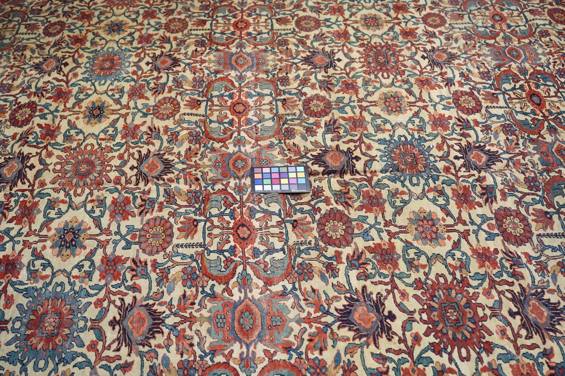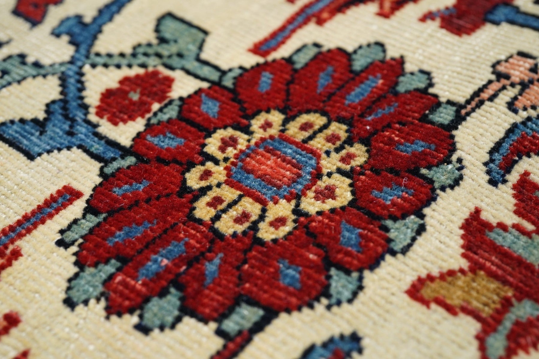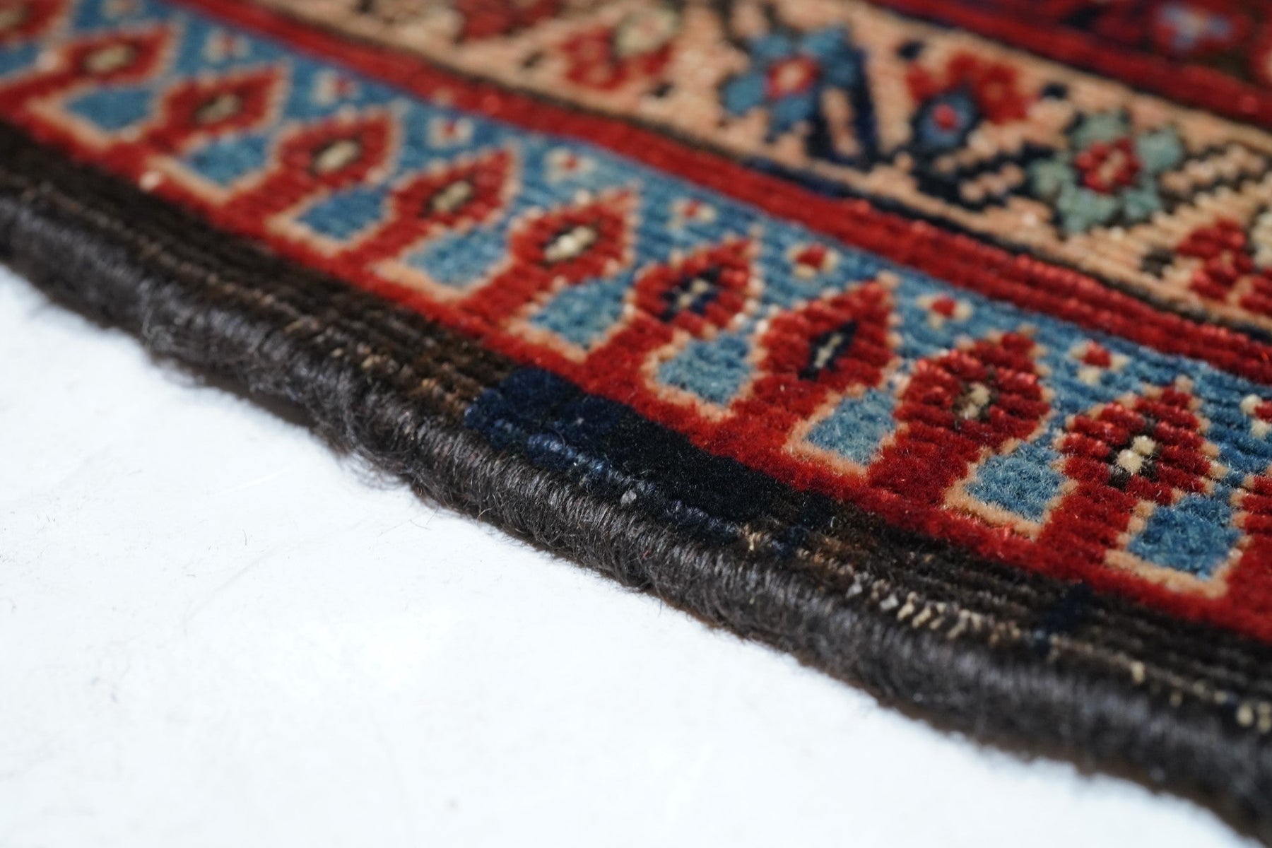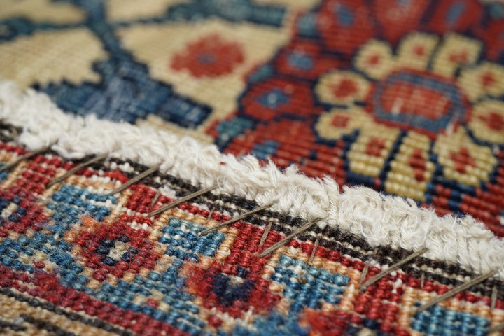 The well-woven village carpets from the Arak/Sultanabad area, especially the red field/navy border, detached floral spray pattern “American Sarouks” of the 1920-1970 period. Robust and leathery, on cotton. Recent examples show medallions and classic allover patterns. Best Sarouks are reputed to be Mohajerans. Moderate to medium priced.