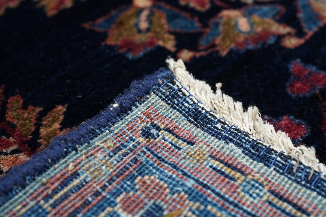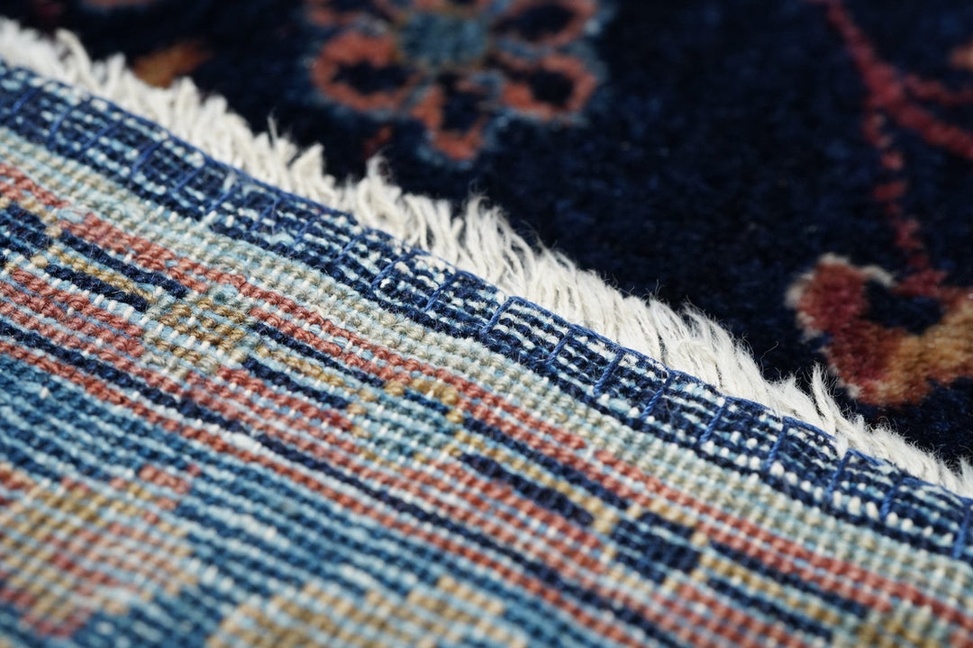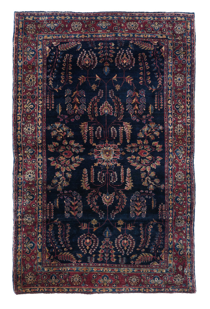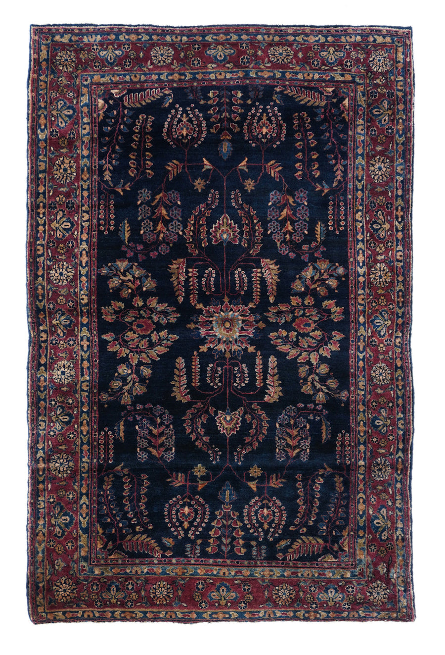 The well-woven village carpets from the Arak/Sultanabad area, especially the red field/navy border, detached floral spray pattern “American Sarouks” of the 1920-1970 period. Robust and leathery, on cotton. Recent examples show medallions and classic allover patterns. Best Sarouks are reputed to be Mohajerans. Moderate to medium priced.