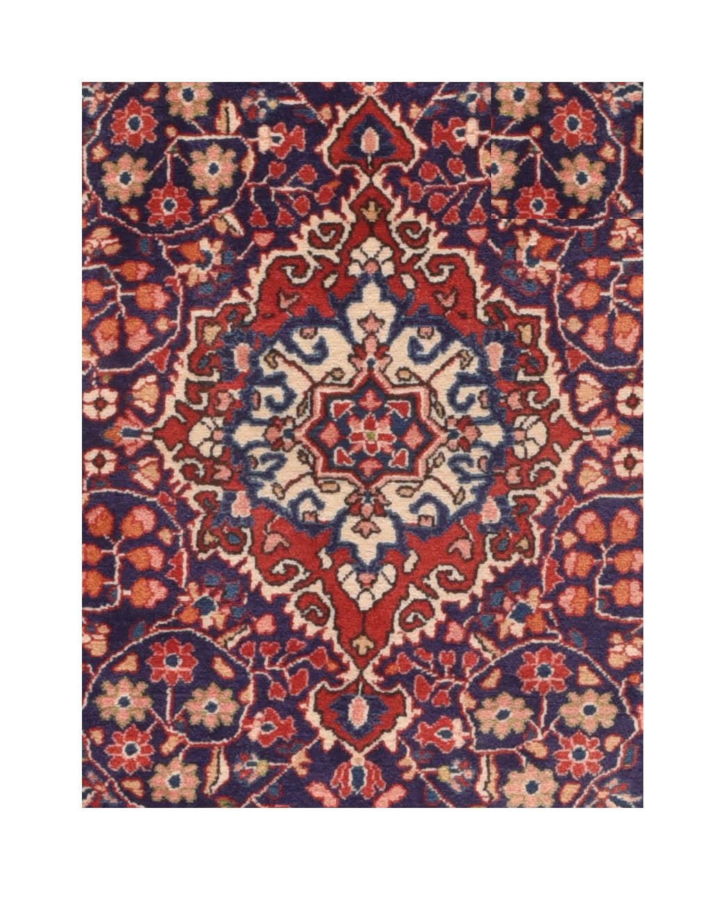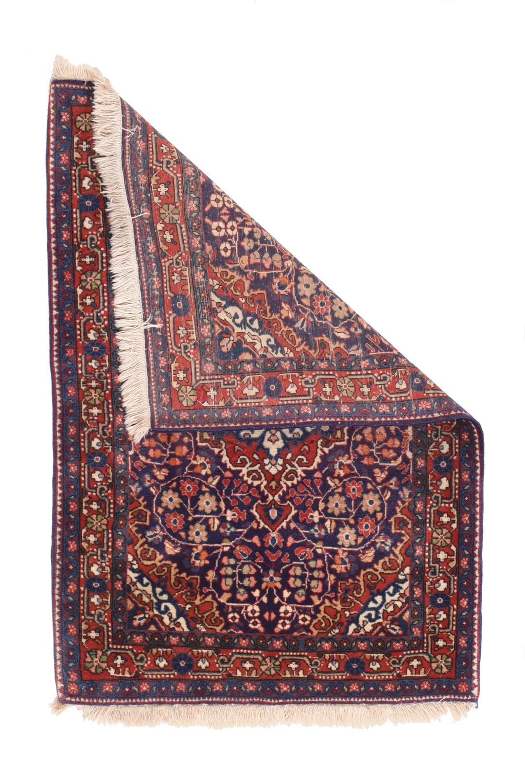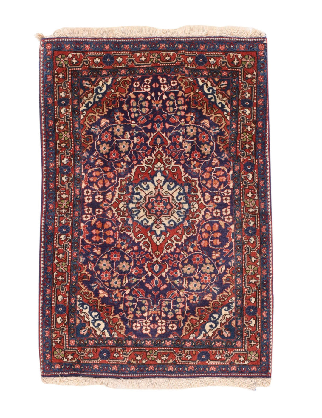 This well-woven small scatter is woven in or around the village of Jozan, between the Hamadan and Arak weaving areas. The royal blue field shows a pendanted, curly-hooked red medallion with barbed ecru acanthus edge. En suite corners with camel-straw edges. Wiry islimis (spiral vines) surround colorful buds and flowers. Characteristic red border with twisted and dotted meander. Leathery texture. Good condition.