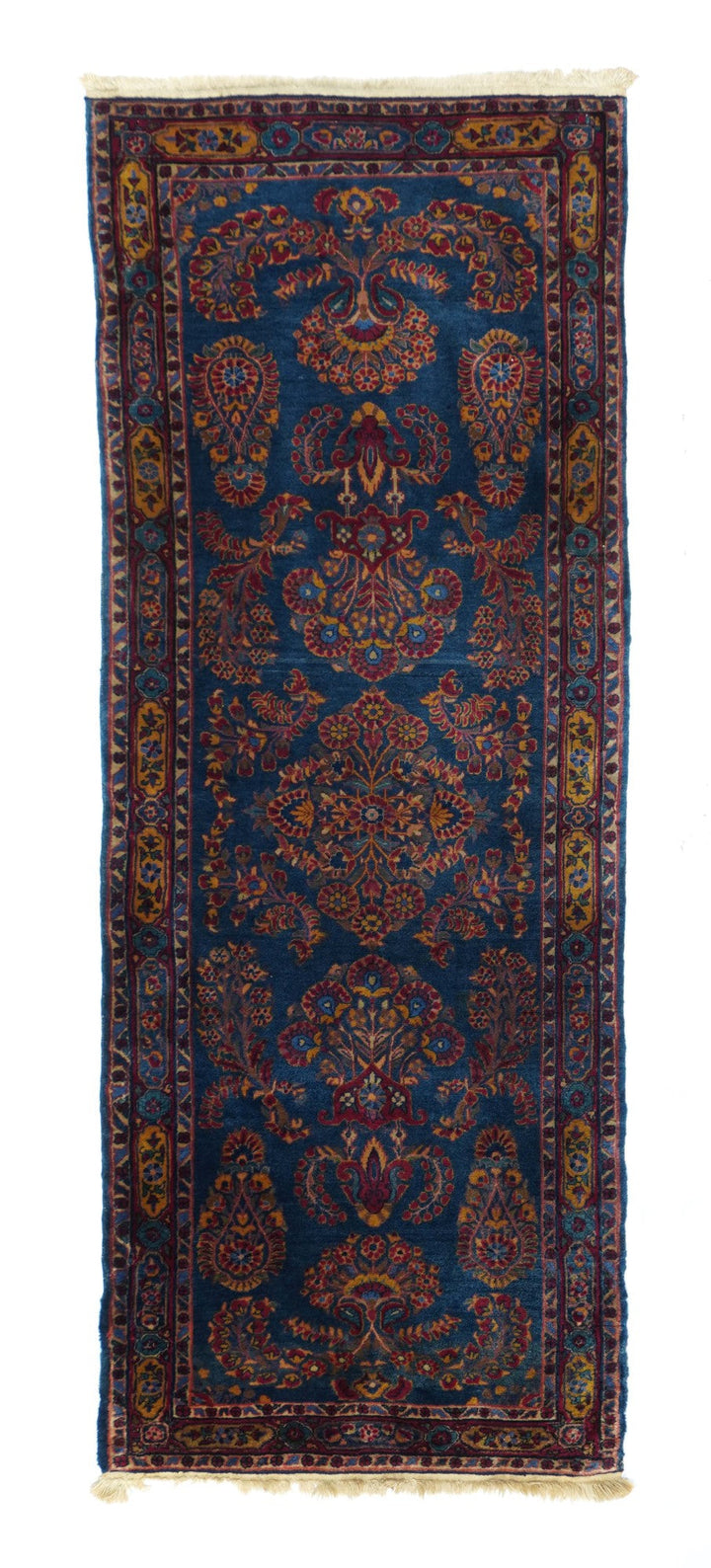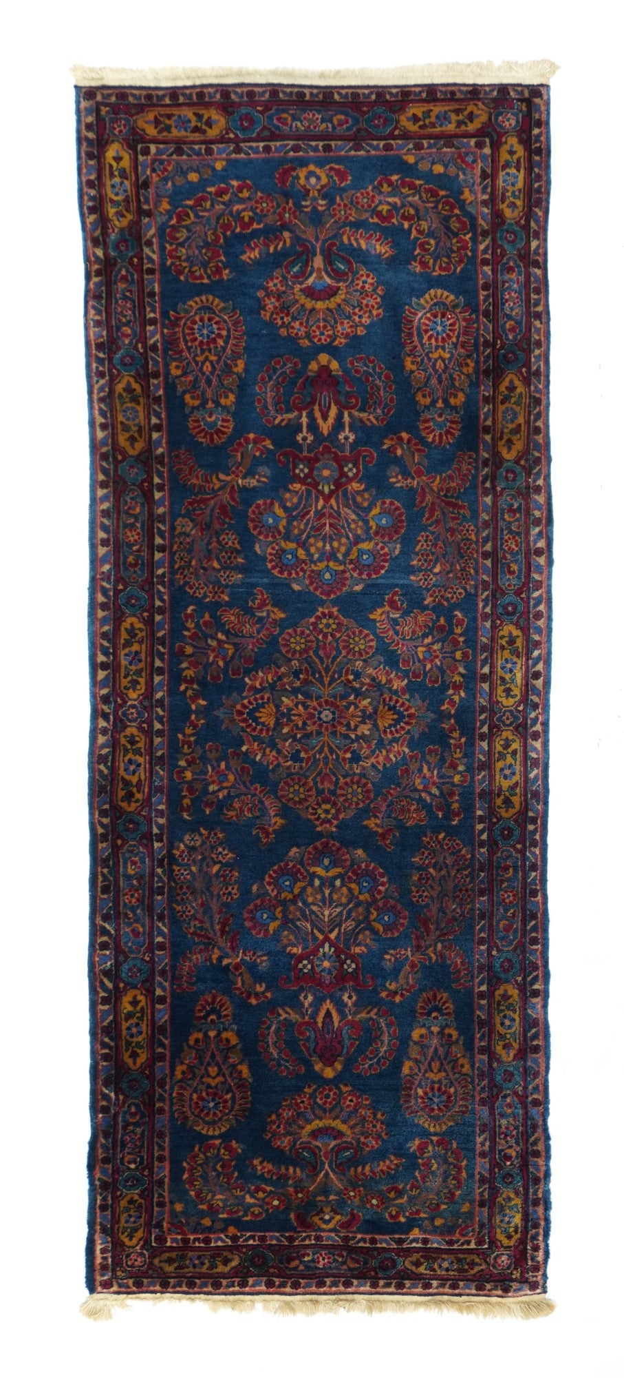 This west Persian village piece shows an unusual abrashed royal blue field adorned with the detached floral spray pattern common to interwar "American style" Sarouks. Details in straw and shades of blue. Narrow red border with elongated cartouches. Leathery and robust texture. Good condition, well-woven.