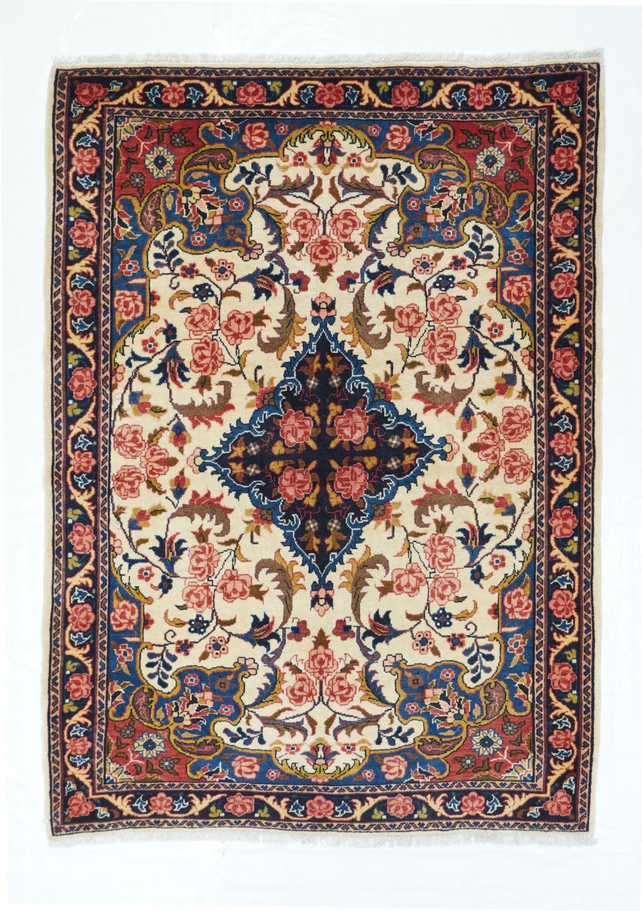 The well-woven village carpets from the Arak/Sultanabad area, especially the red field/navy border, detached floral spray pattern “American Sarouks” of the 1920-1970 period. Robust and leathery, on cotton. Recent examples show medallions and classic allover patterns. Best Sarouks are reputed to be Mohajerans. Moderate to medium priced.