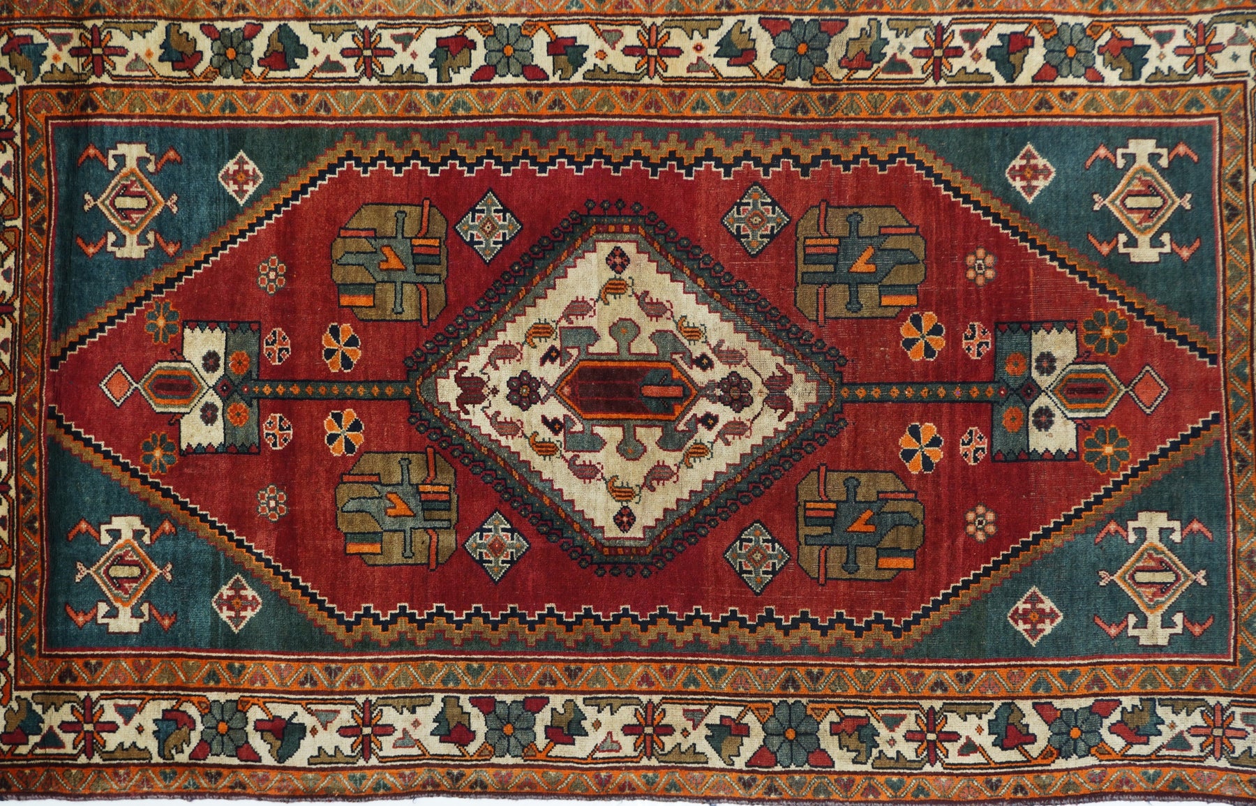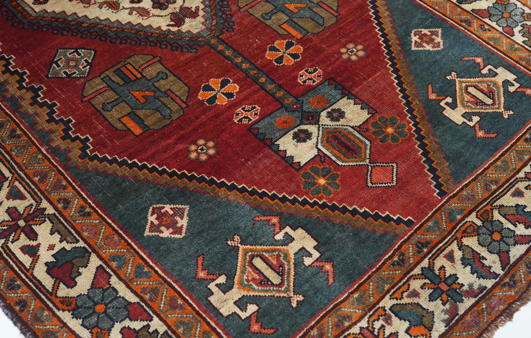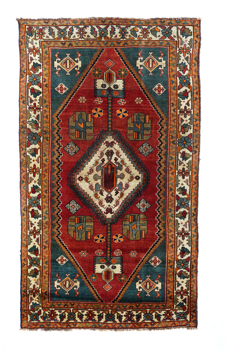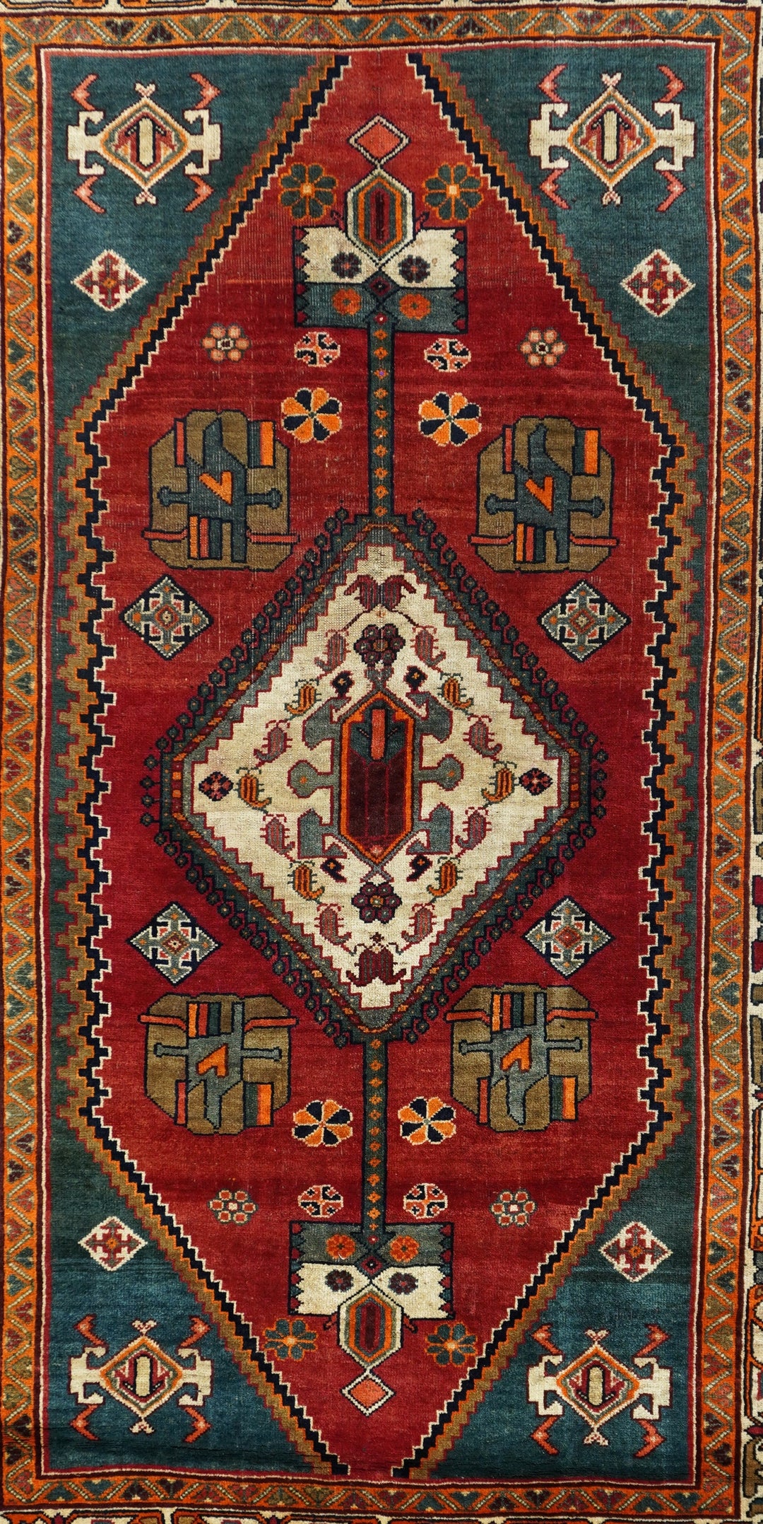 This central Persian rustic Chahar Mahal scatter has borrowed a few features from the Qashghai rugs of southwest Persia. The nested, stepped central diamond medallion sports a device reminiscent of the “Qashghai gul” and modified versions appear in the four corners of the blue-green field. The square indented sub-field also presents pinwheel rosettes, odd hyper-stylized flowers and rectangular broad petal pendants on long staves. Botehs in the central motif and an off white border with winged rosettes, deformed leaves and quirky short, straight vinery. Good condition.