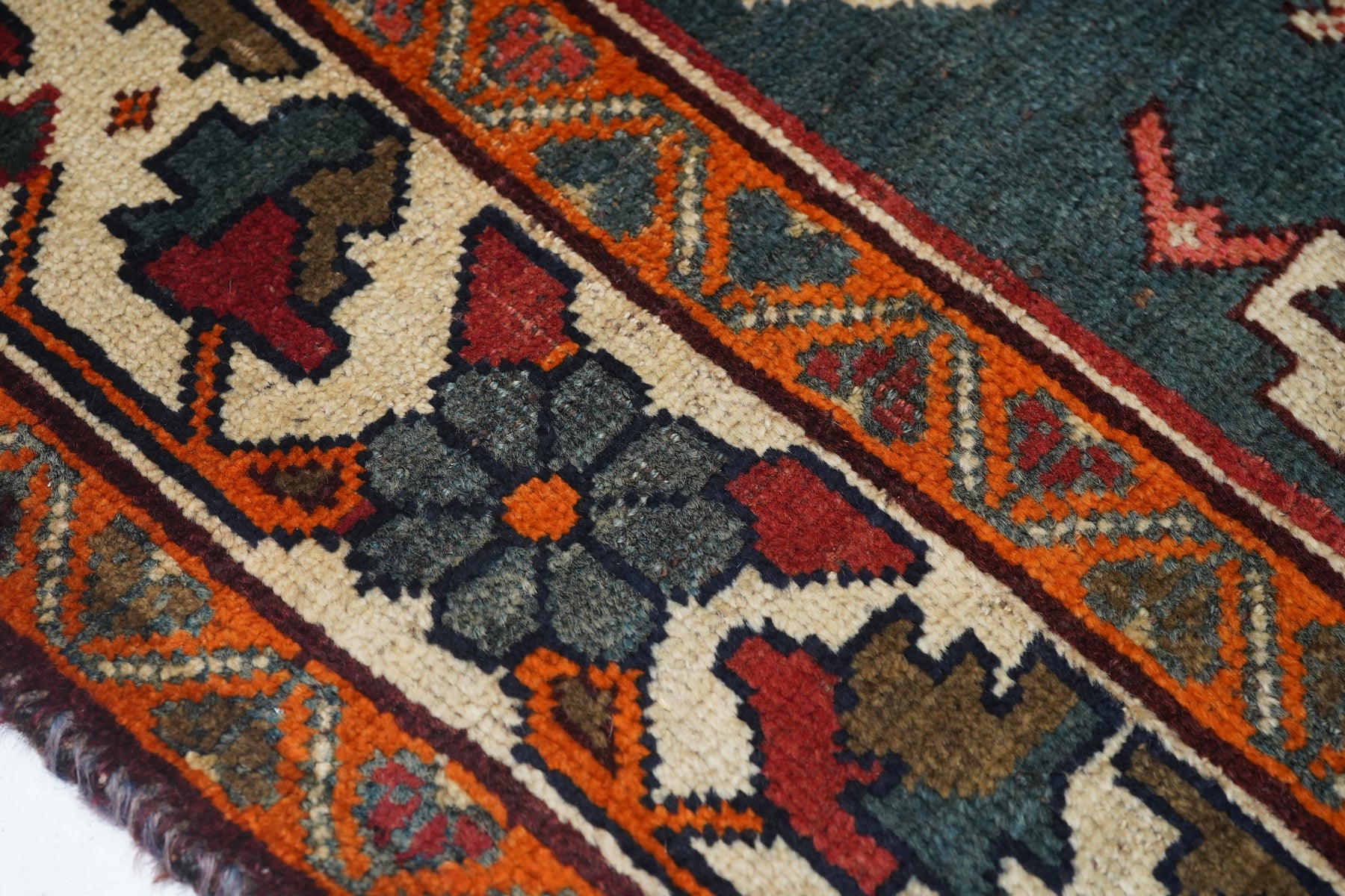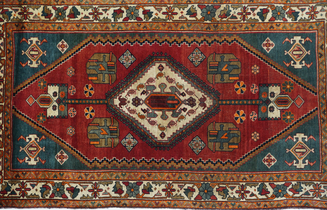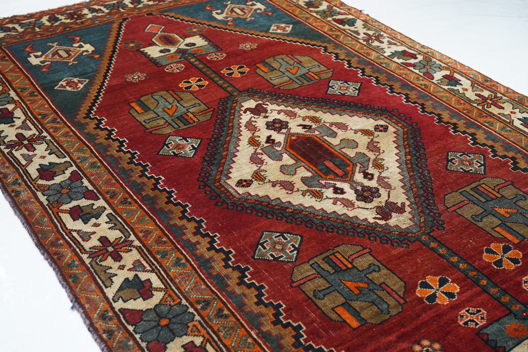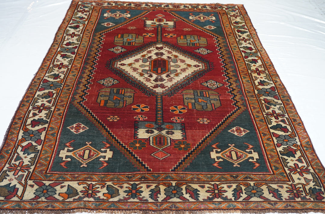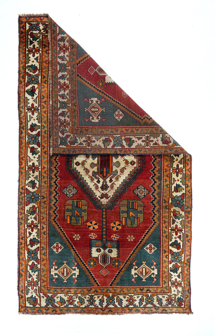 This central Persian rustic Chahar Mahal scatter has borrowed a few features from the Qashghai rugs of southwest Persia. The nested, stepped central diamond medallion sports a device reminiscent of the “Qashghai gul” and modified versions appear in the four corners of the blue-green field. The square indented sub-field also presents pinwheel rosettes, odd hyper-stylized flowers and rectangular broad petal pendants on long staves. Botehs in the central motif and an off white border with winged rosettes, deformed leaves and quirky short, straight vinery. Good condition.