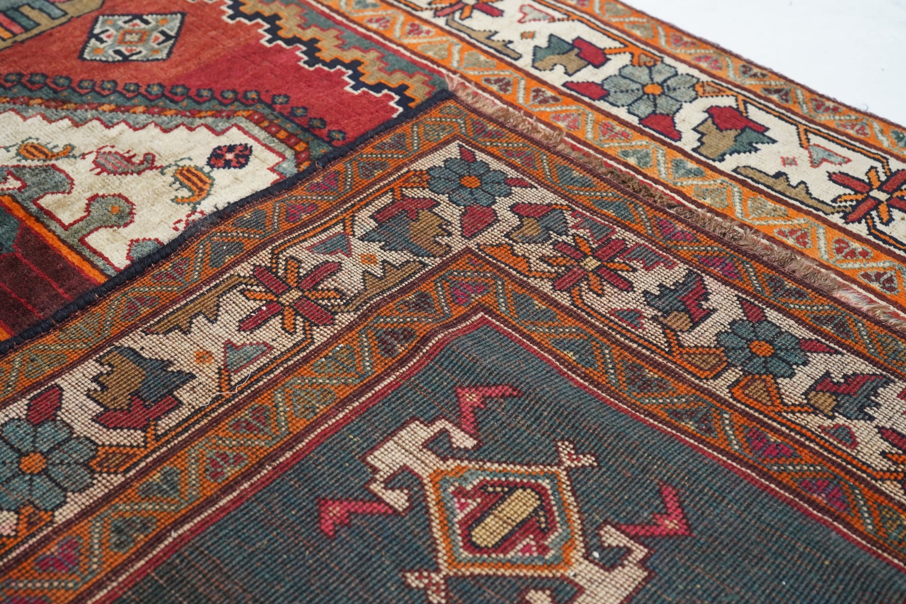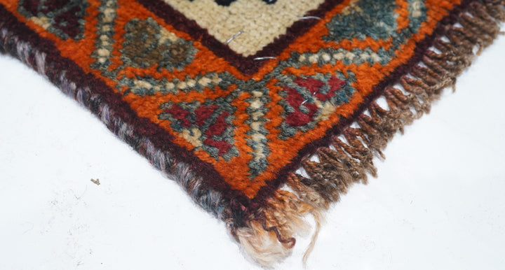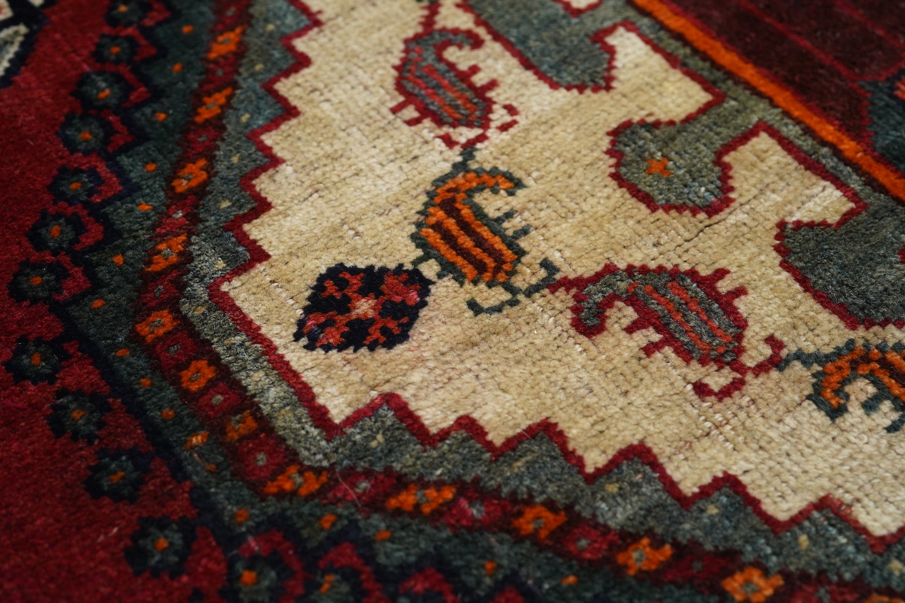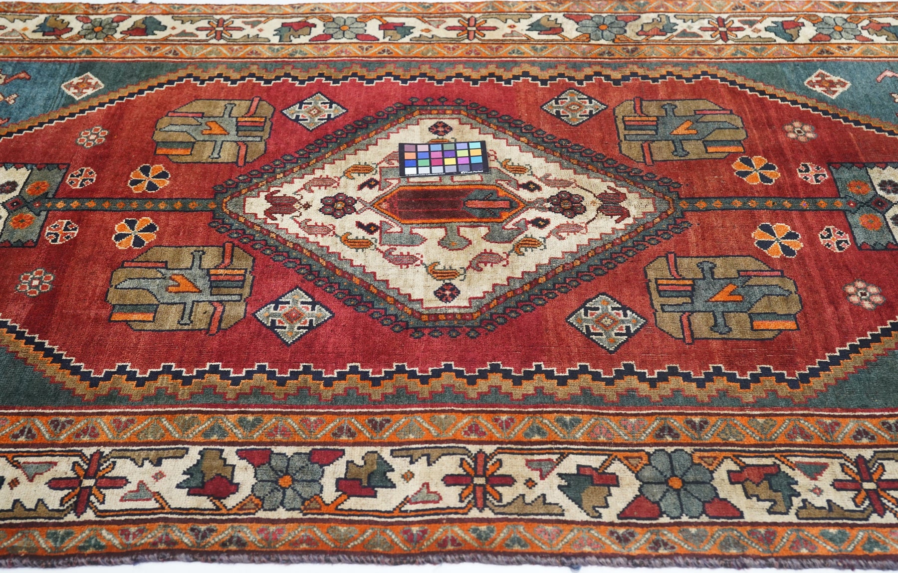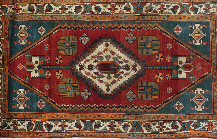 This central Persian rustic Chahar Mahal scatter has borrowed a few features from the Qashghai rugs of southwest Persia. The nested, stepped central diamond medallion sports a device reminiscent of the “Qashghai gul” and modified versions appear in the four corners of the blue-green field. The square indented sub-field also presents pinwheel rosettes, odd hyper-stylized flowers and rectangular broad petal pendants on long staves. Botehs in the central motif and an off white border with winged rosettes, deformed leaves and quirky short, straight vinery. Good condition.