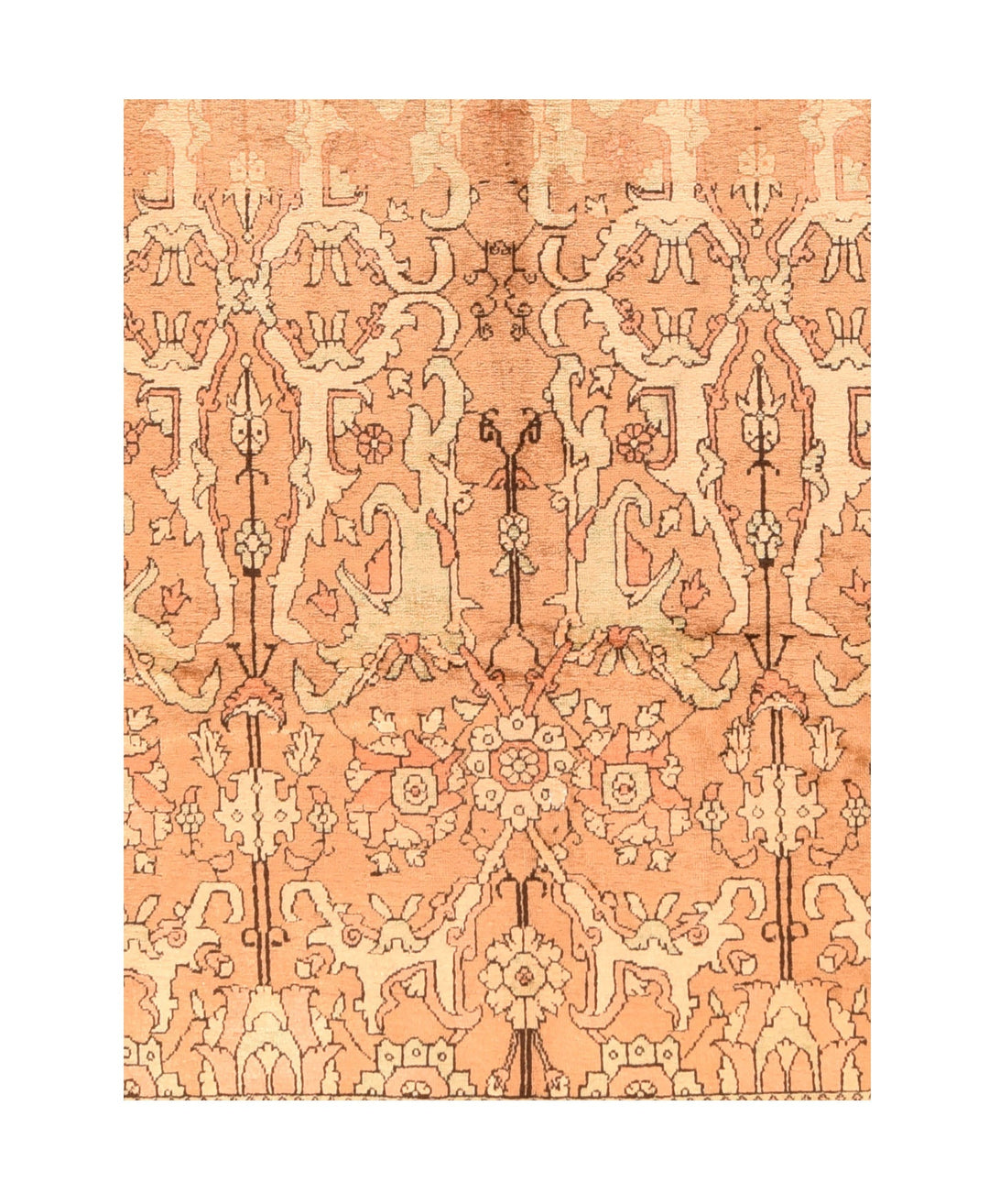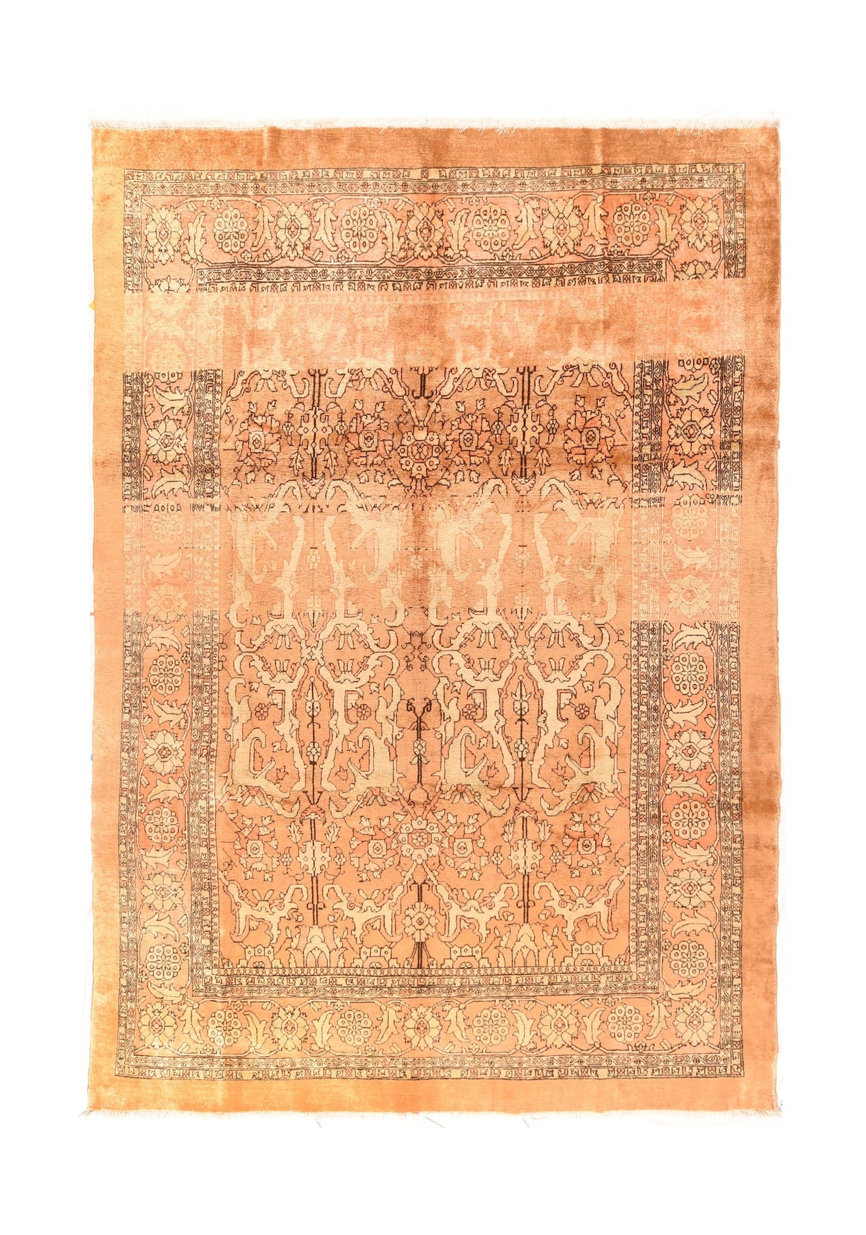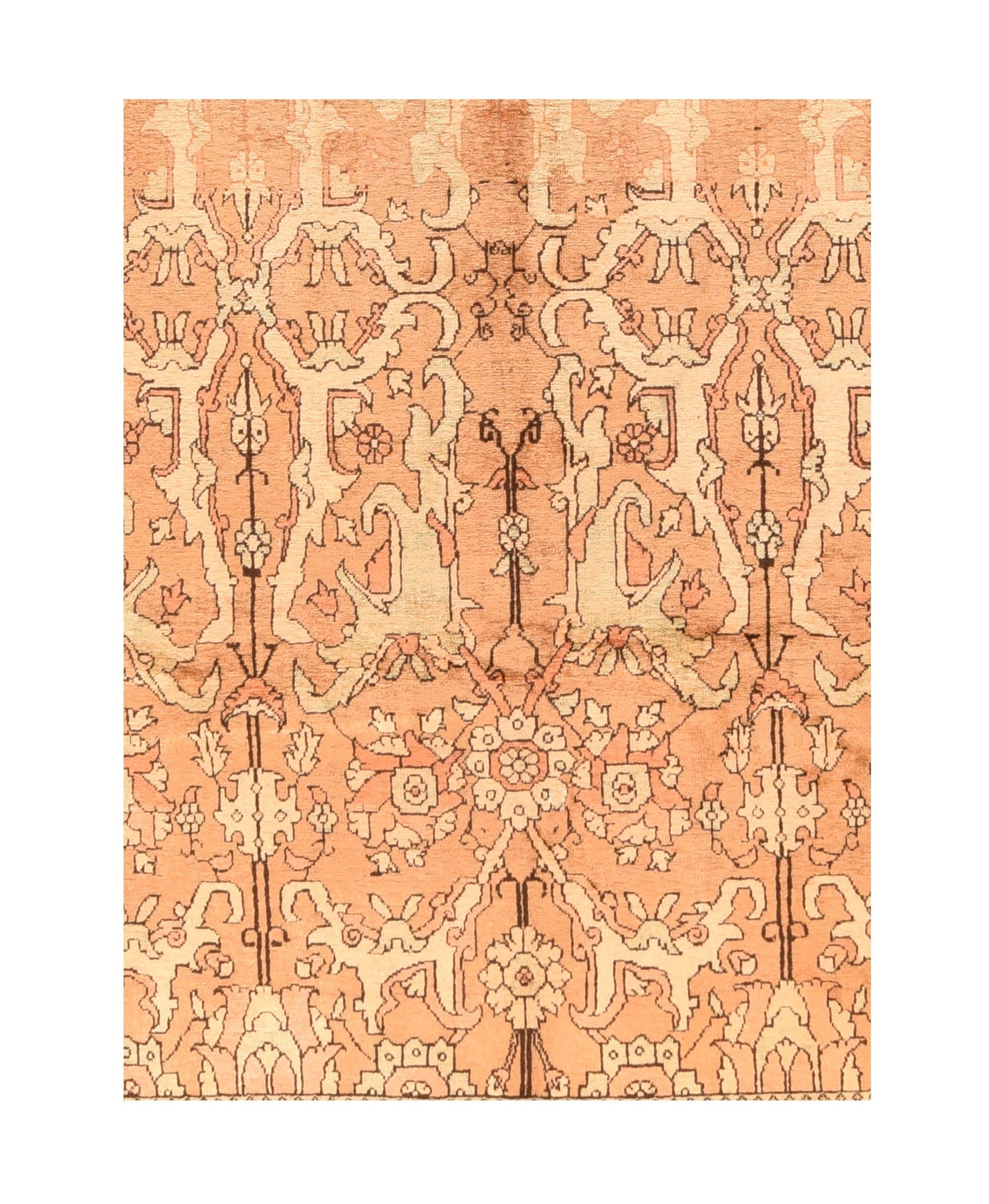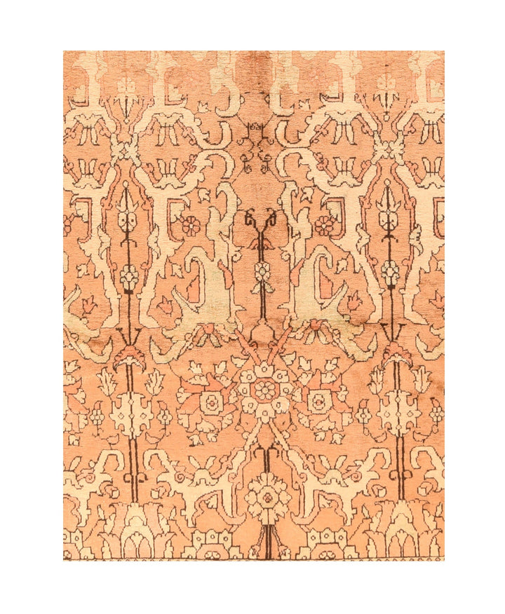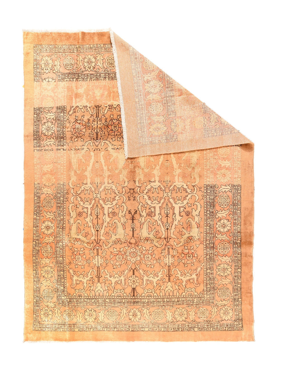 Displays a three column allover palmette pattern tan rosette and barbed lancet leaf border and a plain outermost strip. Moderate weave on cotton. Narrow palette with mellow general tonality. No dark blues or reds.