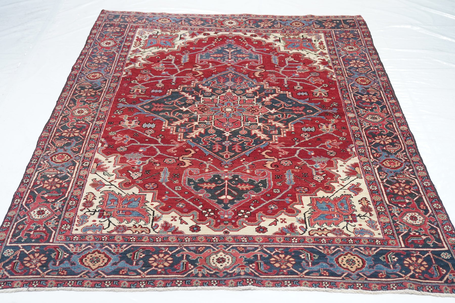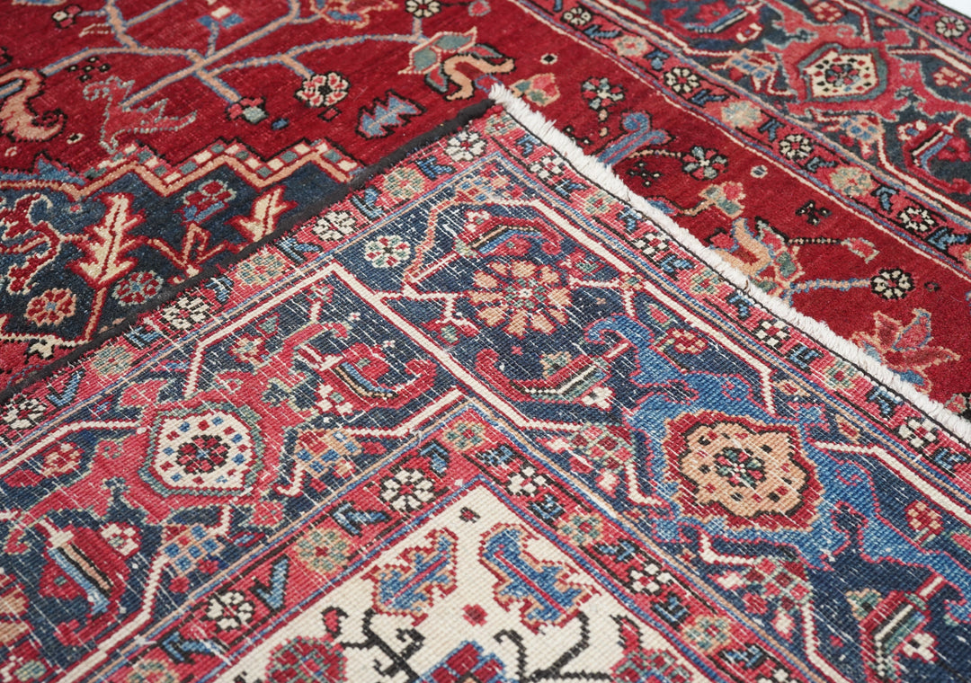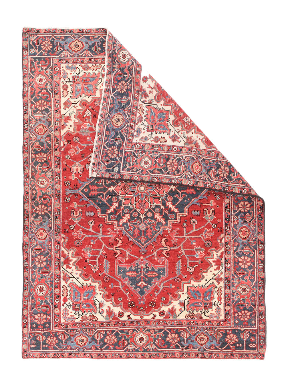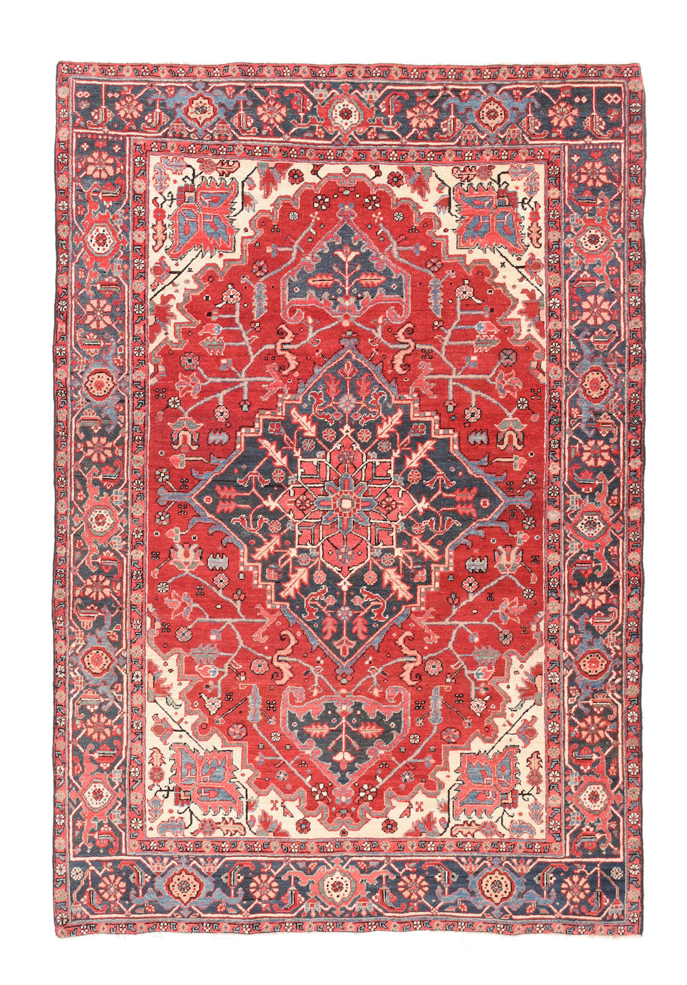 Looks like a room size, but this uncommon scatter format NW Persian village scatter shows a vivid natural dye palette with a tomato madder red field centred by a partially stepped navy diamond medallion filled with serrated, radiating leaves and a central salmon octogramme. Giant blue pendants with volute corners. Vigorous stiff field vinery and conjoint ivory corners. Abrashed dark blue border with Heriz-style reversing turtle palmettes. Very slight reduction at one end. Medium coarse weave. Good condition.
