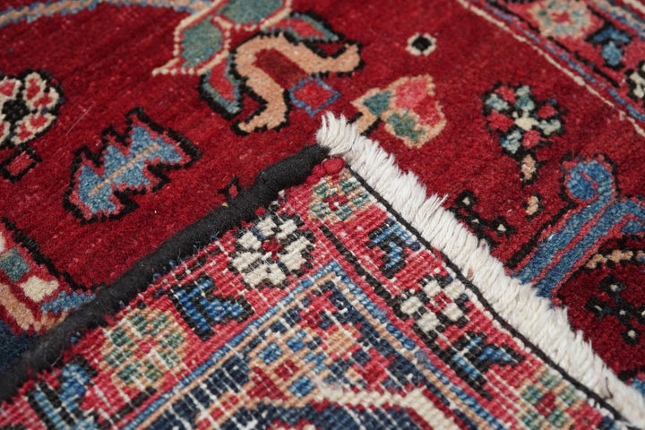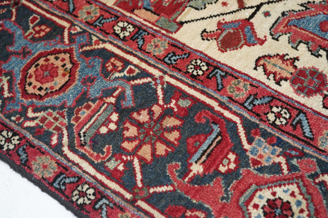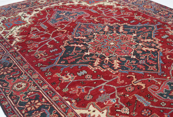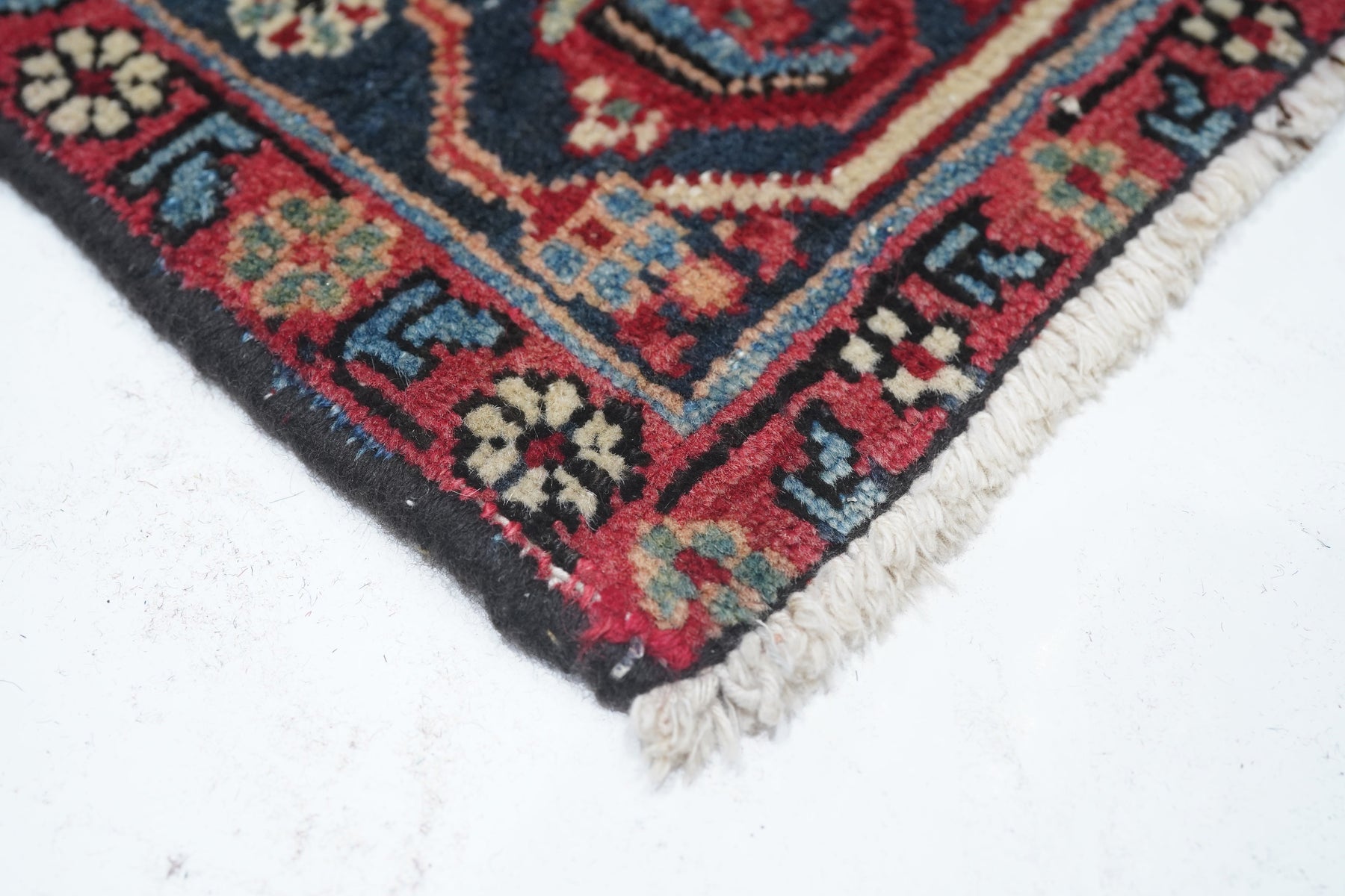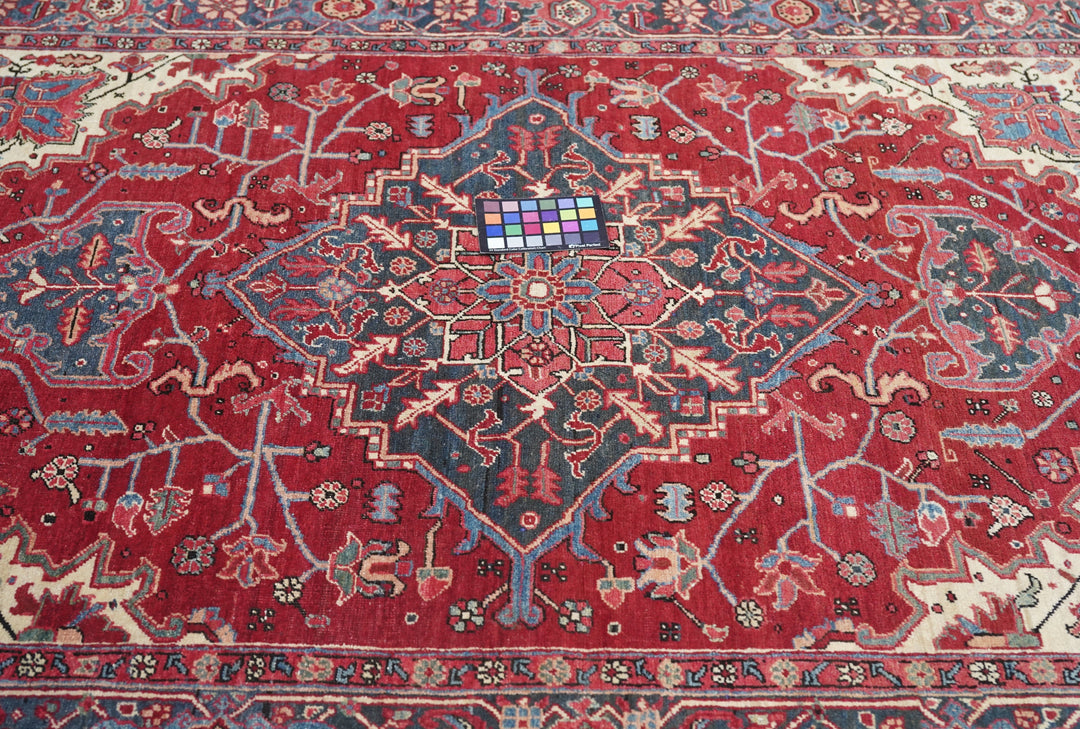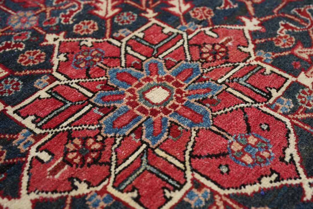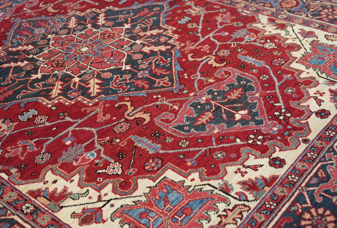 Looks like a room size, but this uncommon scatter format NW Persian village scatter shows a vivid natural dye palette with a tomato madder red field centred by a partially stepped navy diamond medallion filled with serrated, radiating leaves and a central salmon octogramme. Giant blue pendants with volute corners. Vigorous stiff field vinery and conjoint ivory corners. Abrashed dark blue border with Heriz-style reversing turtle palmettes. Very slight reduction at one end. Medium coarse weave. Good condition.
