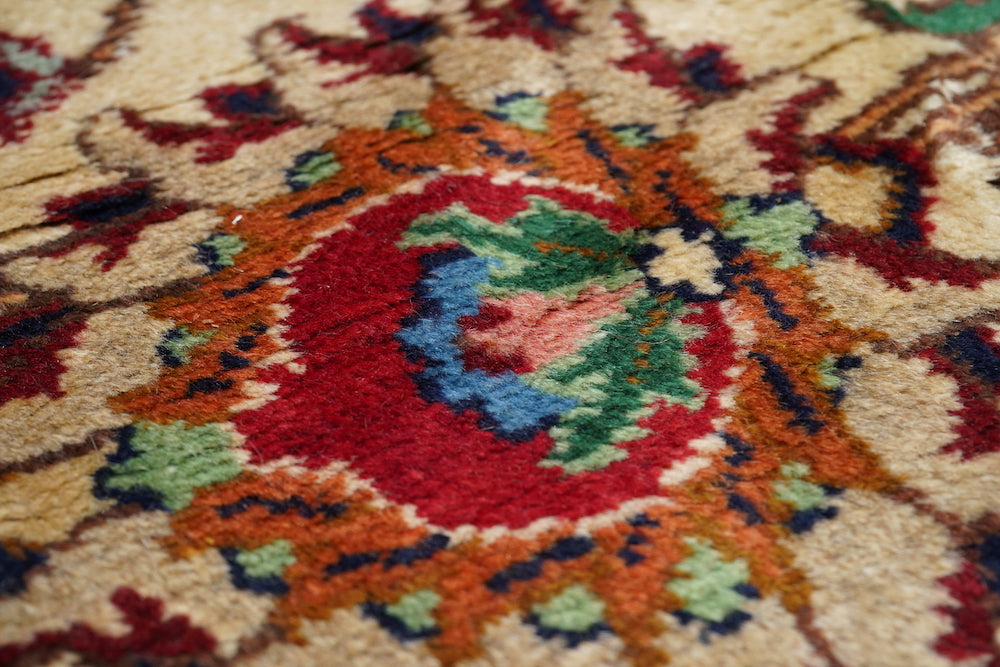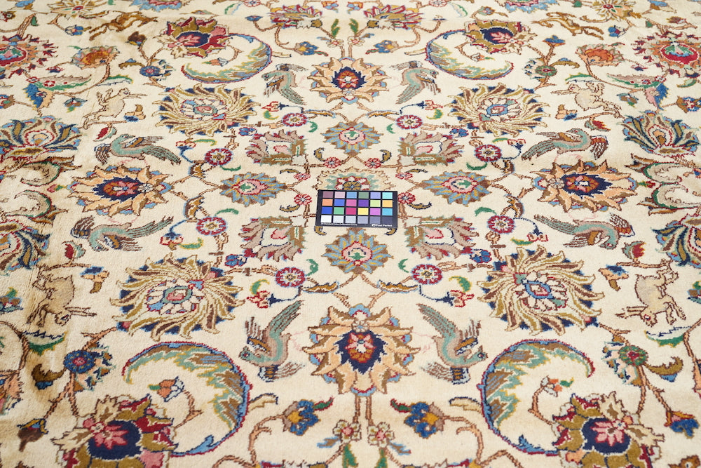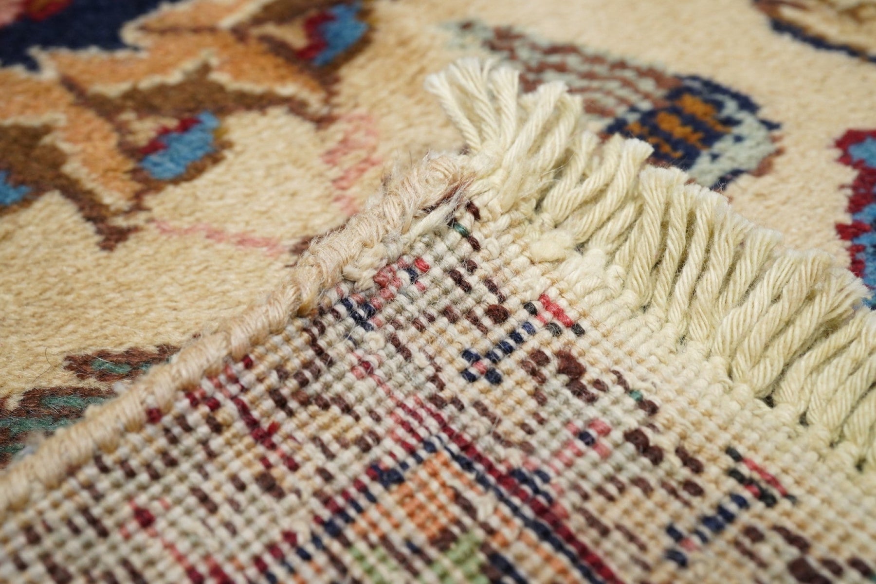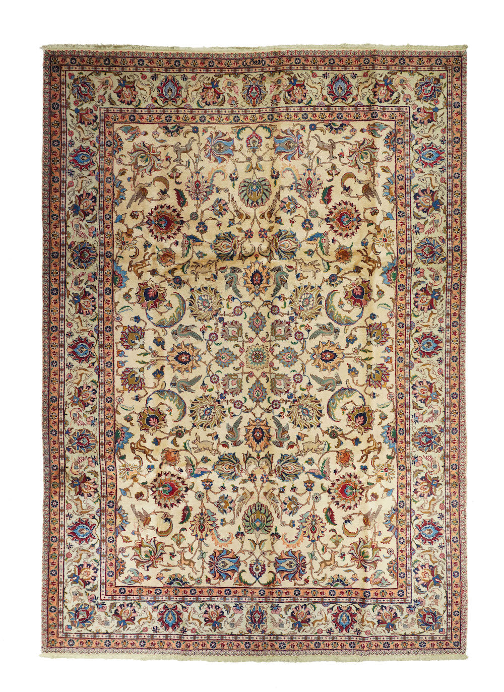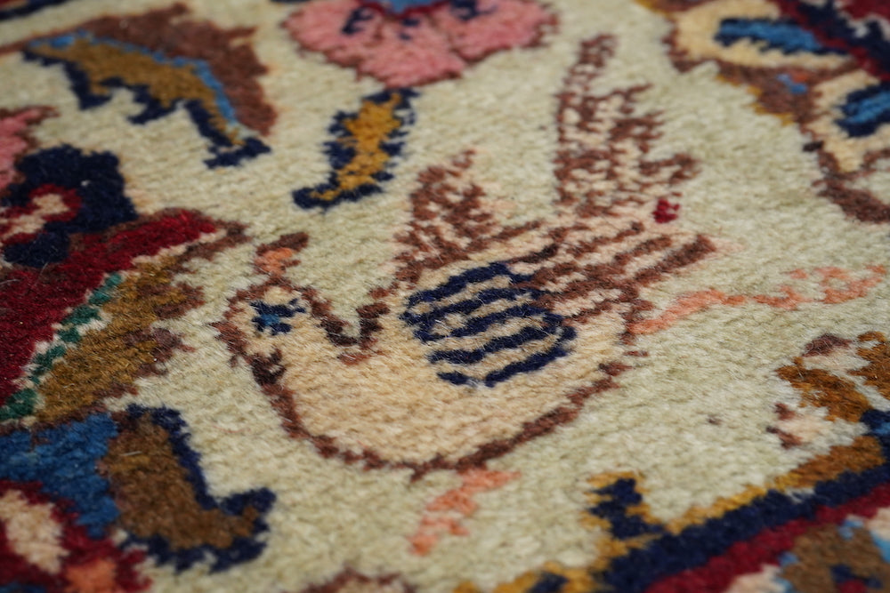 A centre is lightly indicated by eight petal palmettes radiating out from an octogramme rosette, on an ecru ground, neatly decorated by more and varied petal palmettes, bitonal sickle leaves and interspersed with birds and ramping animals. Cream border with upright and tilting palmettes, and running animals. Well-woven with properly turned corners. Bisk pile. Good condition.