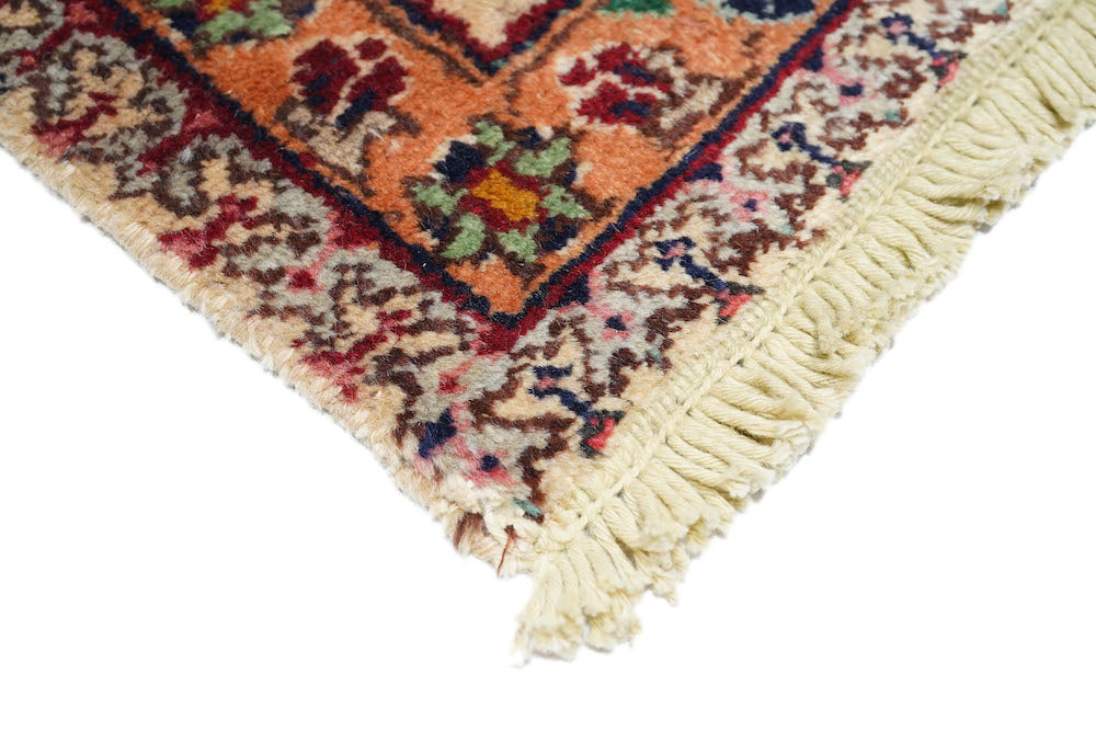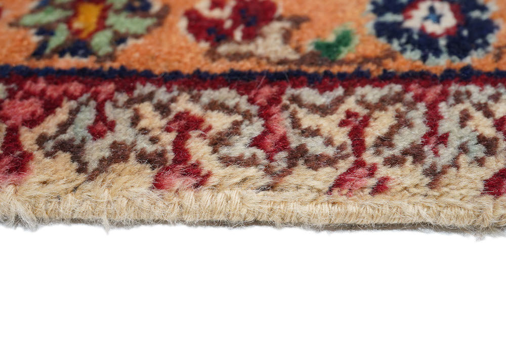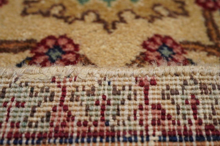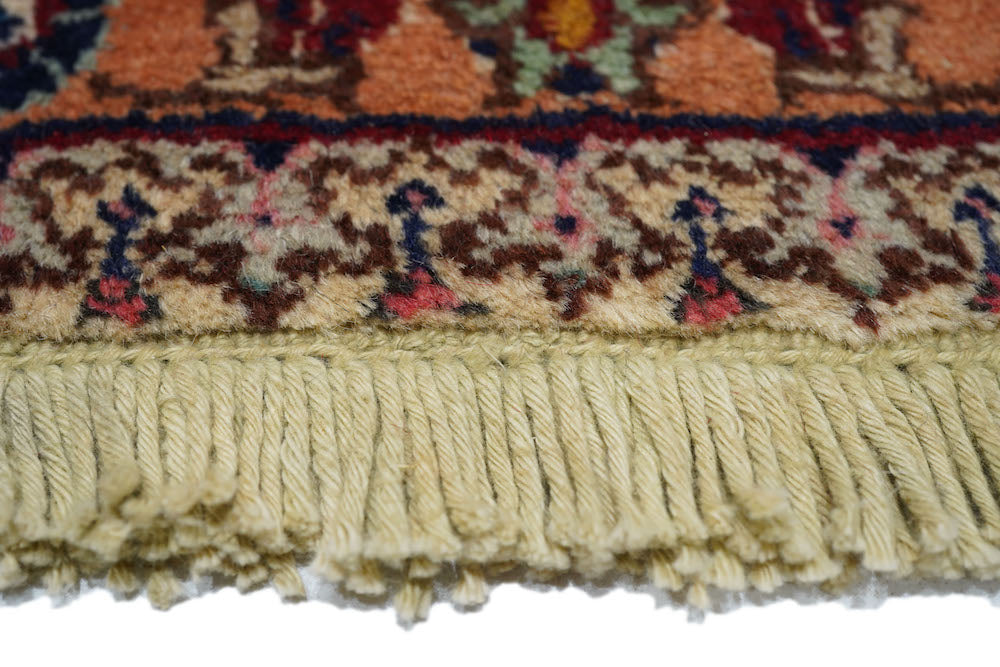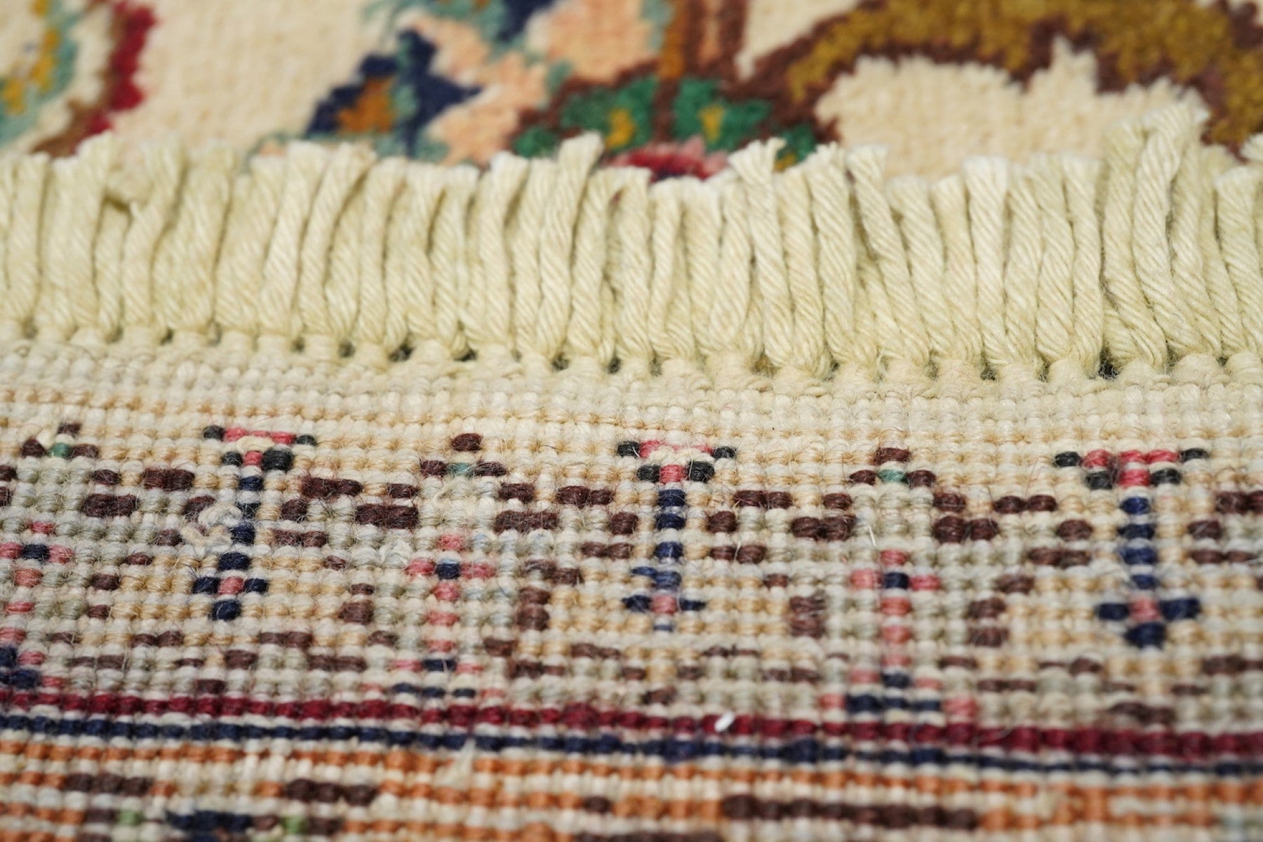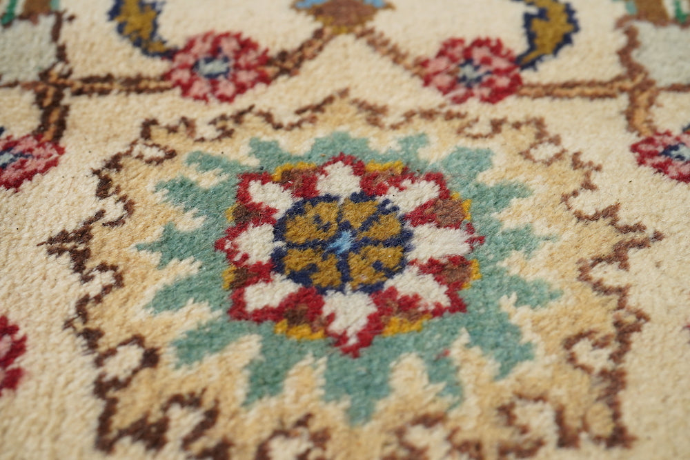 A centre is lightly indicated by eight petal palmettes radiating out from an octogramme rosette, on an ecru ground, neatly decorated by more and varied petal palmettes, bitonal sickle leaves and interspersed with birds and ramping animals. Cream border with upright and tilting palmettes, and running animals. Well-woven with properly turned corners. Bisk pile. Good condition.