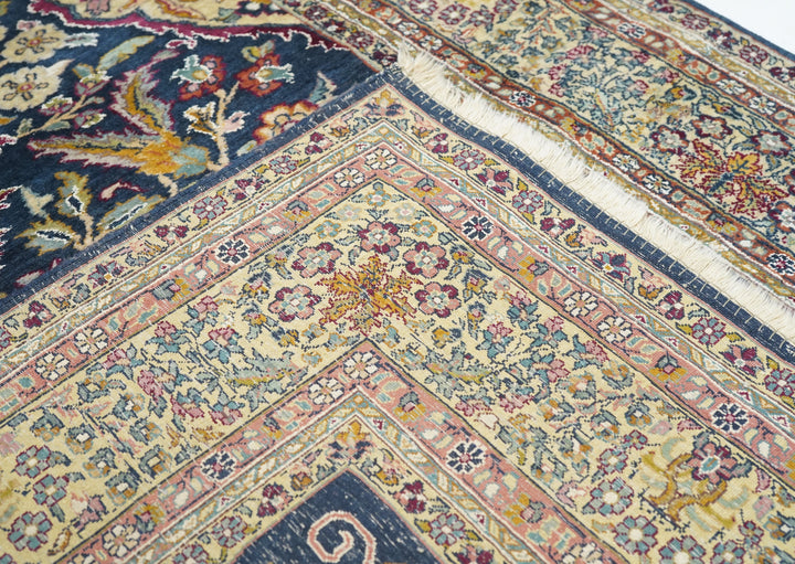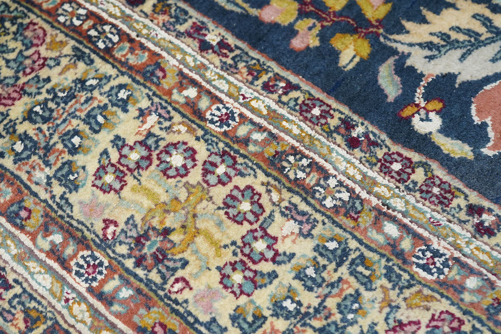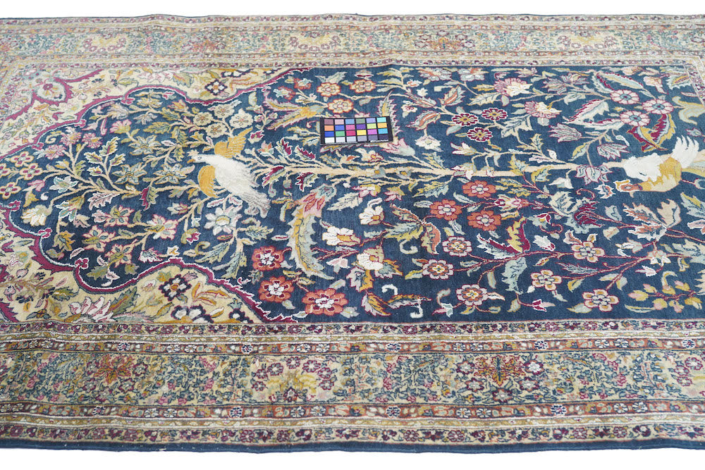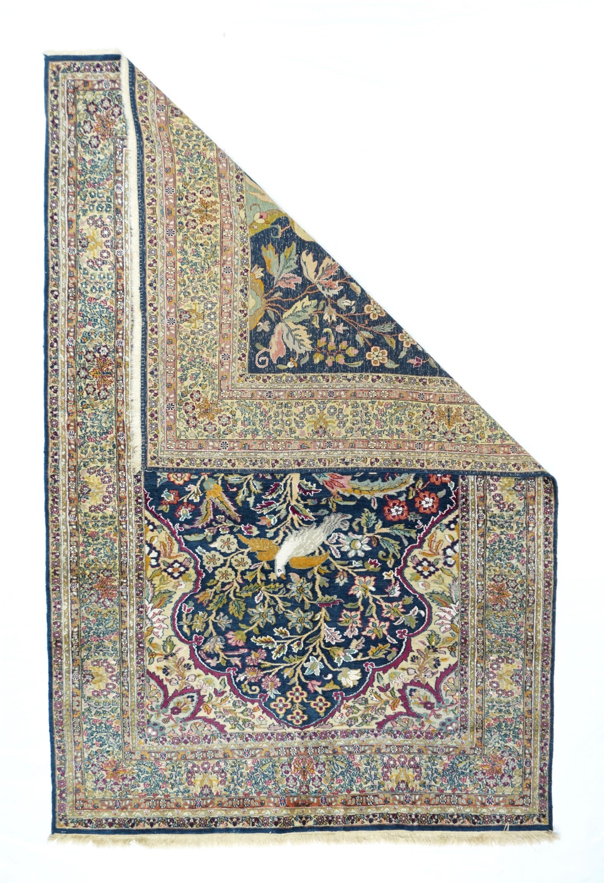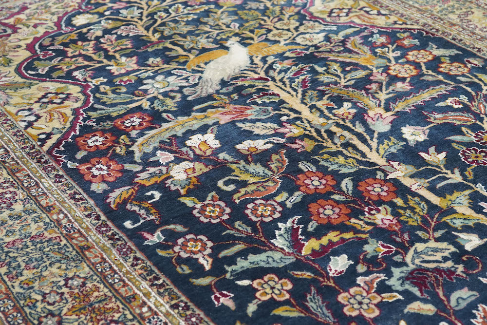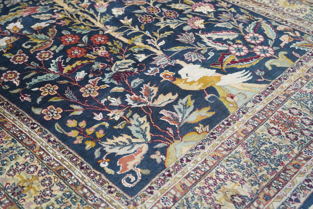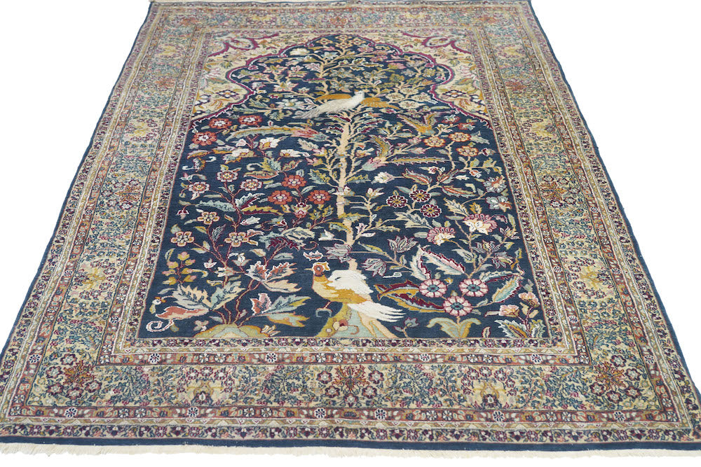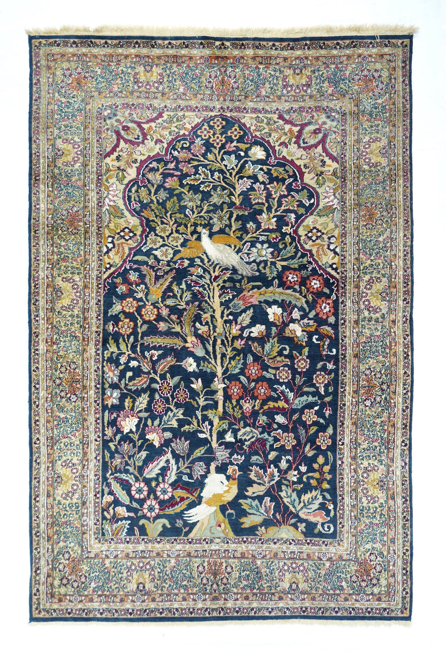 The scalloped-arch dark blue field shows a central tall "tree of life" with an elaborate bird perching at the base and a second taking flight well above. Composite plants grow and flower while flanking the main motif. Straw spandrels. Pale strawv main border with rosettes from stems or from palmettes. Well woven. Crisp palette. Good condition.