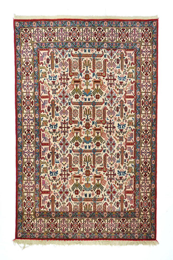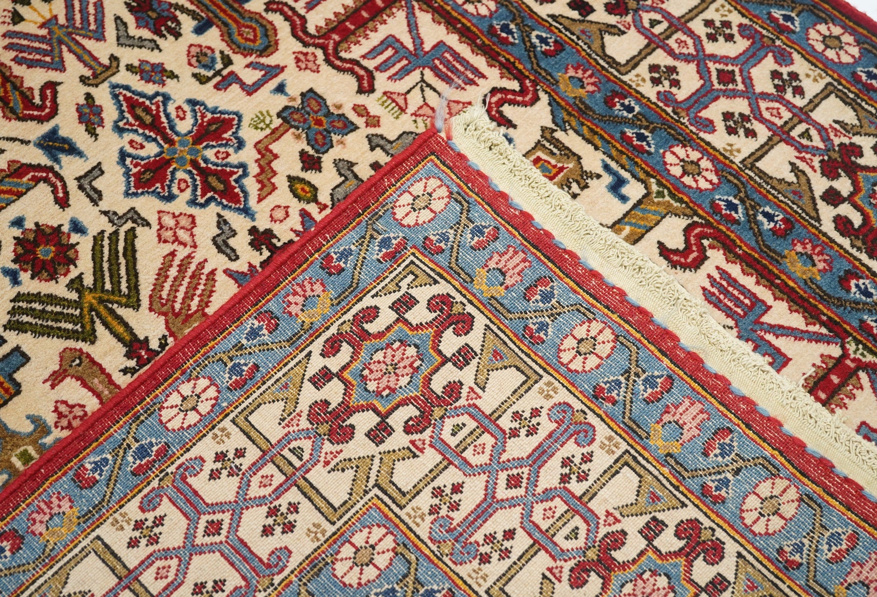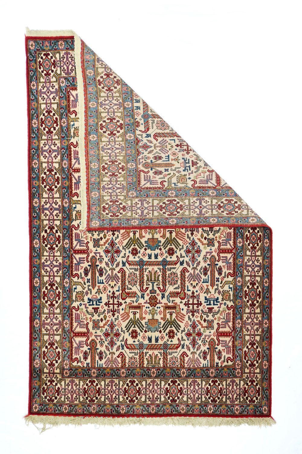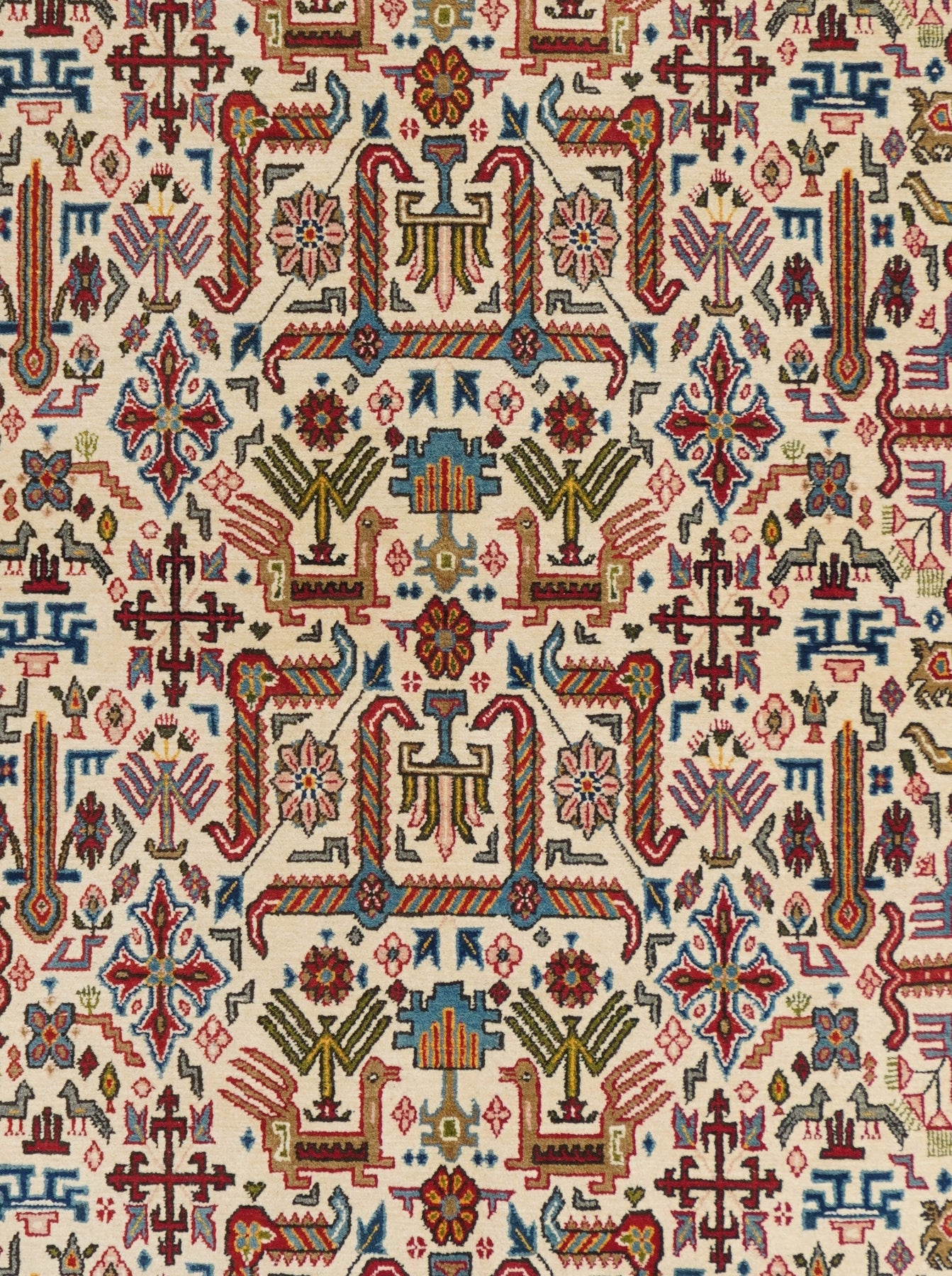 This post-WWII central Persian scatter has small birds (probably peacocks or roosters), set within an ivory ground “Kufesque” border. Symmetric knots, excellent quality short and erect pile, fine weave, cotton foundation. Good condition.