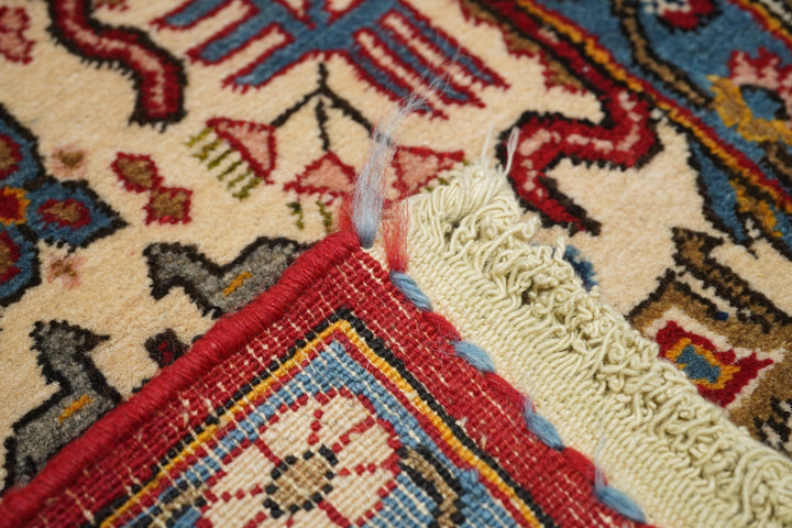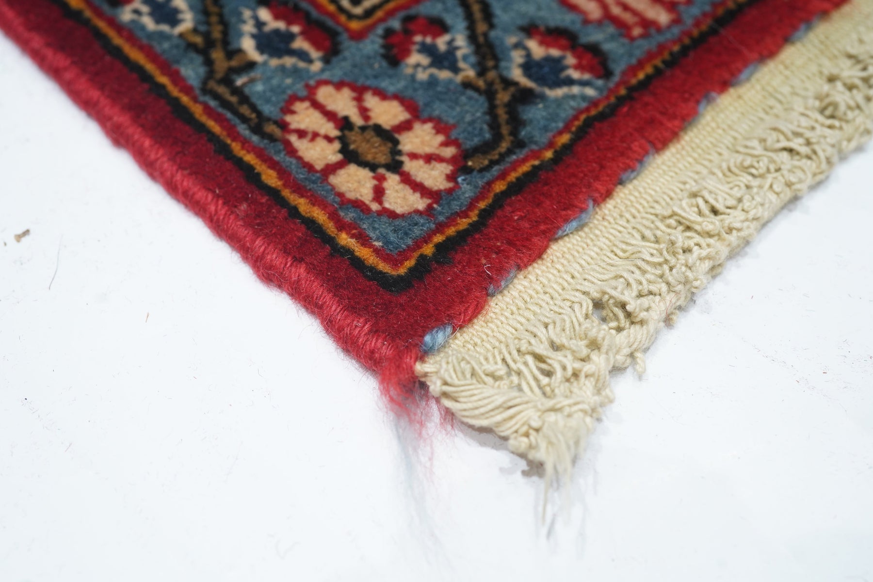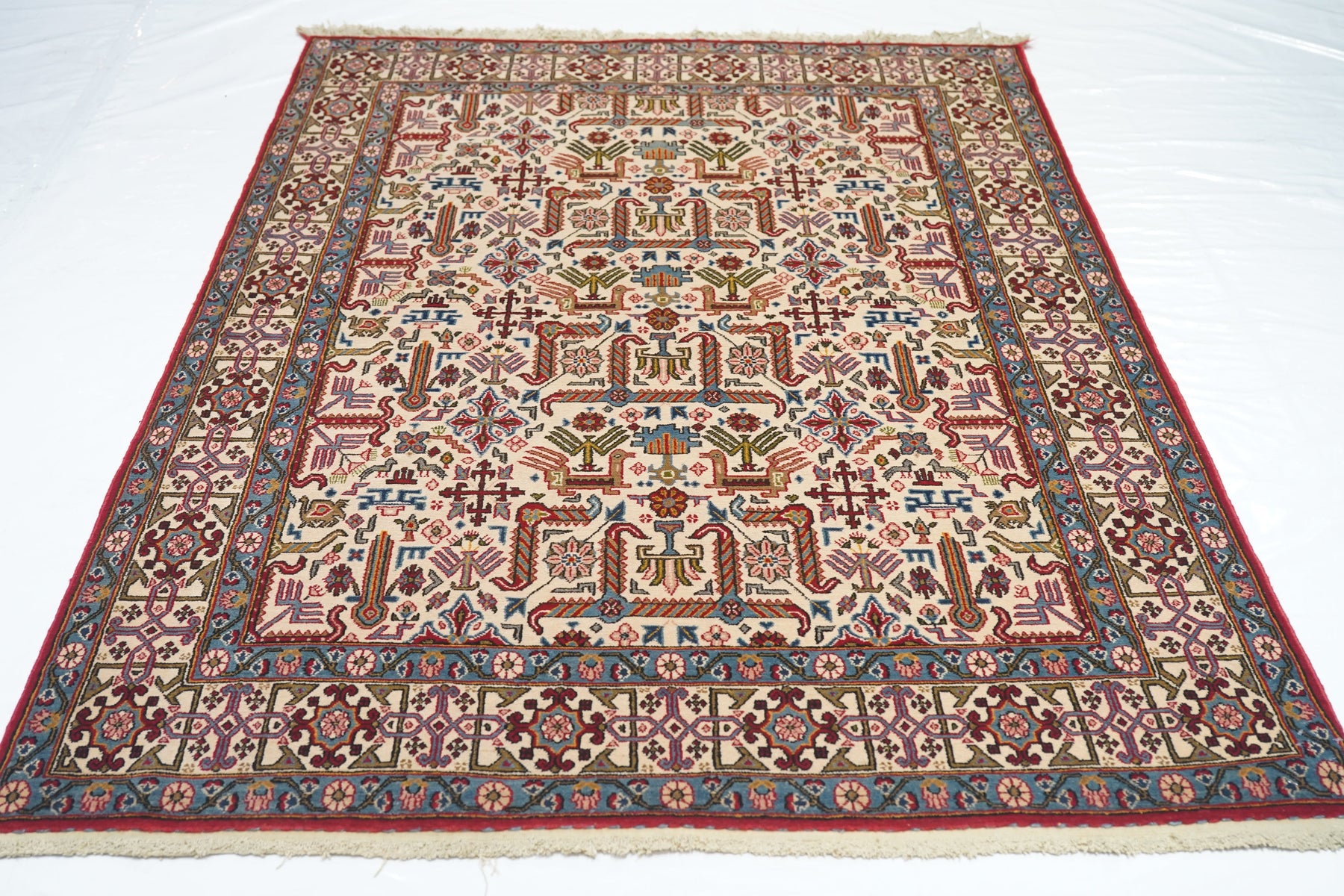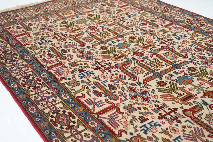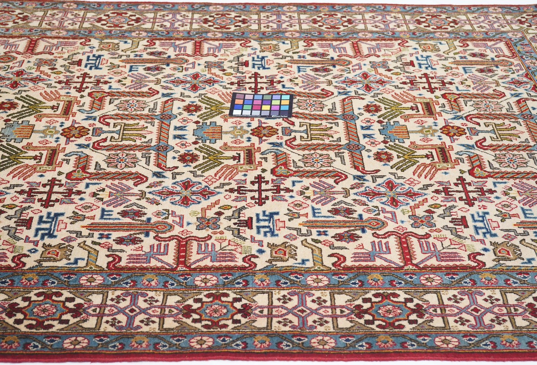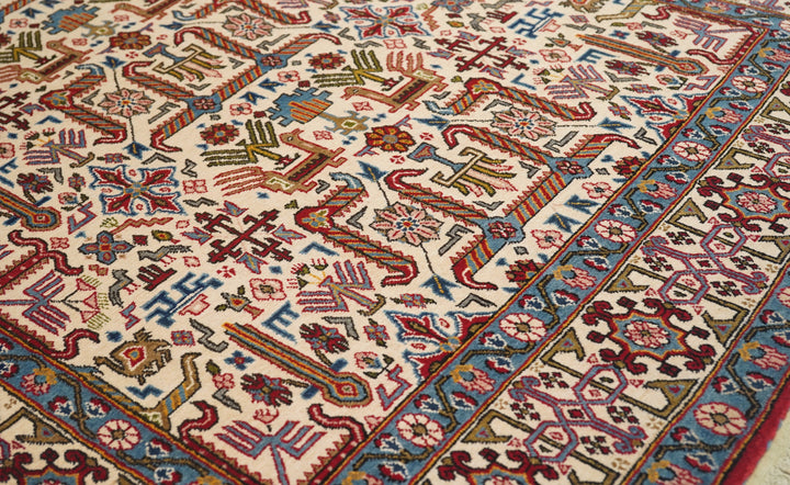 This post-WWII central Persian scatter has small birds (probably peacocks or roosters), set within an ivory ground “Kufesque” border. Symmetric knots, excellent quality short and erect pile, fine weave, cotton foundation. Good condition.
