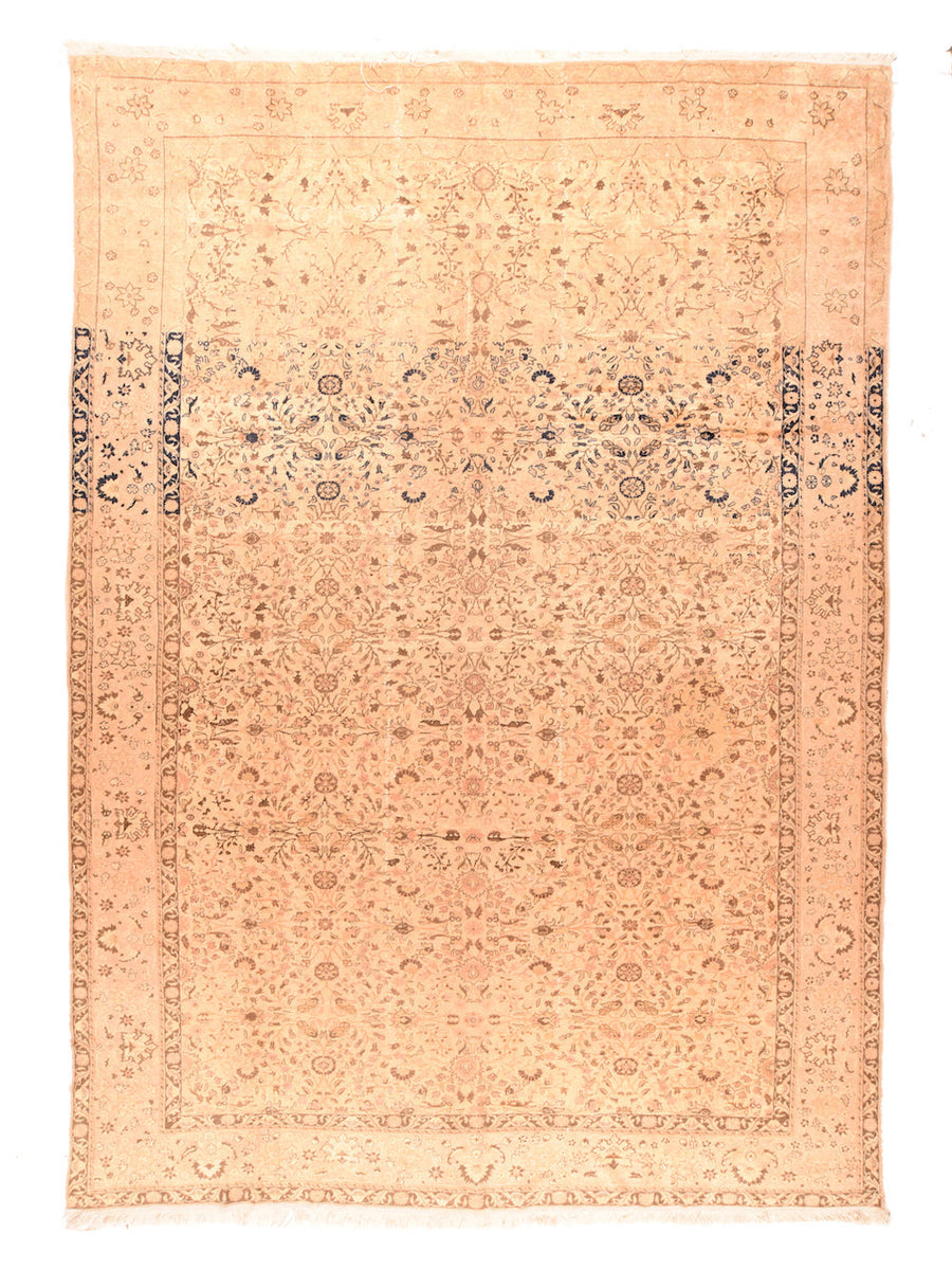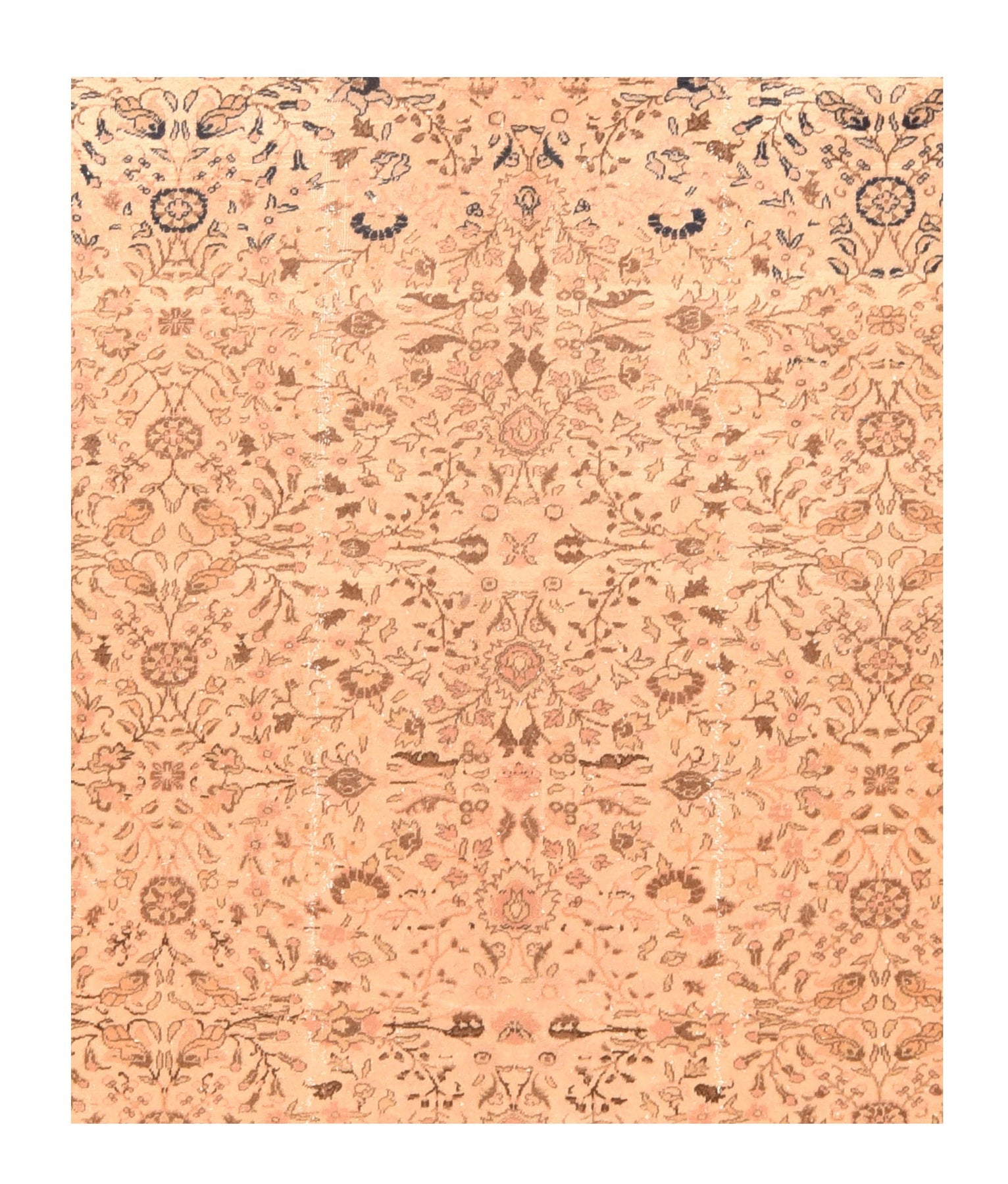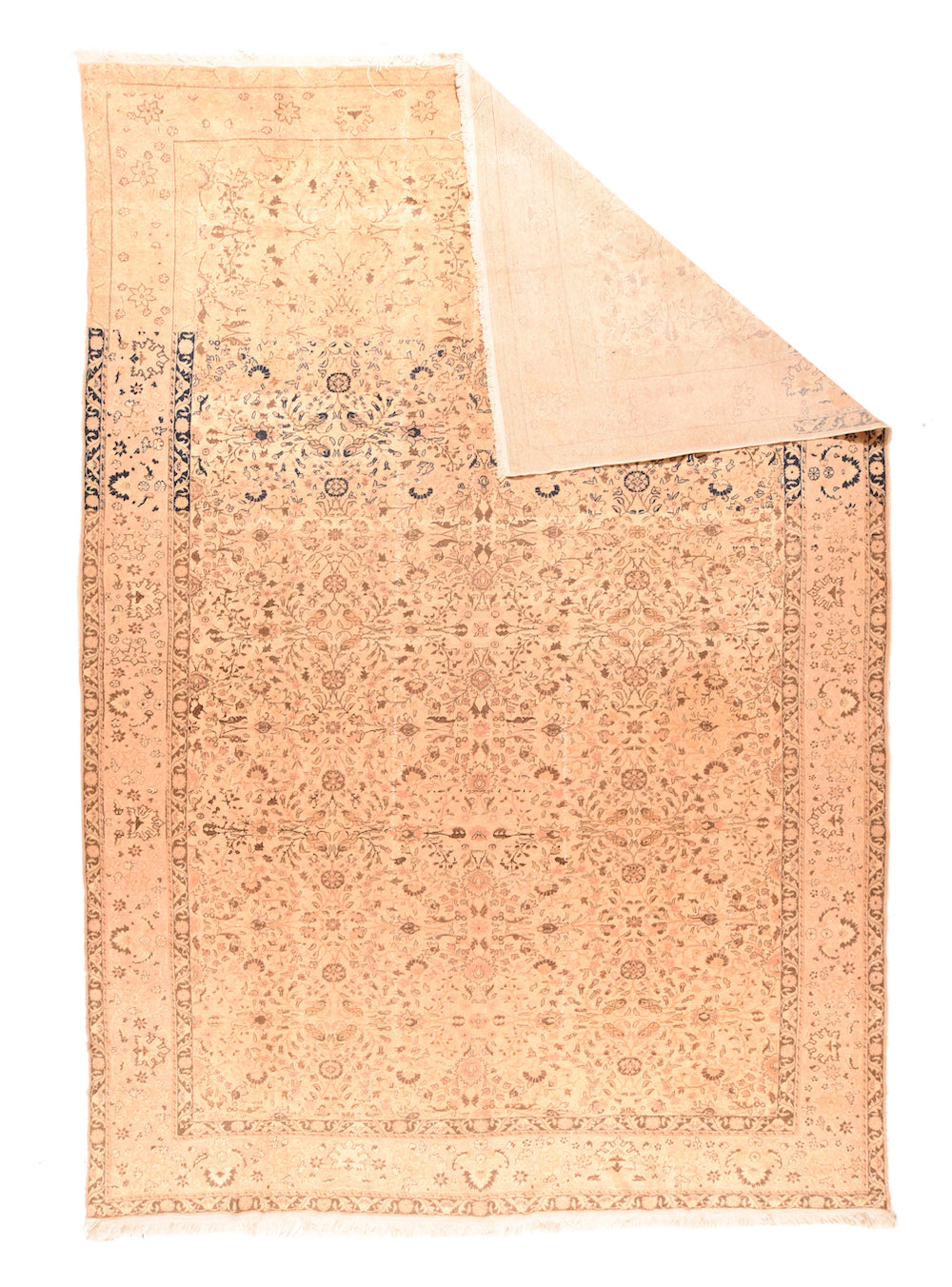 Strongly panel-abrashed at one end, the straw-sand field show sprays, stems and rosettes in an allover manner. Abrash extends through the border. Main straw-beige stripe with palmettes and stars. Moderate/medium weave. Good condition.