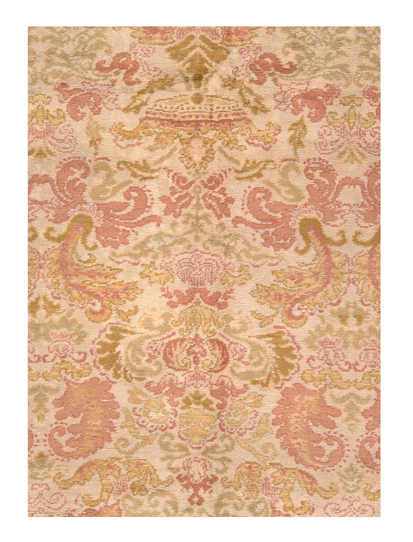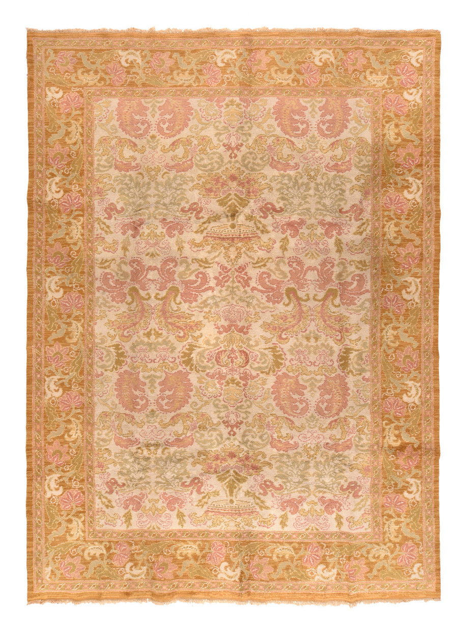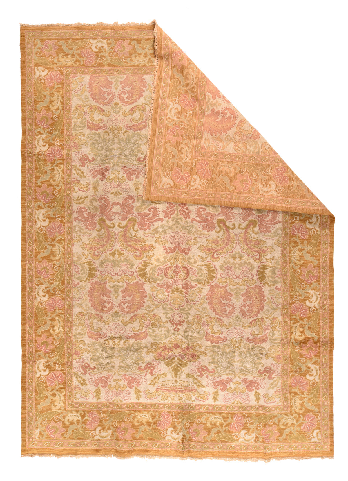The sandy straw field displays an allover, elaborate textile pattern of curled and lobed boteh-like leaves, leafy aroids, crown-like dishes and vigorously flowing vegetal motives. The streaked rust main border shows curled leaves, short branches and rosettes. The intended abrash effect in the border is copied from Renaissance Spanish and Italian velvets. Single warp knots in a medium weave. Good condition.