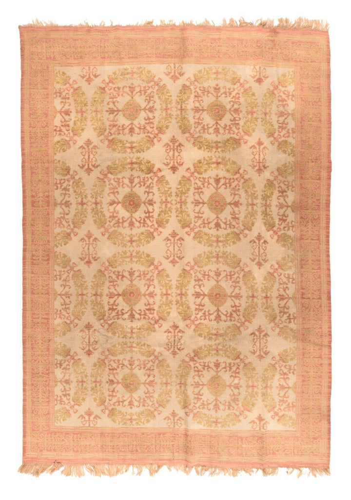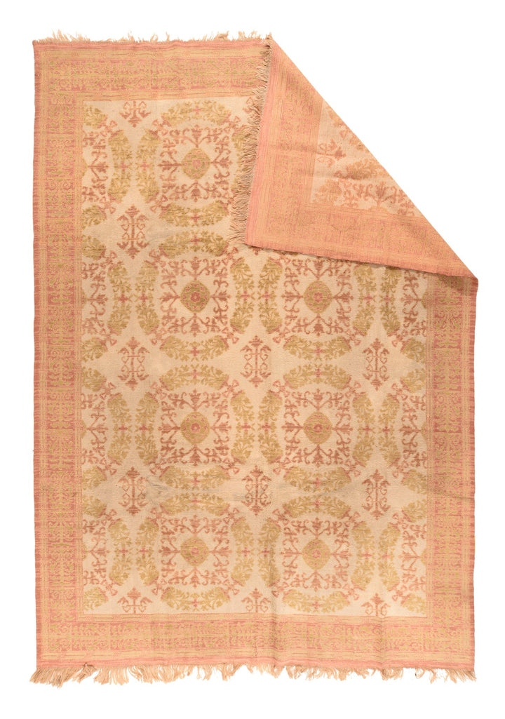 In the Spanish Renaissance style, the maize field displays eight full and eight half open: wheel medallions, with small floral secondaries. Flowers in panel modules border. Spanish single warp knot and single weft weave. Moderate/medium weave. Cotton warp. Good condition. Probably Cuenca or Alcaraz, or maybe from Madrid.