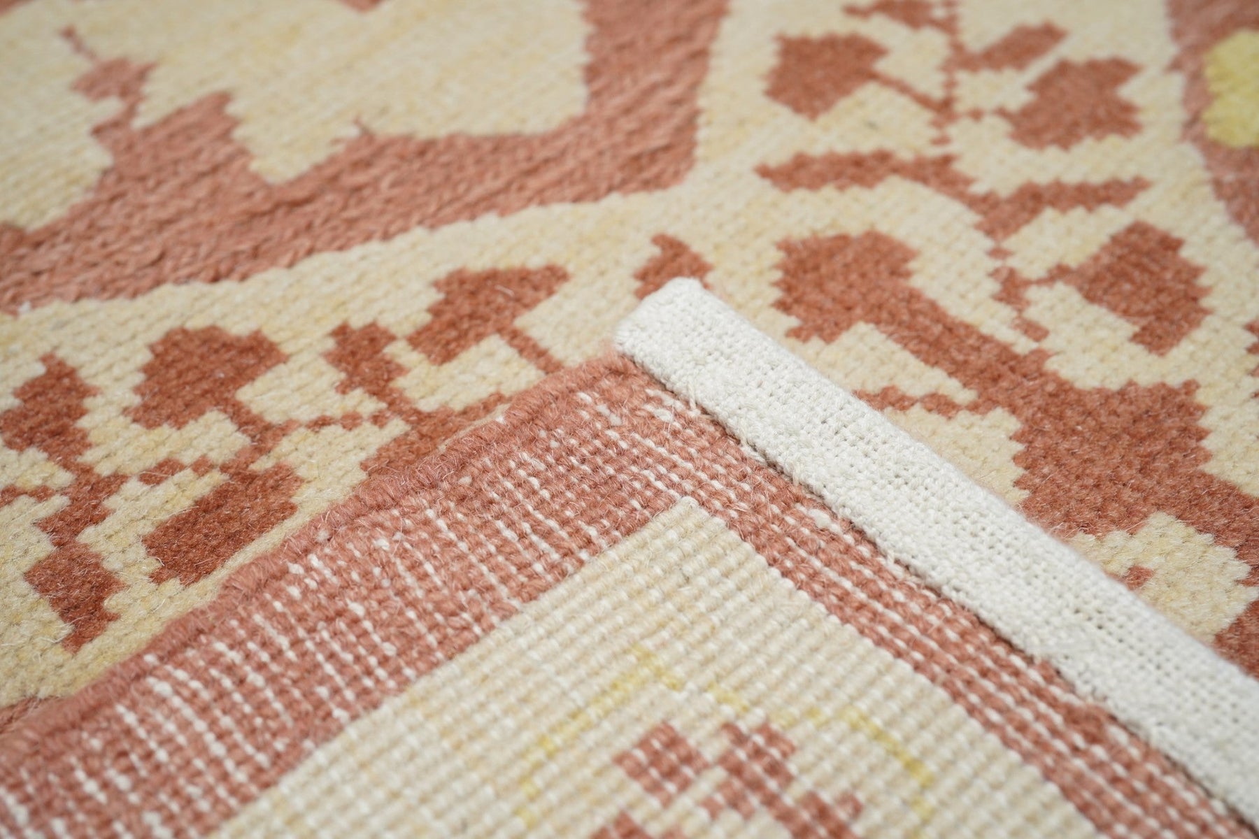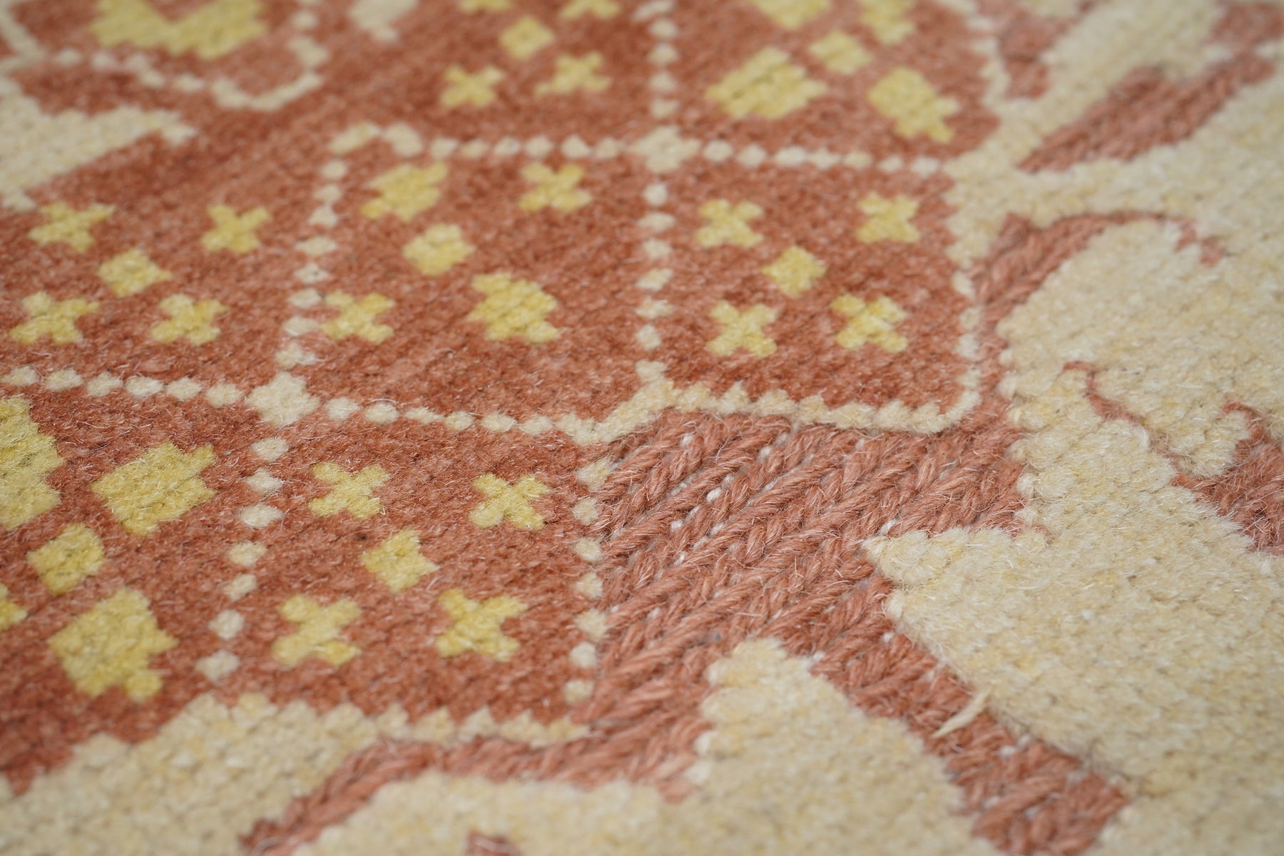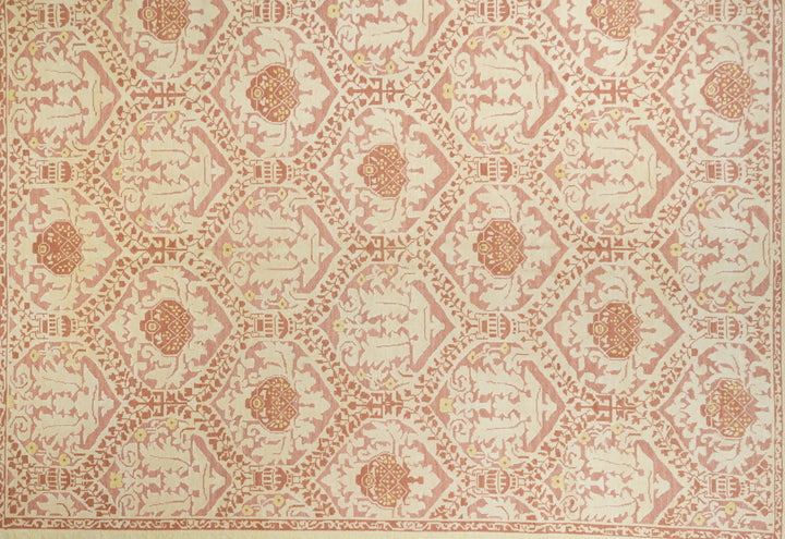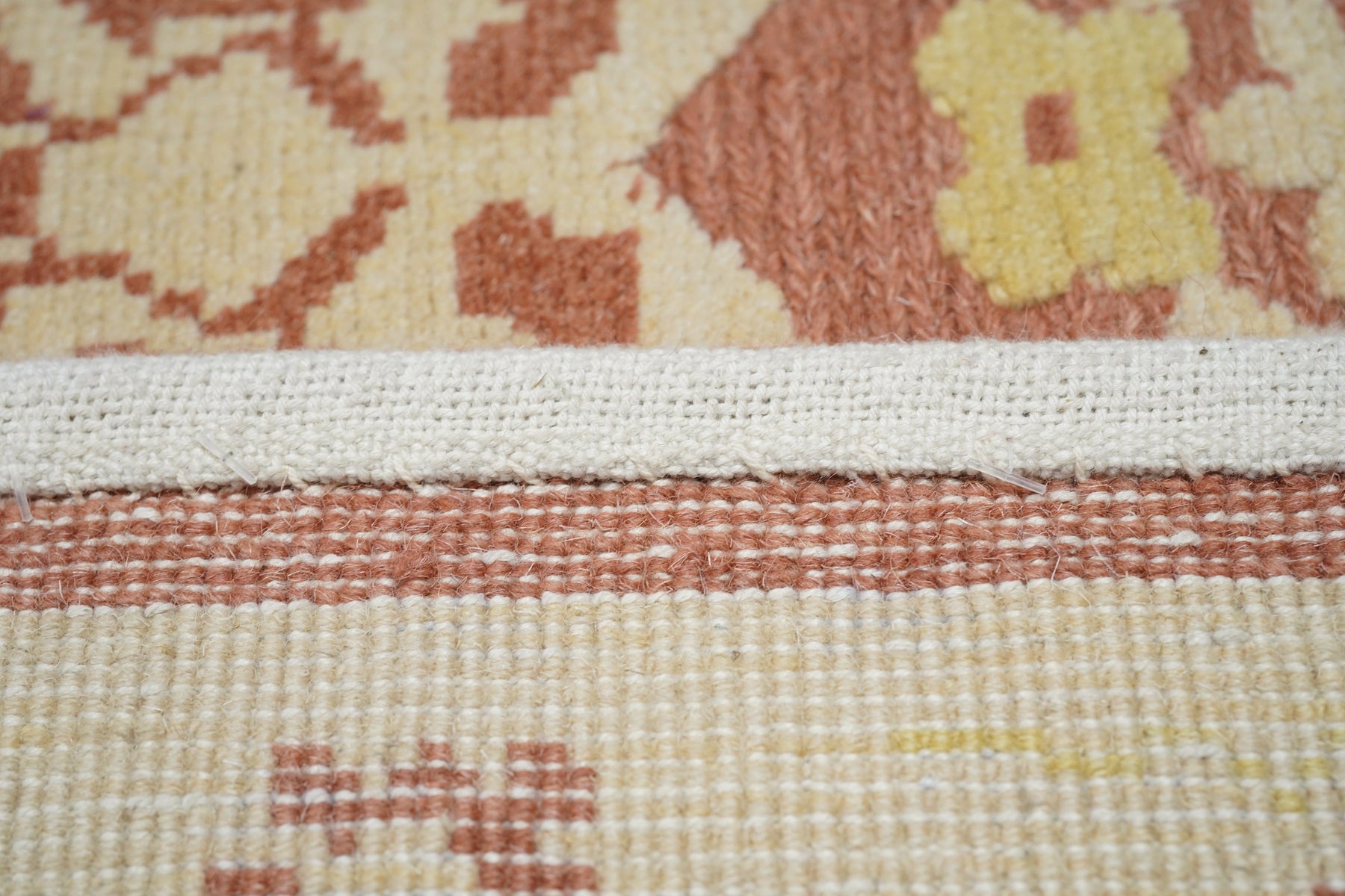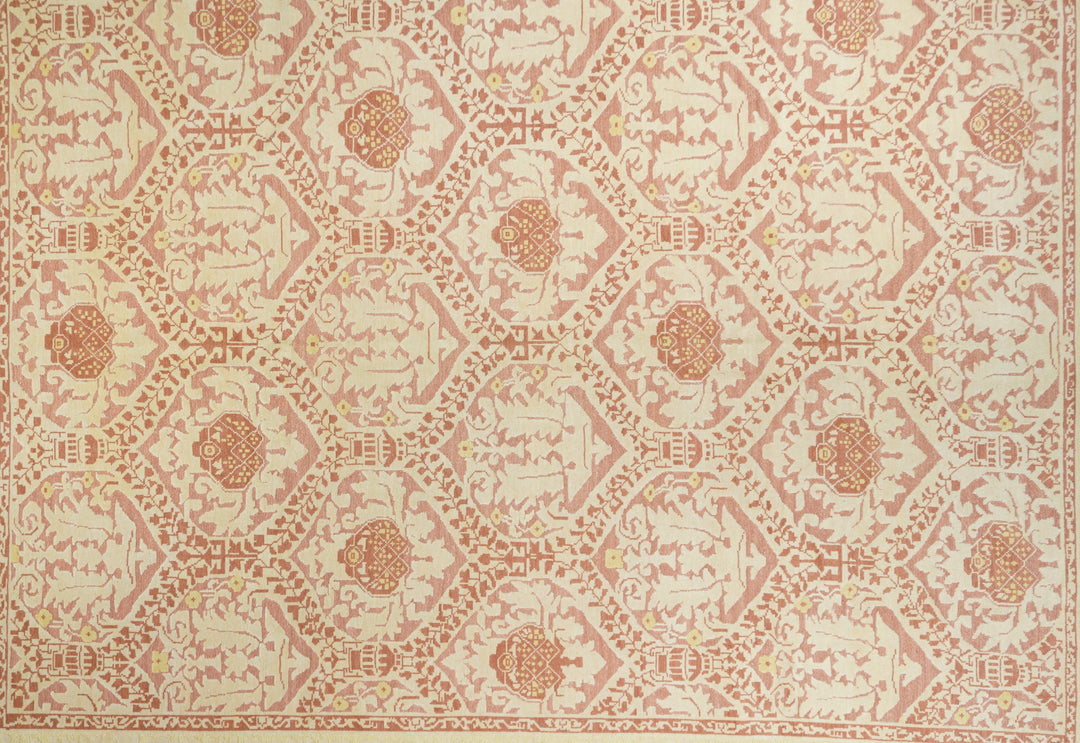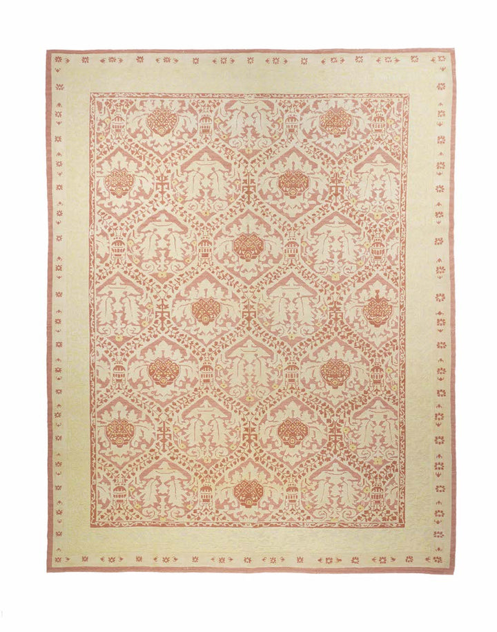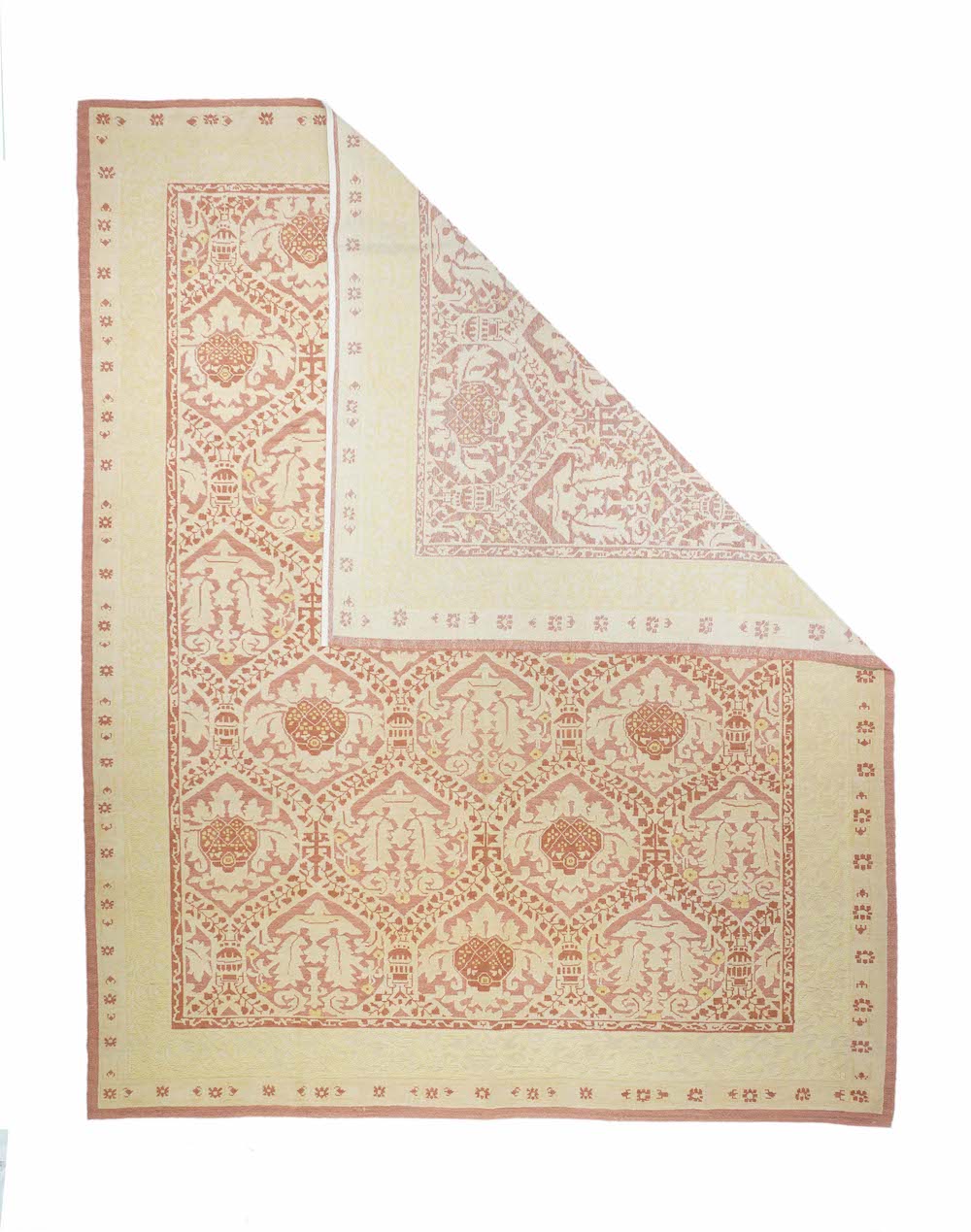 This recent Turkish pileless flat woven carpet shows a broad hexagonal lattice enclosing either twinned leaves and crowns, or artichoke palmettes, in an Ottoman-Italian 16th century silk velvet manner. Plain straw main border. New condition.