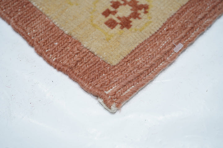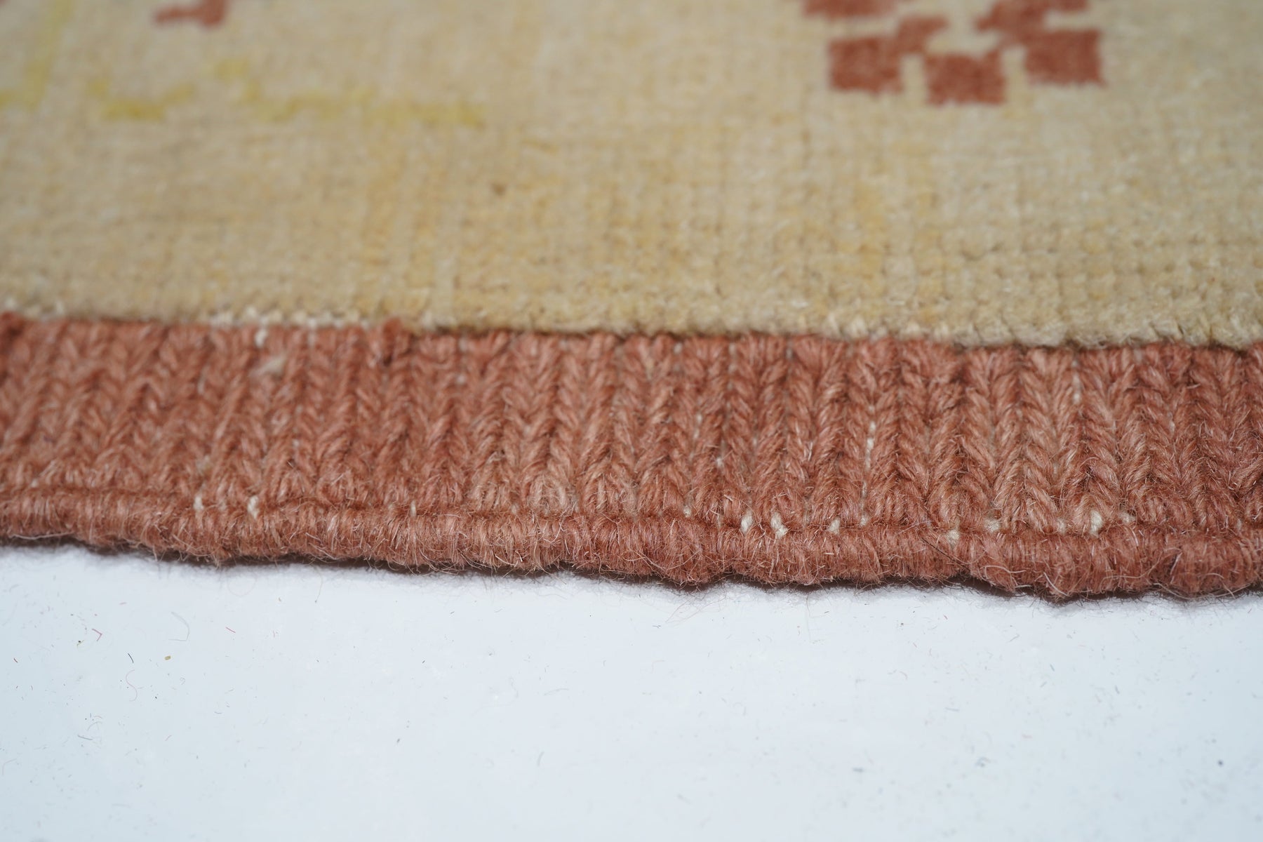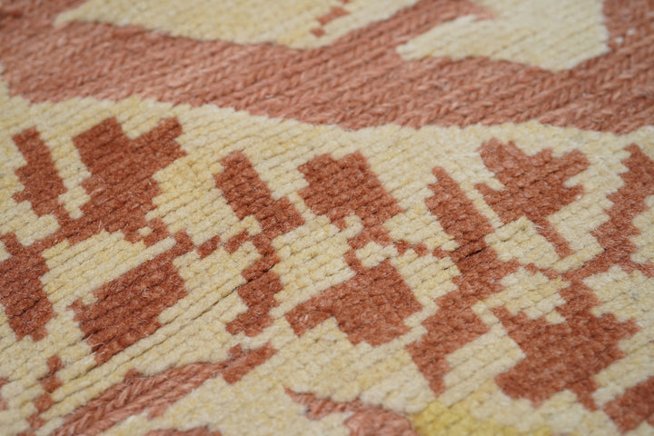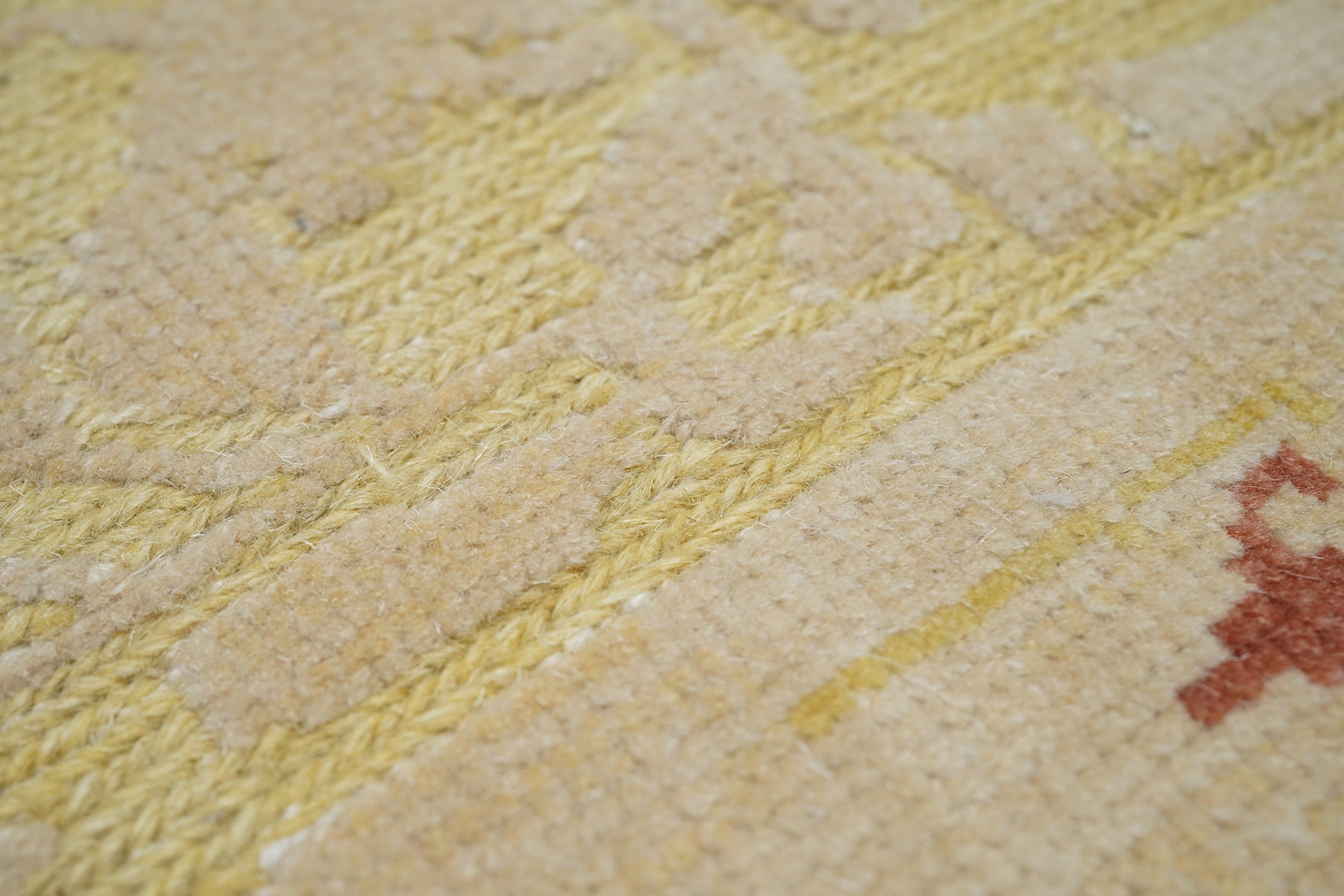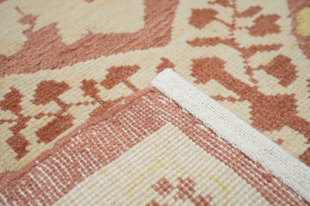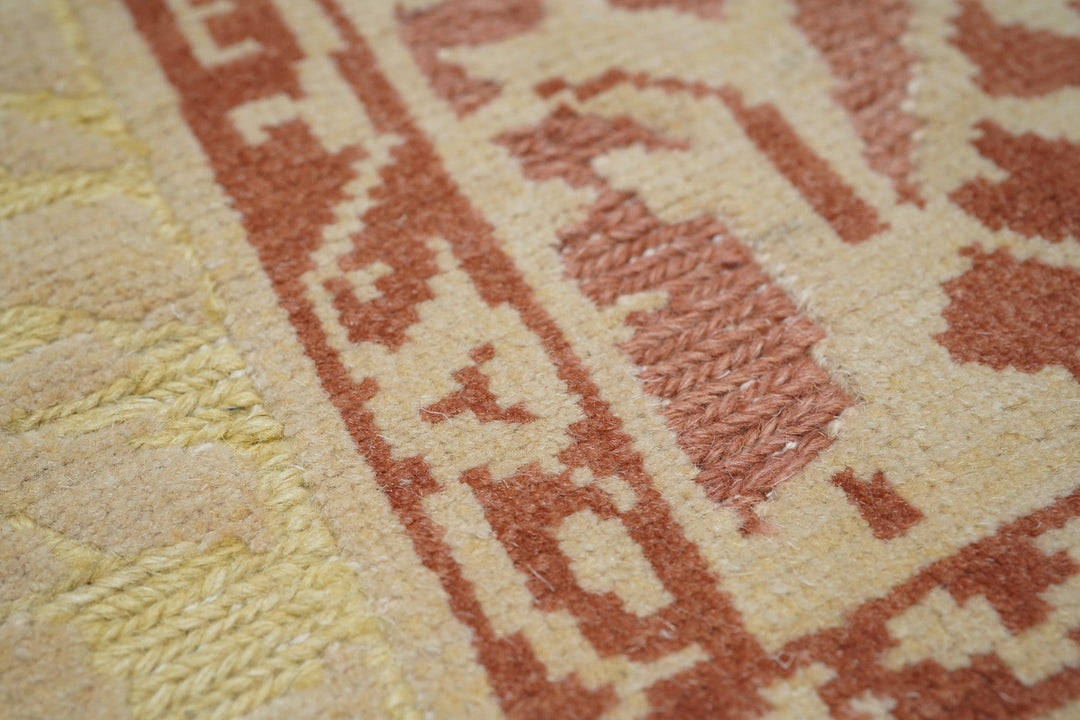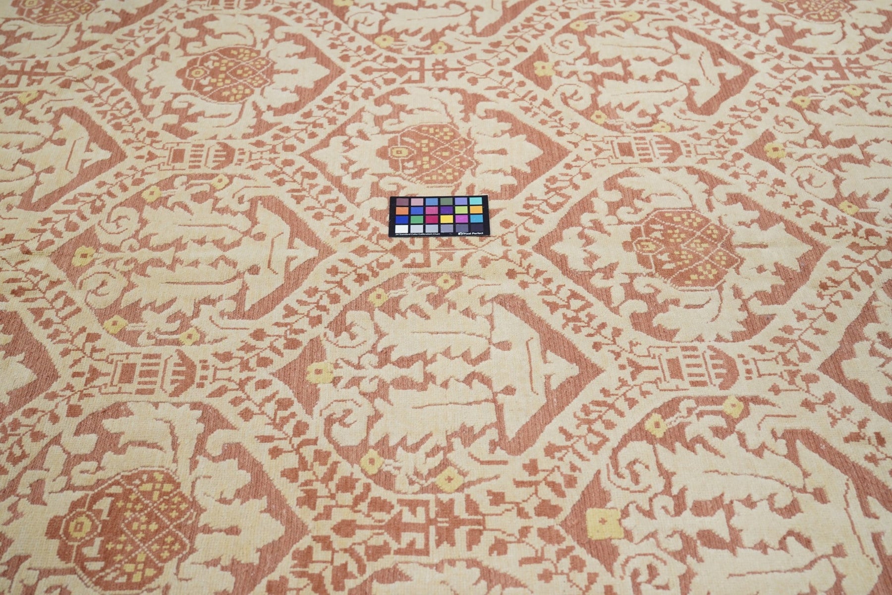 This recent Turkish pileless flat woven carpet shows a broad hexagonal lattice enclosing either twinned leaves and crowns, or artichoke palmettes, in an Ottoman-Italian 16th century silk velvet manner. Plain straw main border. New condition.