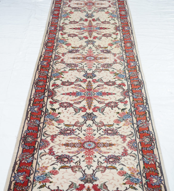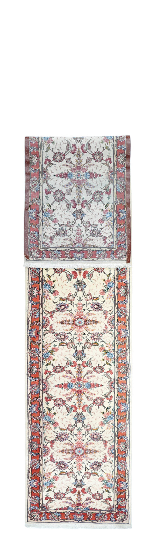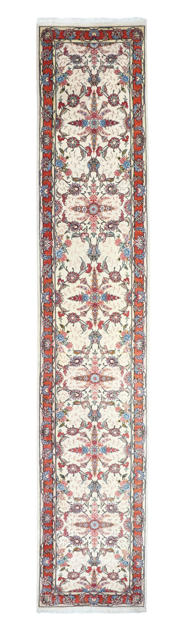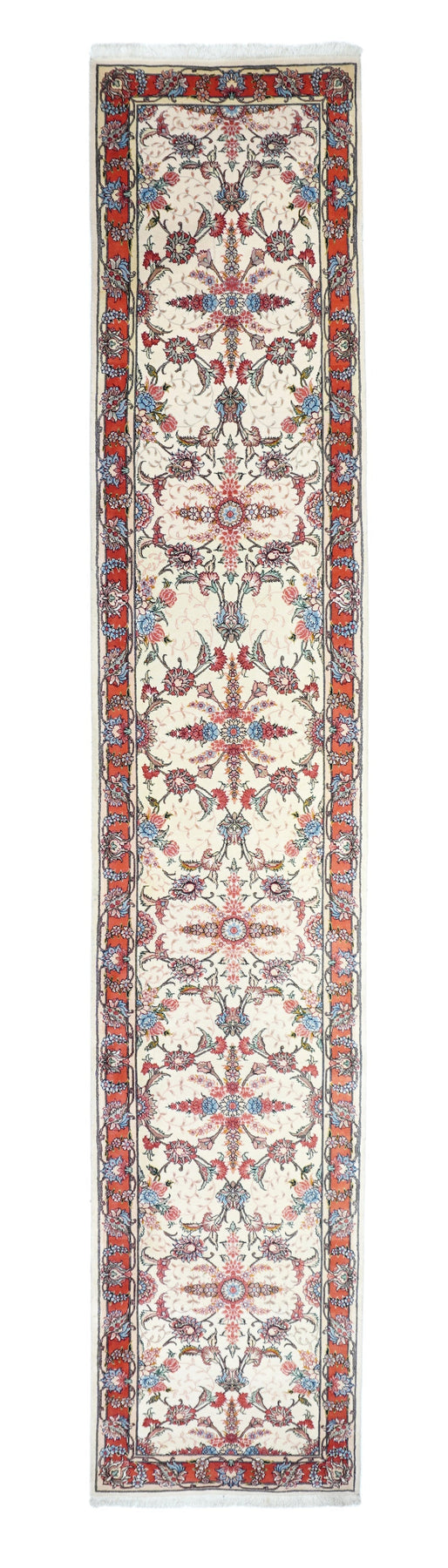 The ecru field shows six full modules, each consisting of a rosette and raceme cruciform, within a full ogival rosette wreath and an outer, larger incomplete wreath. Silk accents throughout. Red border with palmettes. A very finely woven NW Persian urban kenare (runner). Recent. New condition.
