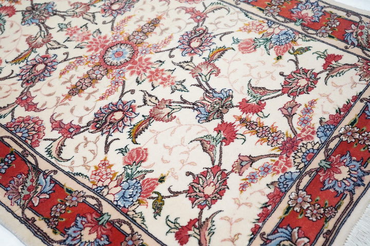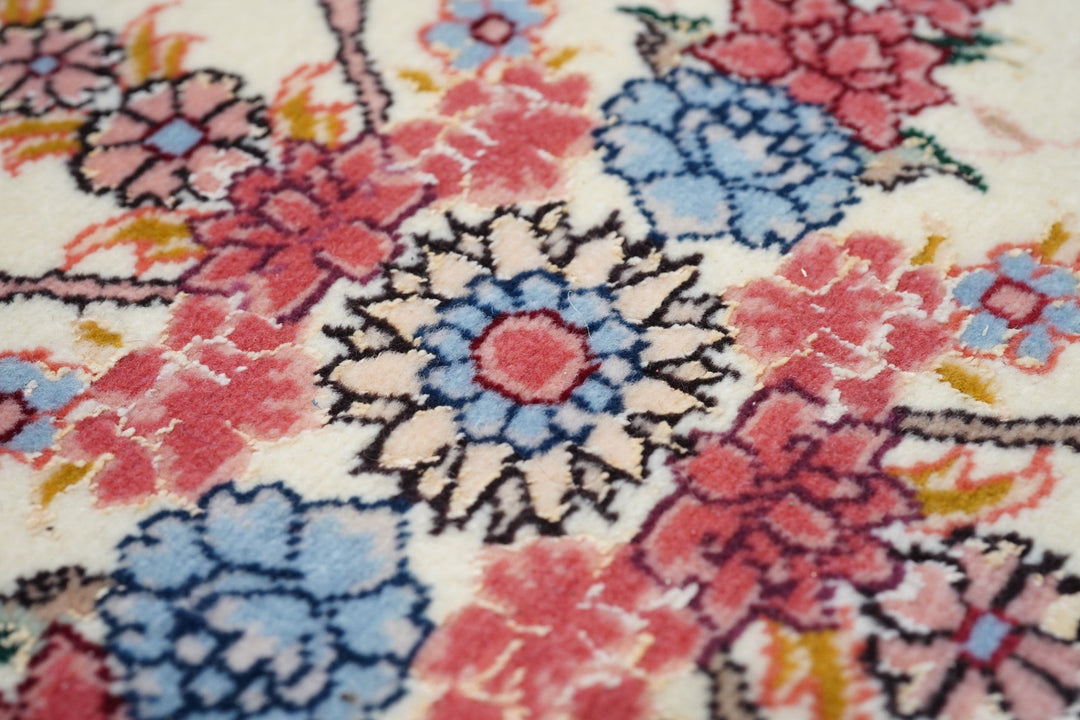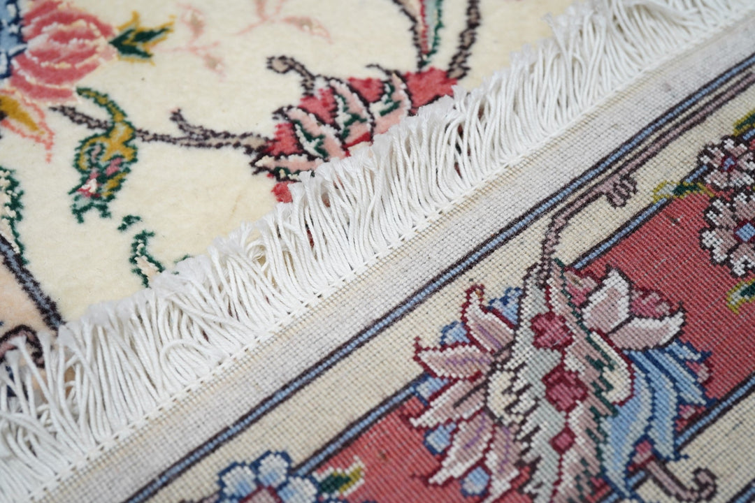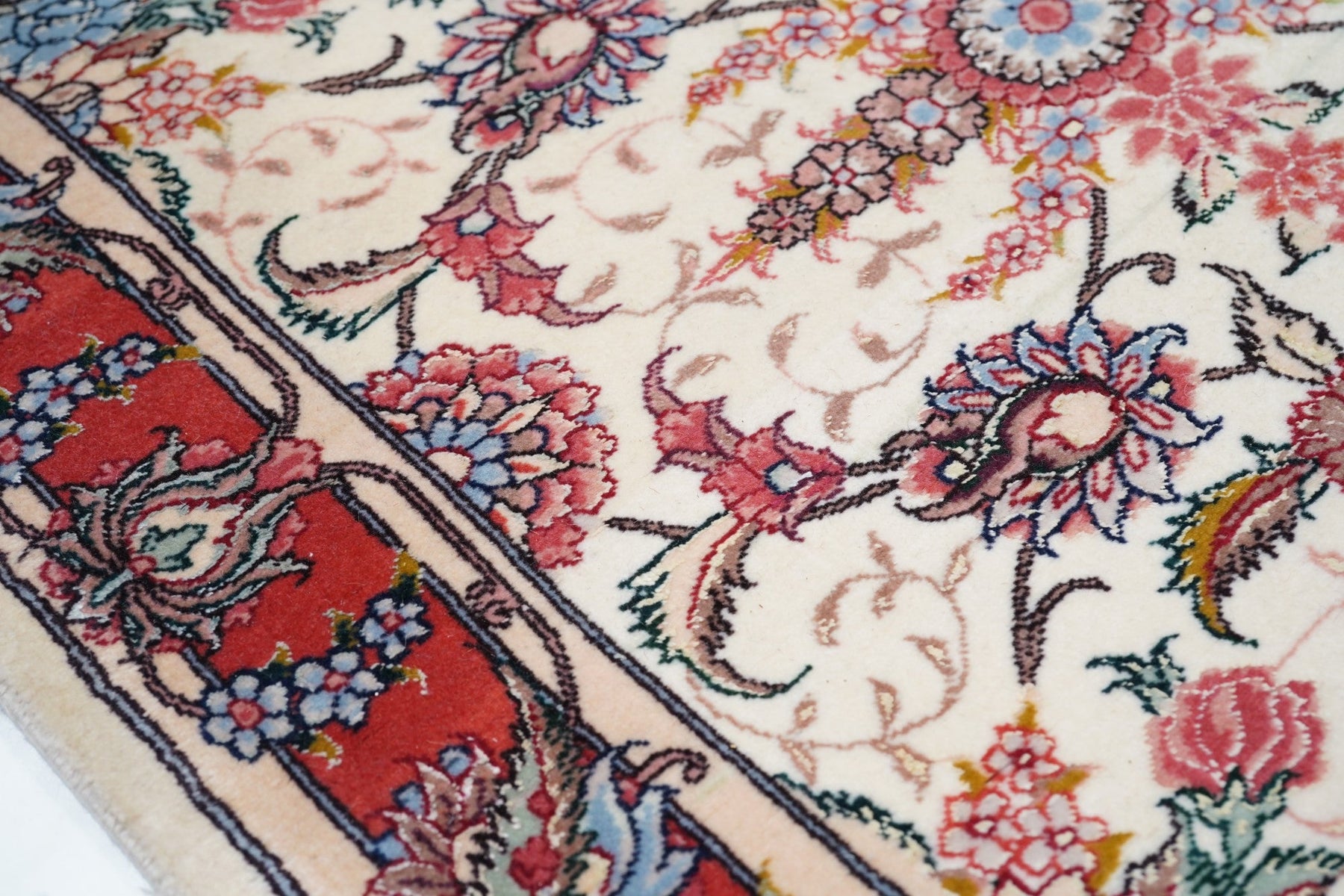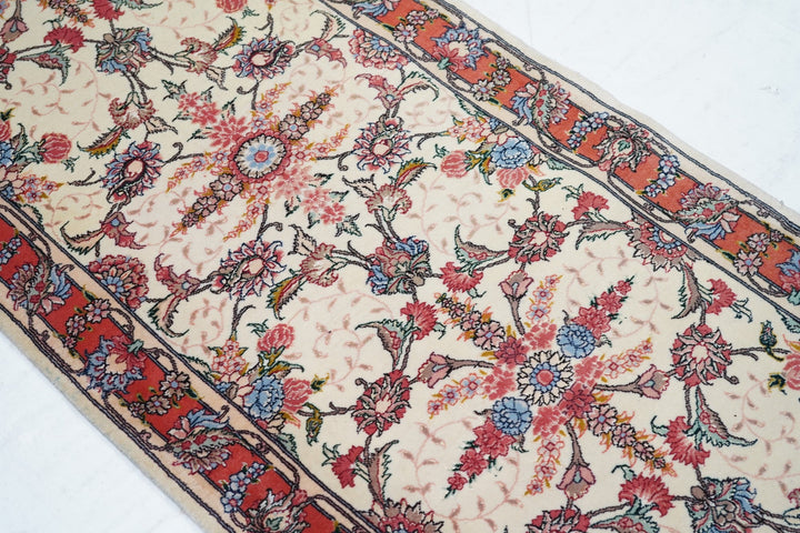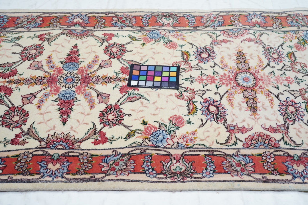 The ecru field shows six full modules, each consisting of a rosette and raceme cruciform, within a full ogival rosette wreath and an outer, larger incomplete wreath. Silk accents throughout. Red border with palmettes. A very finely woven NW Persian urban kenare (runner). Recent. New condition.