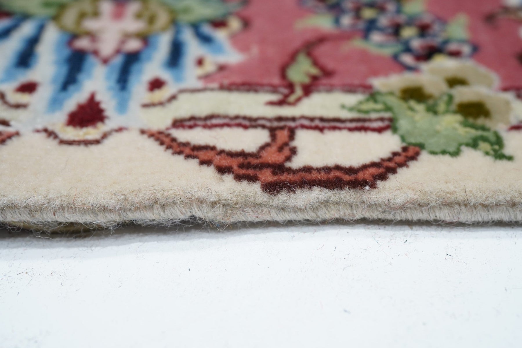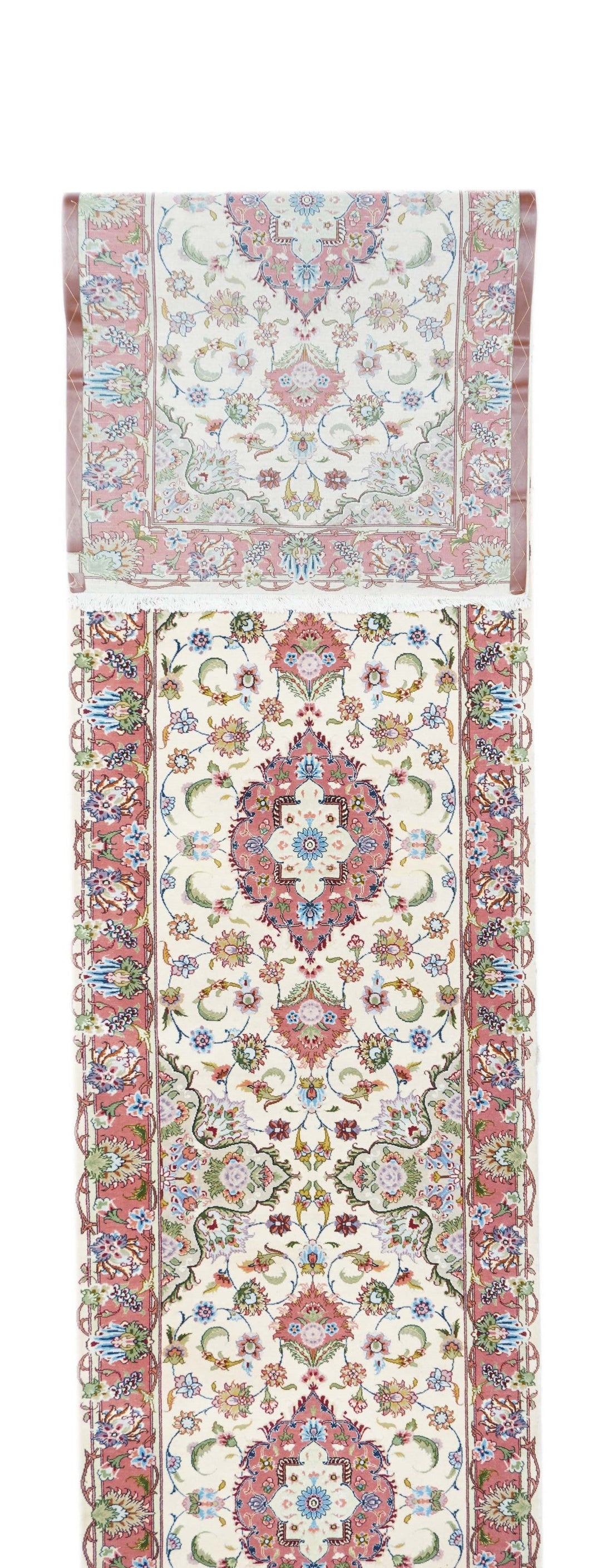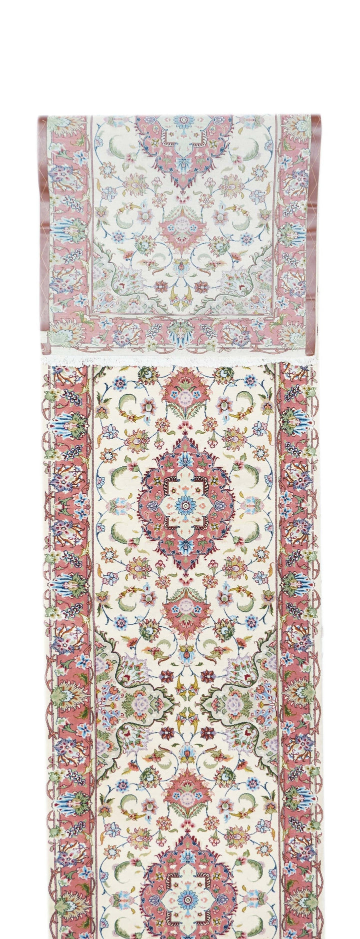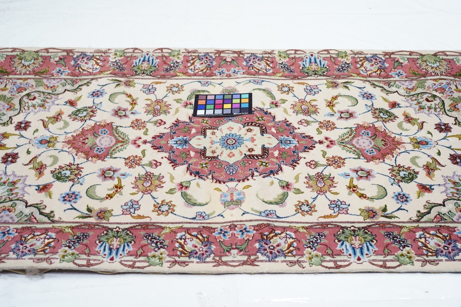 This extremely fine, recent Kenare (runner) shows a cream field in three connected reserves with ragged lappet rose medallions with floating pendants. Straw half medallion side fillers. Expansive rose border with palmettes. Cotton foundation, As new condition.