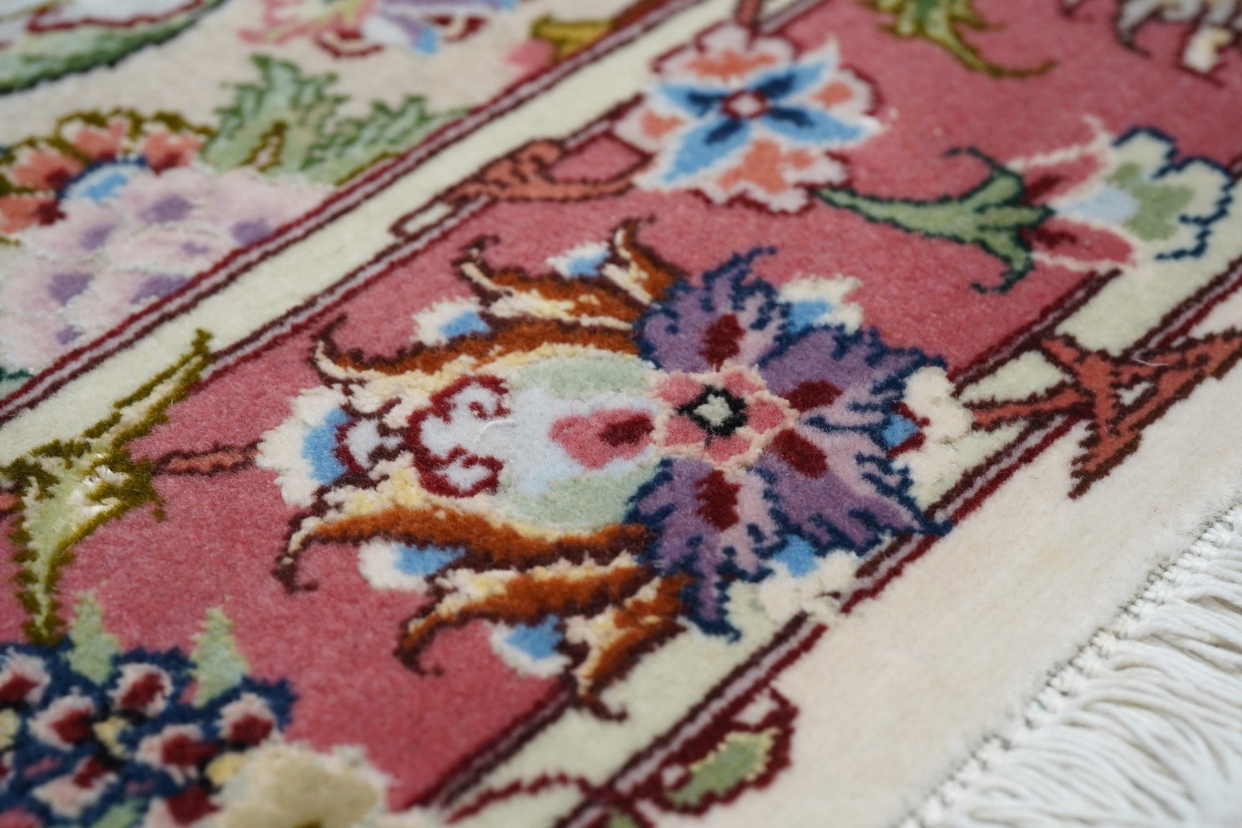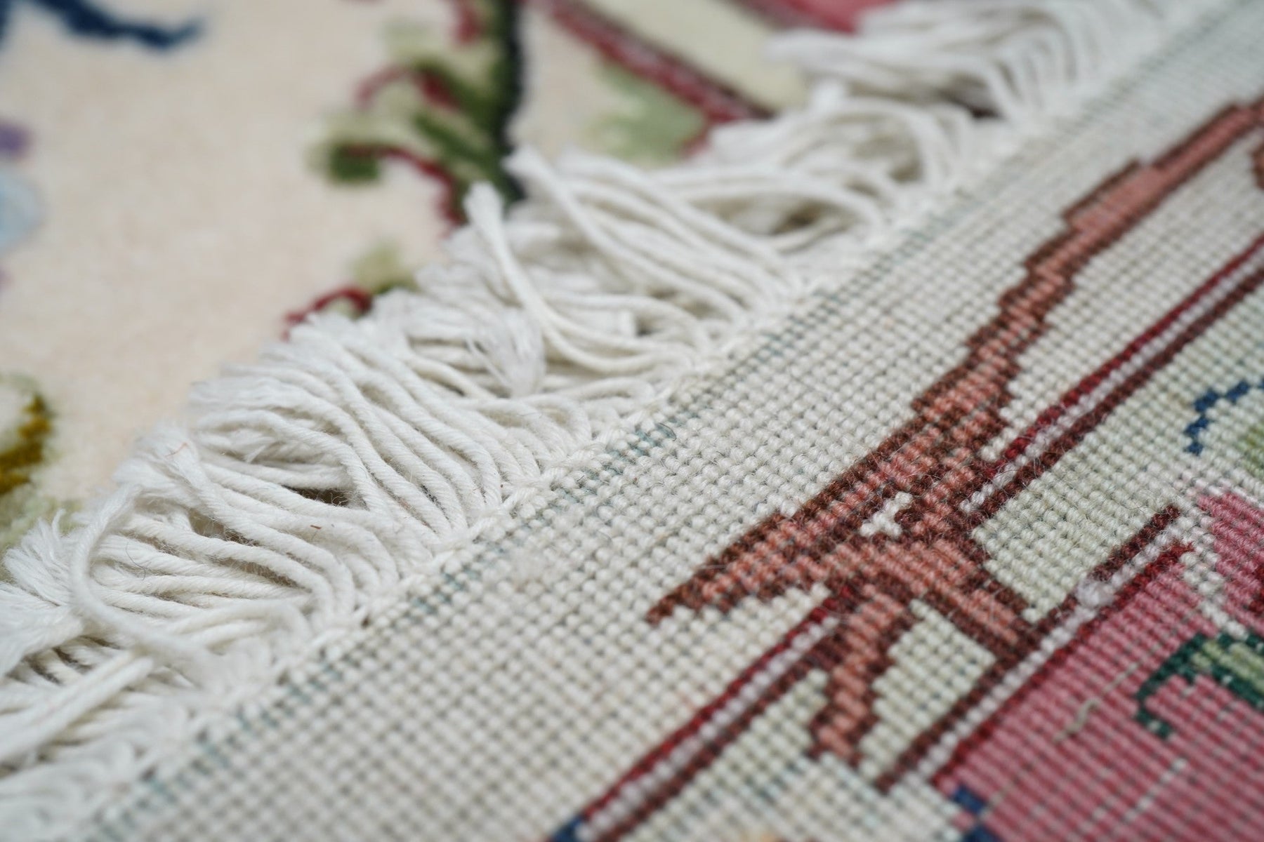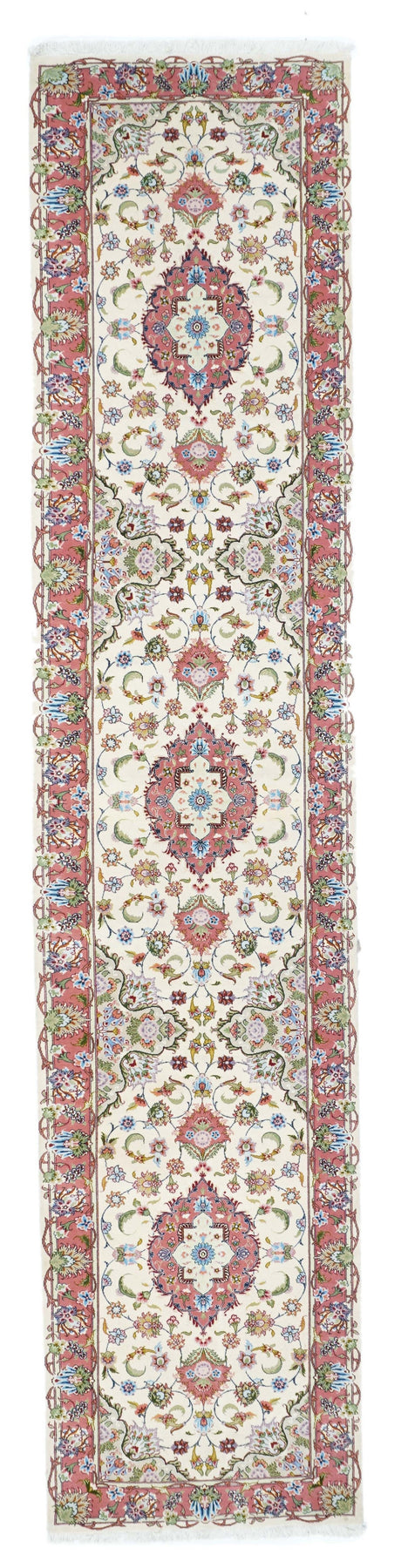 This extremely fine, recent Kenare (runner) shows a cream field in three connected reserves with ragged lappet rose medallions with floating pendants. Straw half medallion side fillers. Expansive rose border with palmettes. Cotton foundation, As new condition.
