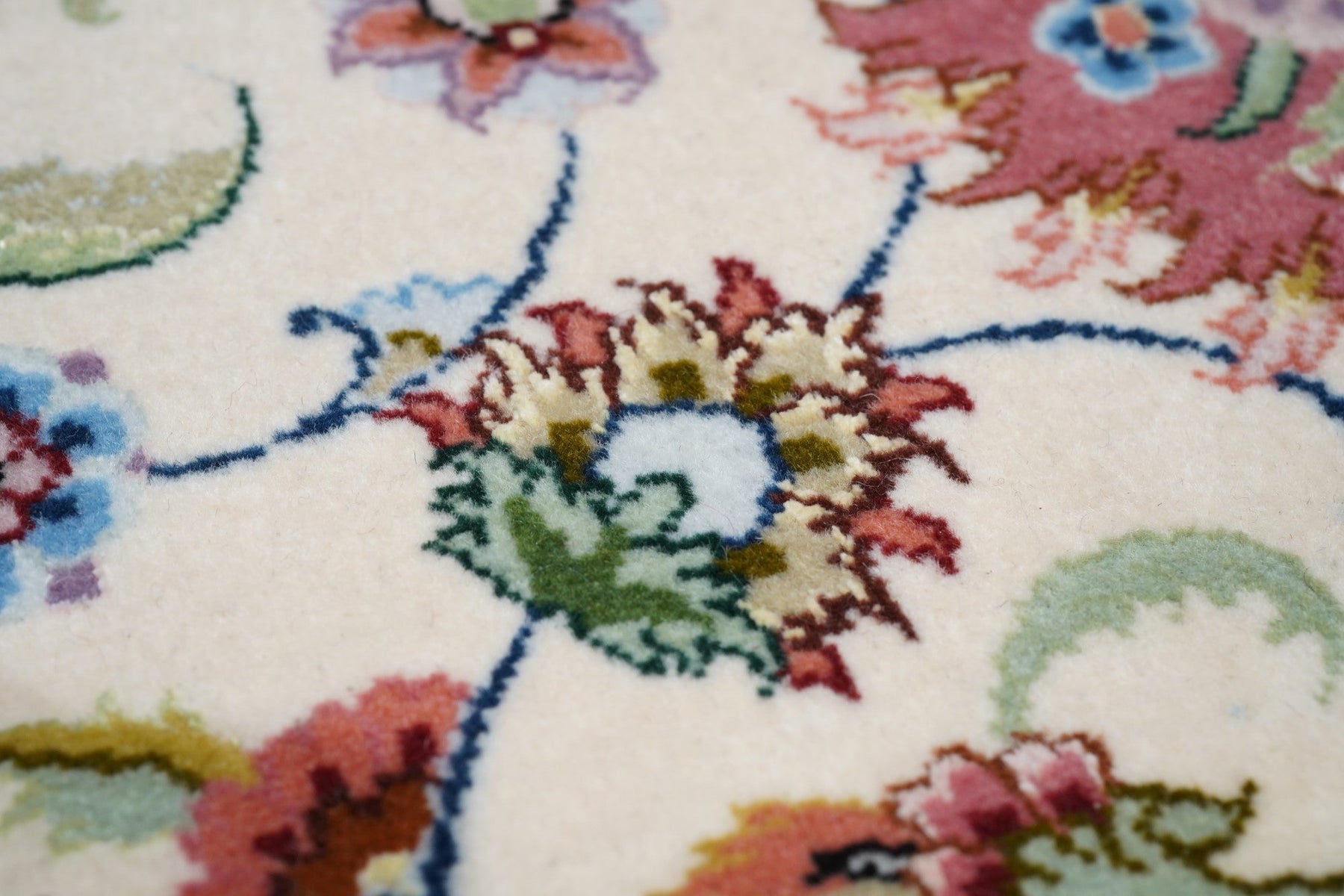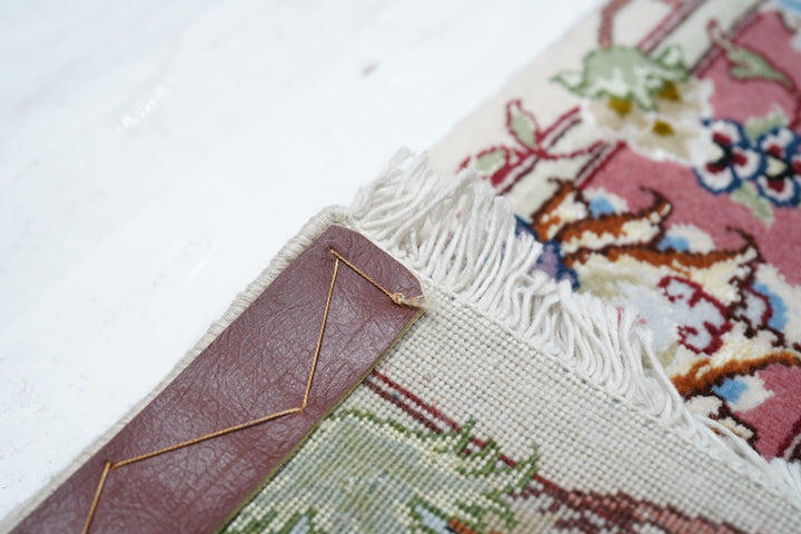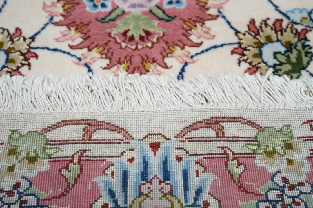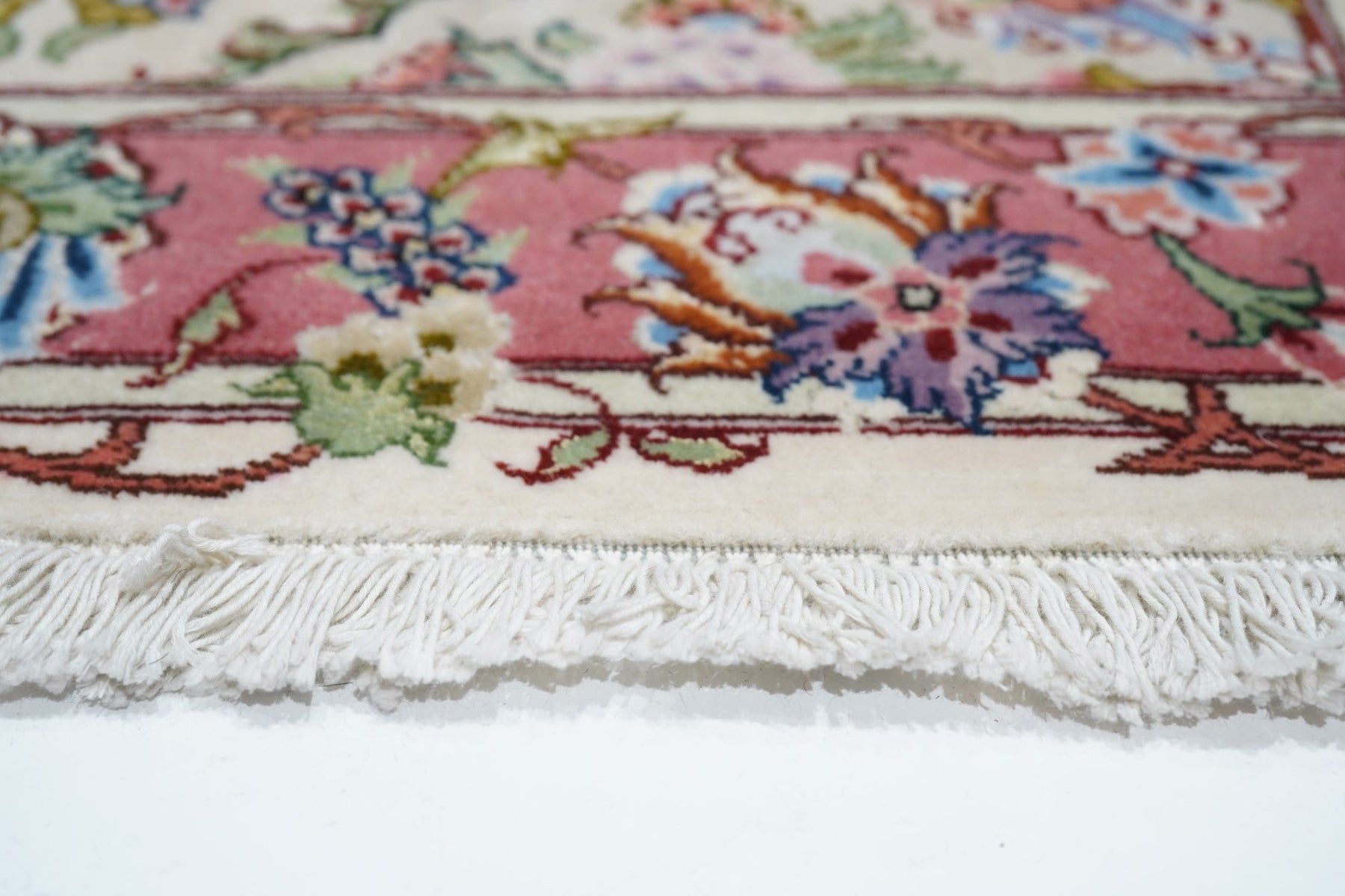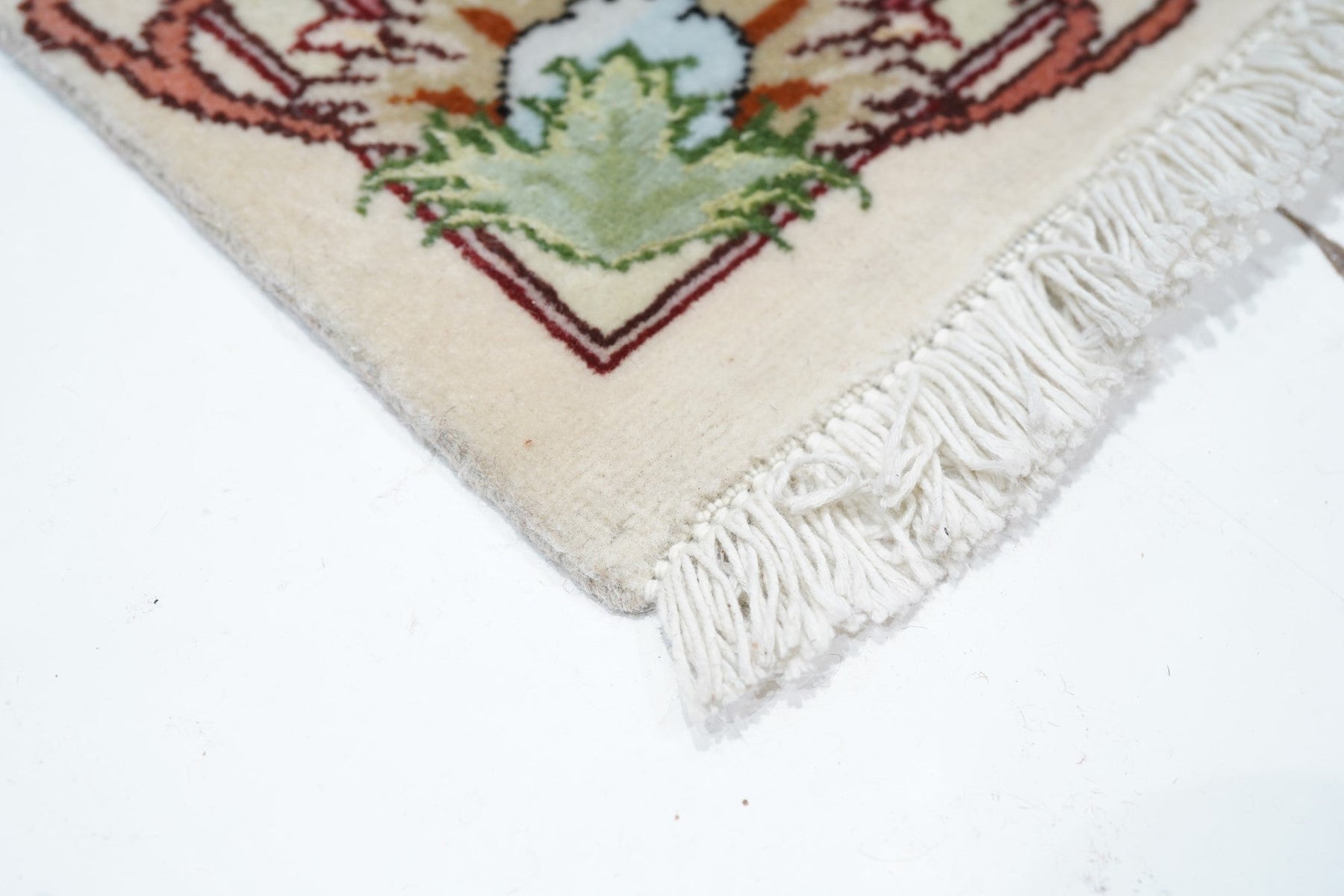 This extremely fine, recent Kenare (runner) shows a cream field in three connected reserves with ragged lappet rose medallions with floating pendants. Straw half medallion side fillers. Expansive rose border with palmettes. Cotton foundation, As new condition.