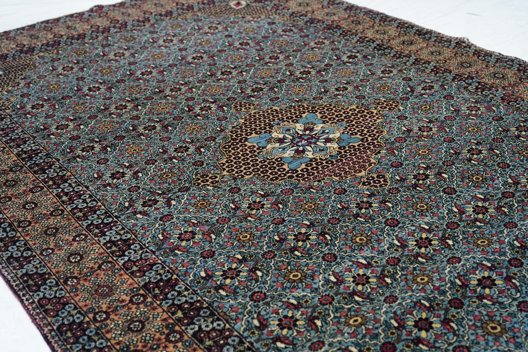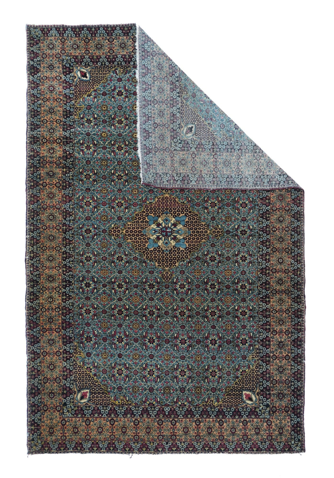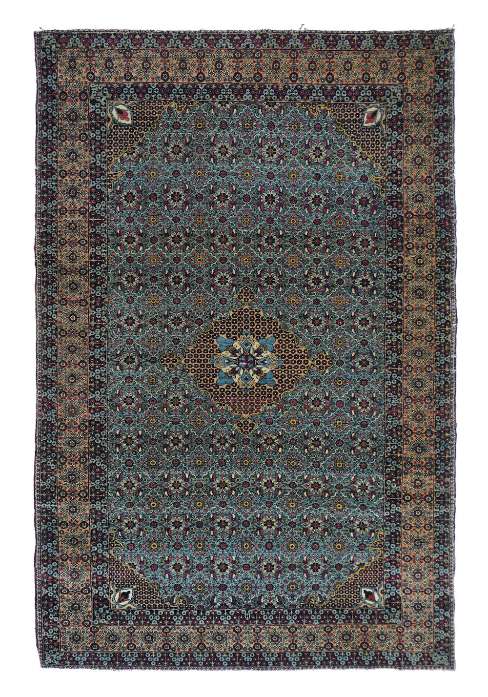 The perfectly proportioned light blue field supports an even stepped diamond trellis of larger and smaller reserves, joined by and centring palmettes. Blue sand cream octogramme petal sub-medallion within a doughnut-dotted medallion and en suite small corners. Tan-gold border with a repeat of radiating rosette modules. Navy minors with potted flowering plants. Fine weave. Unusual design and palette with very little red. Good condition.