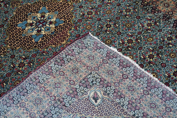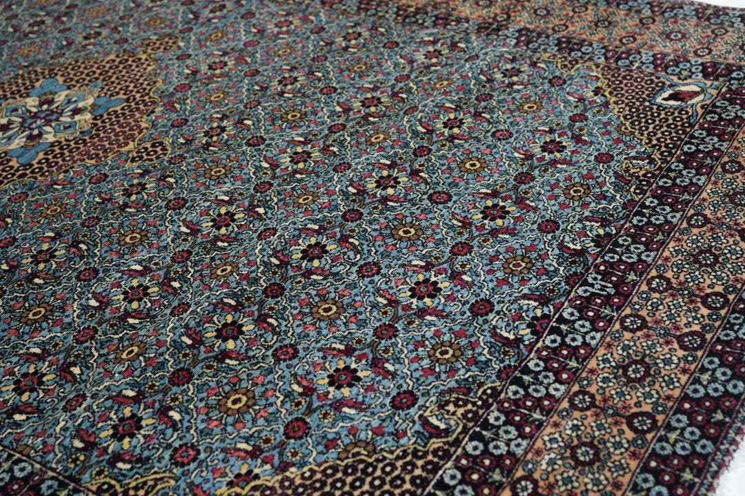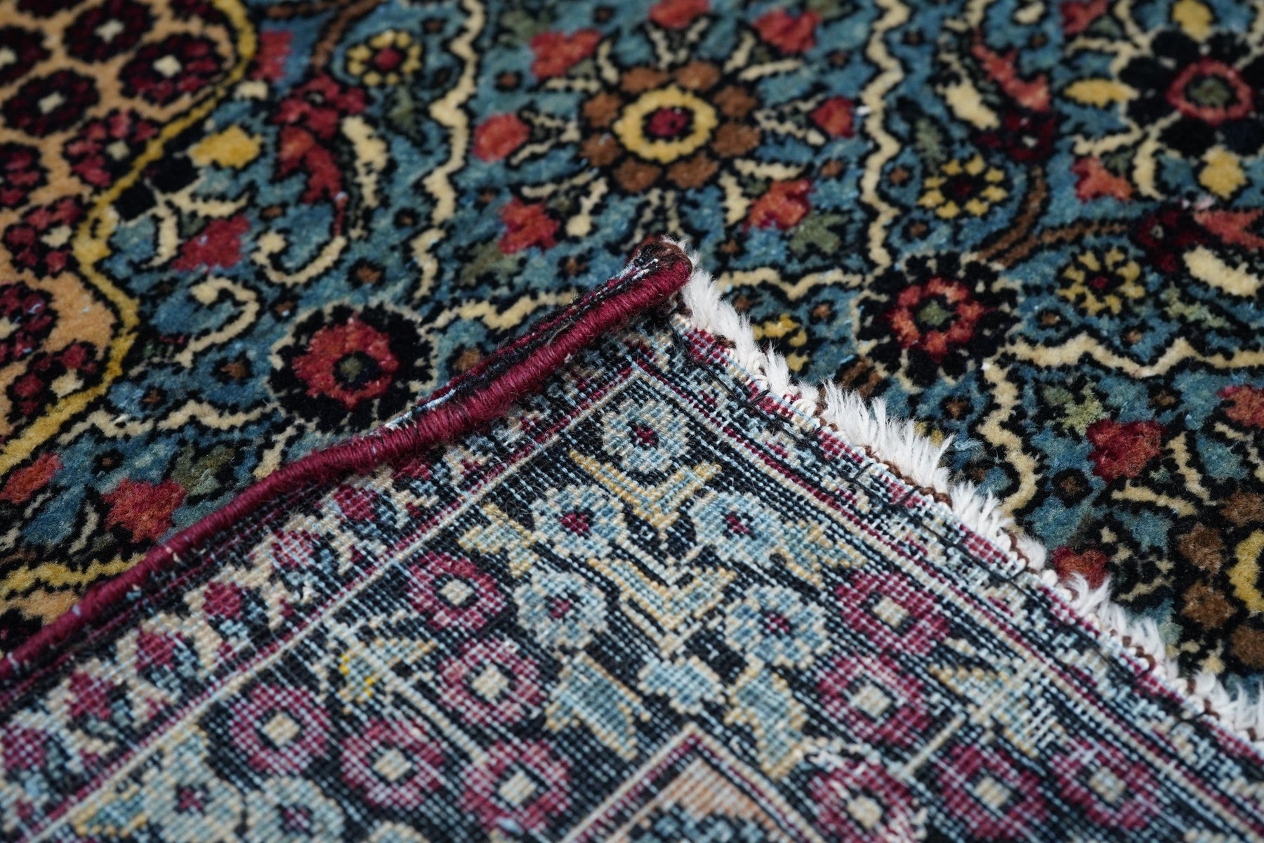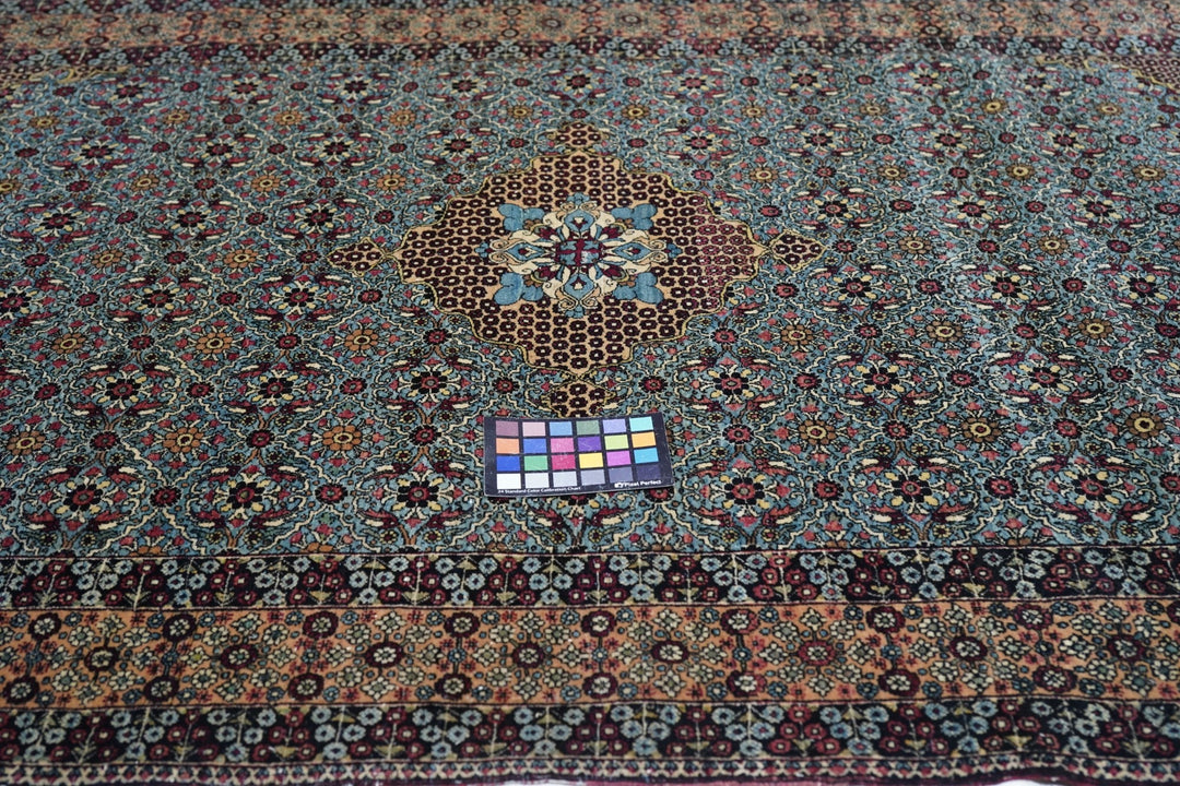 The perfectly proportioned light blue field supports an even stepped diamond trellis of larger and smaller reserves, joined by and centring palmettes. Blue sand cream octogramme petal sub-medallion within a doughnut-dotted medallion and en suite small corners. Tan-gold border with a repeat of radiating rosette modules. Navy minors with potted flowering plants. Fine weave. Unusual design and palette with very little red. Good condition.