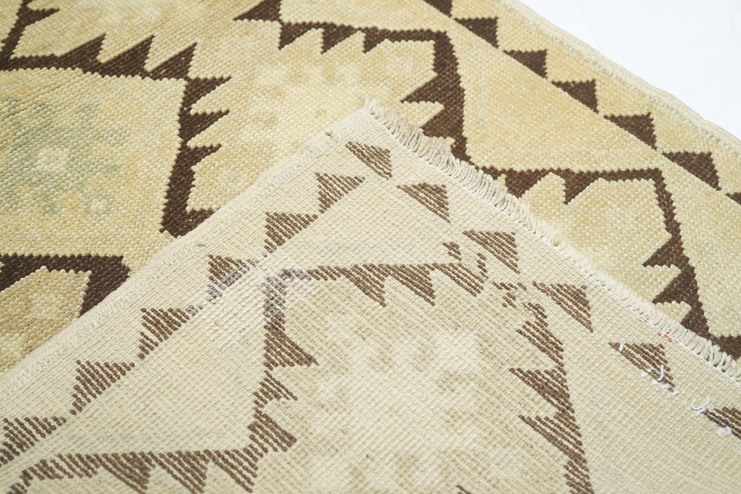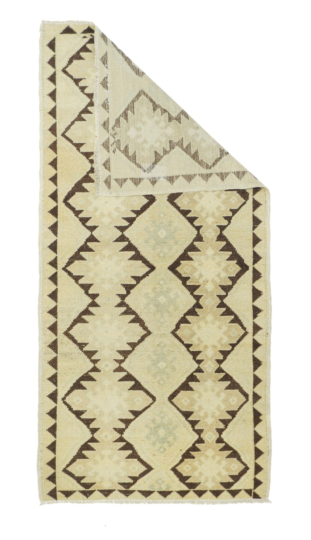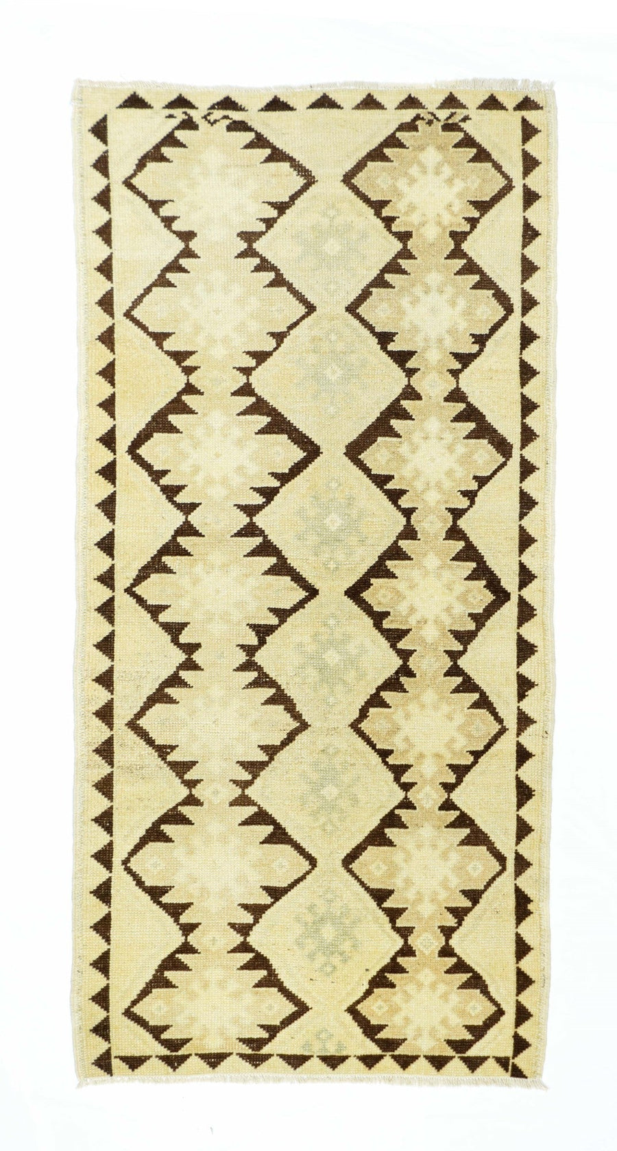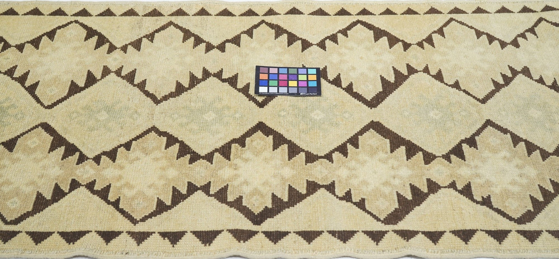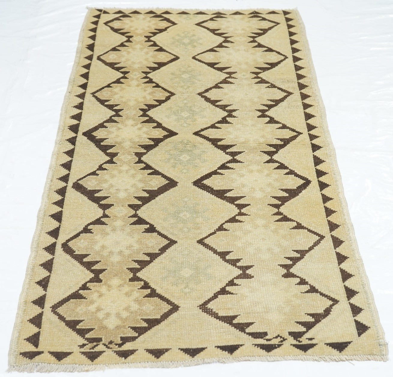 This miniature kellegi shows a generally lighter palette of straw and tan, with well-contained brick red reserves connected to form pole medallions. Other pattern is tone-on-tone shadowy. Narrow brick triangle border. Wool foundation. Very slight spot wear. Good condition generally.