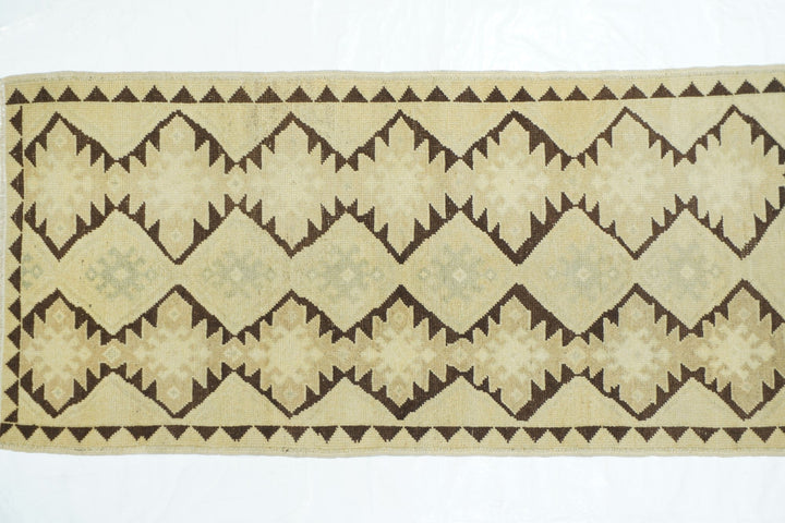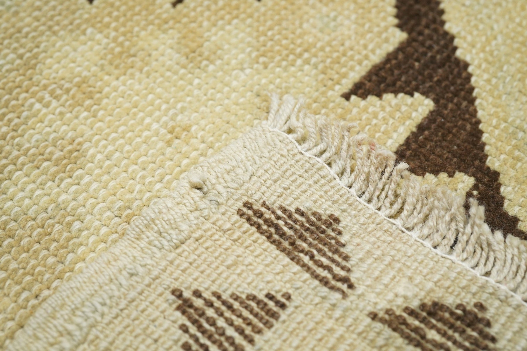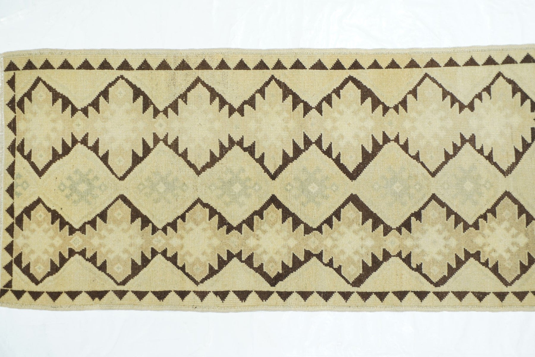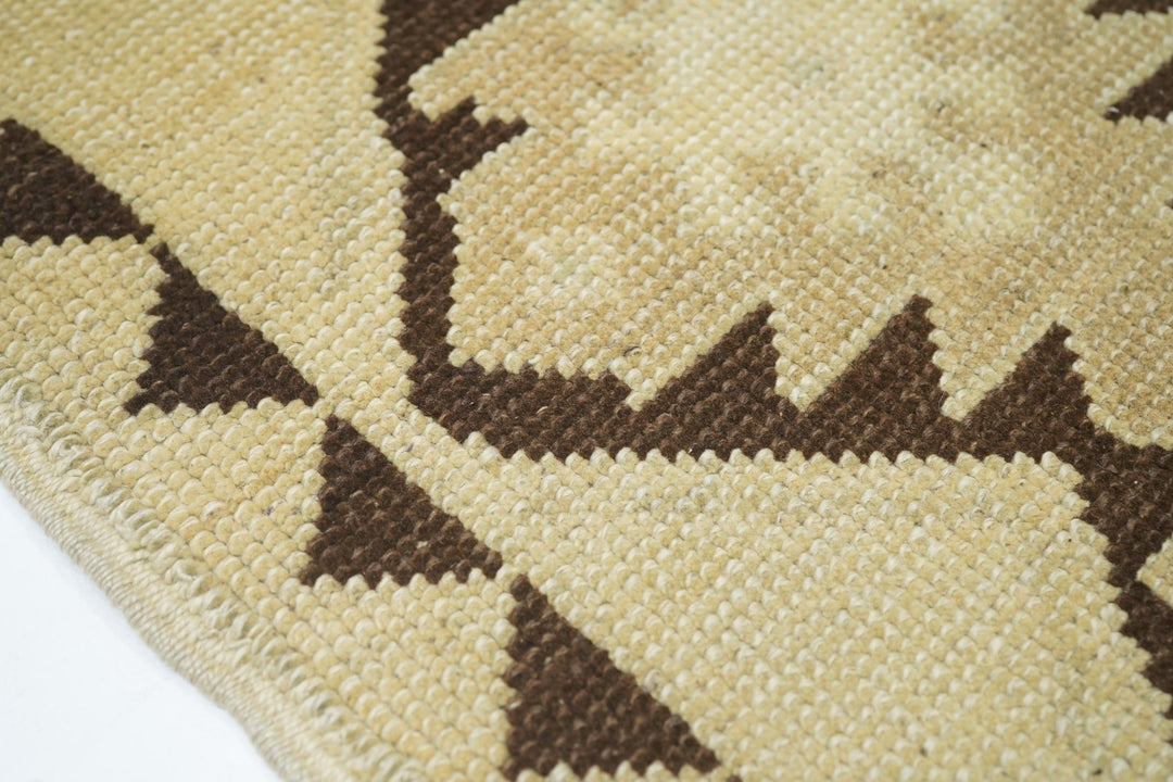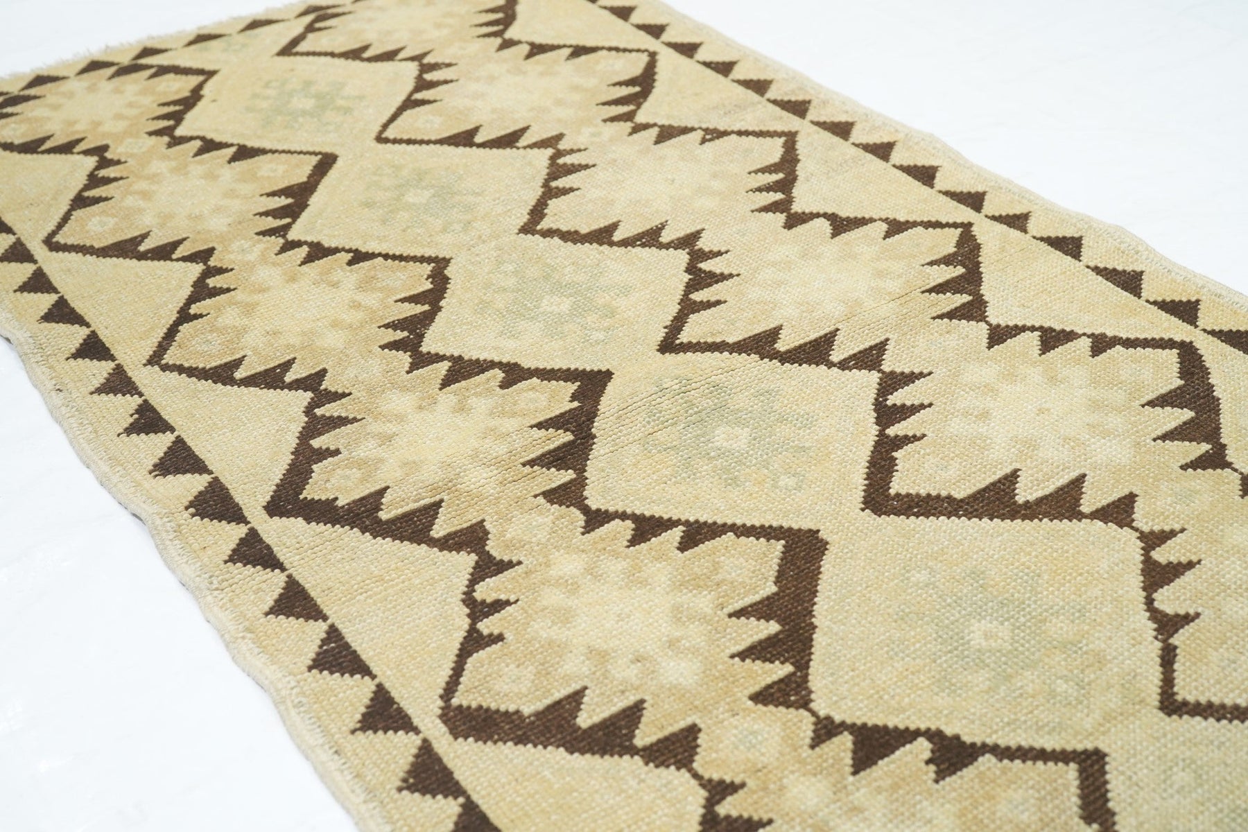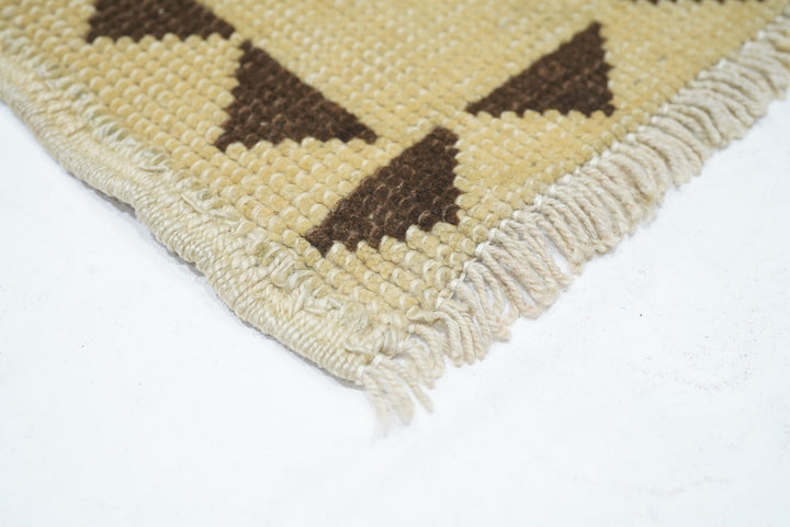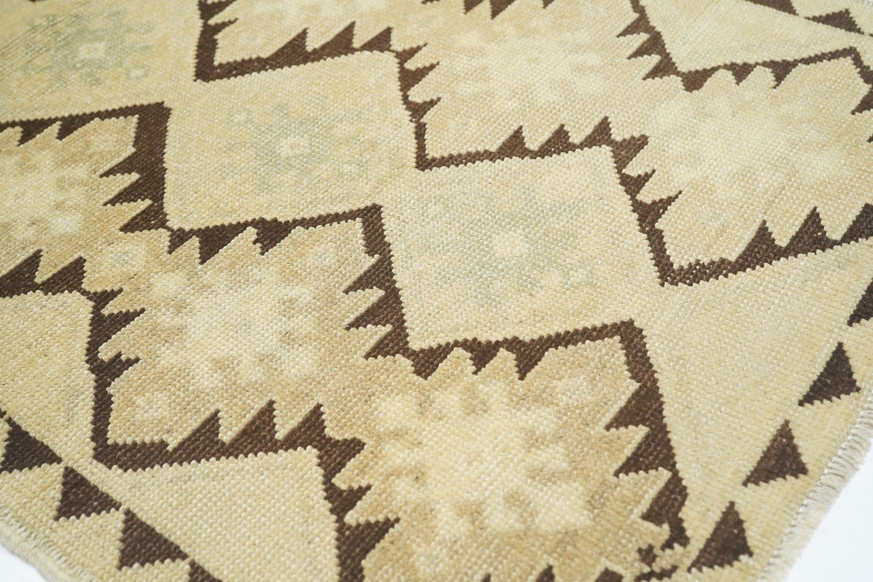 This miniature kellegi shows a generally lighter palette of straw and tan, with well-contained brick red reserves connected to form pole medallions. Other pattern is tone-on-tone shadowy. Narrow brick triangle border. Wool foundation. Very slight spot wear. Good condition generally.