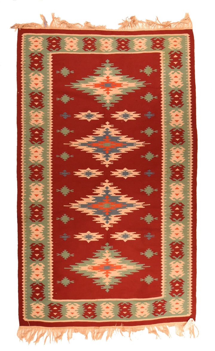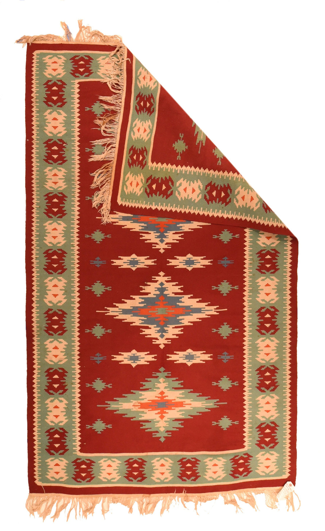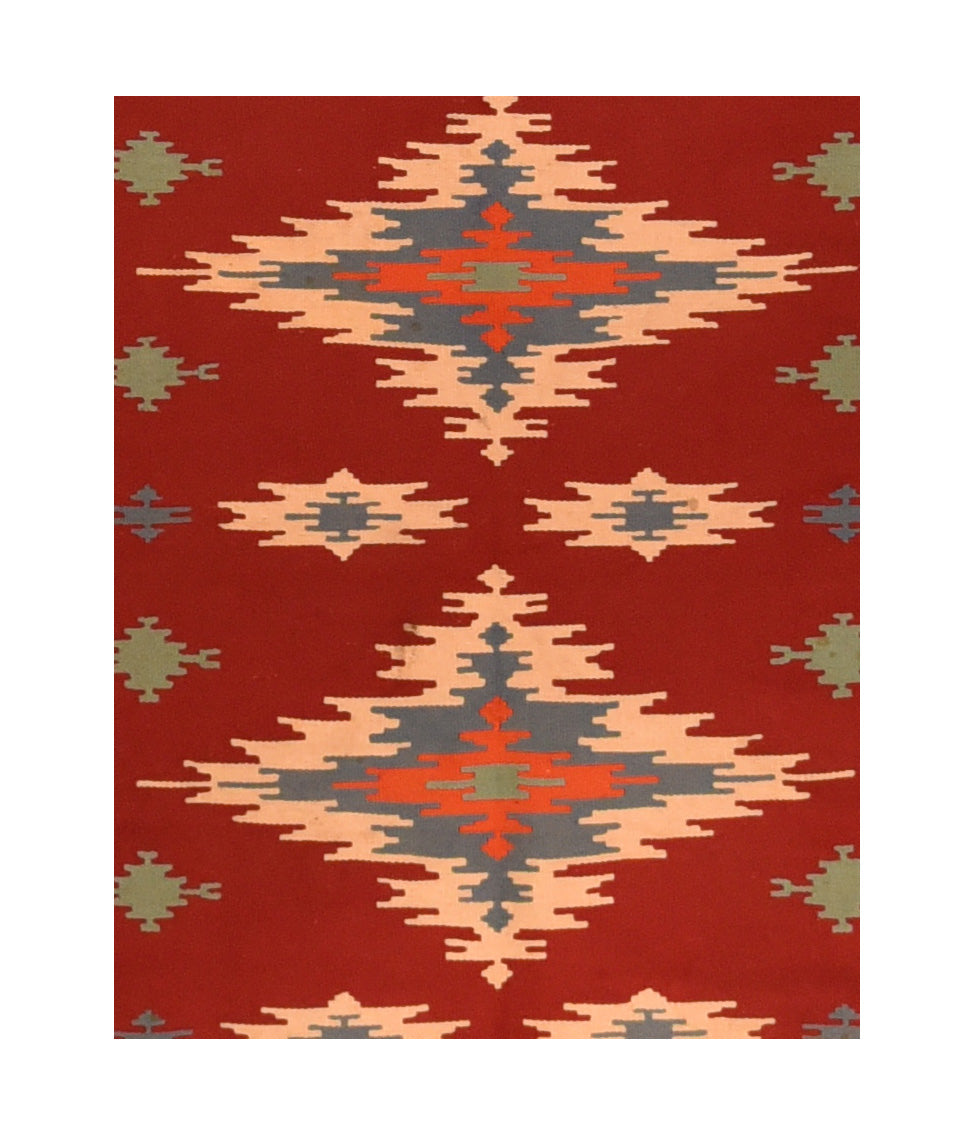 The solid cardinal red field displays four sharply toothed, slightly concave lozenges in blue, green, ecru and tangerine-rust, with lesser ashiks and flattened stars around. Pale green border with "bugs" in ecru and red. Slit-tapestry weave with wool wefts. Medium weave density. As new condition.