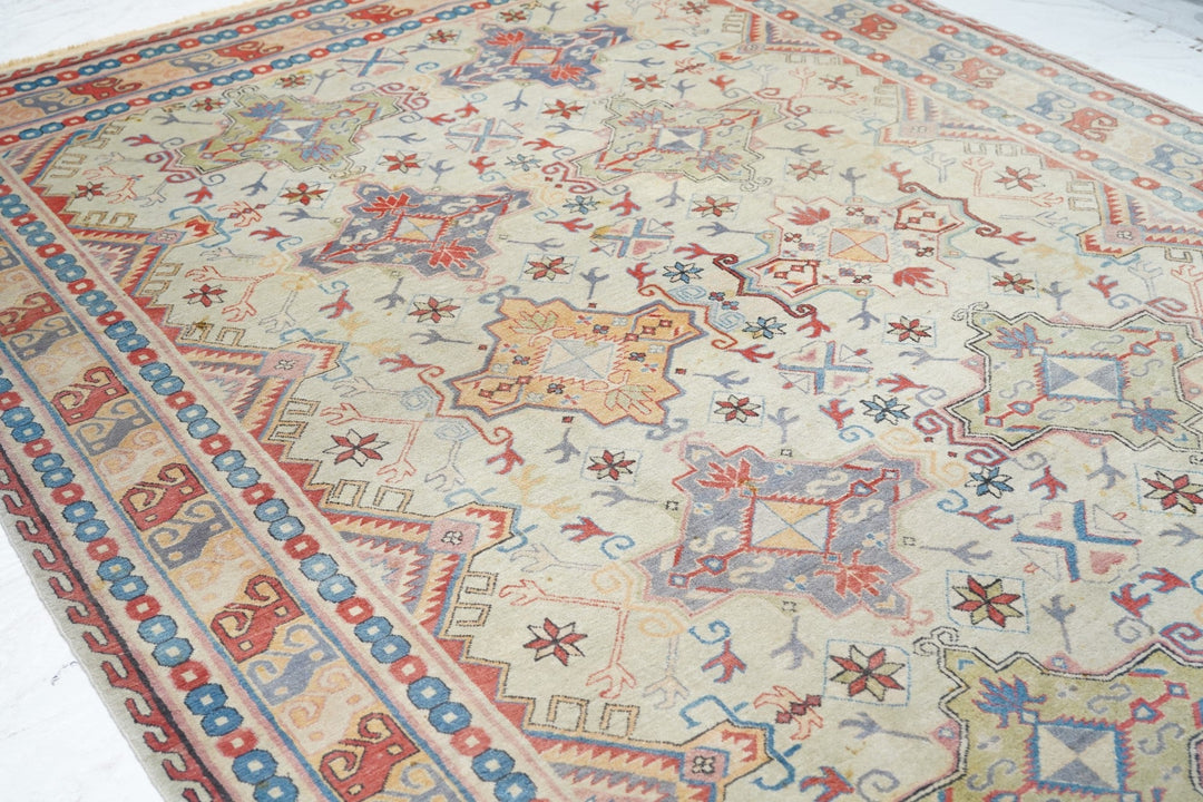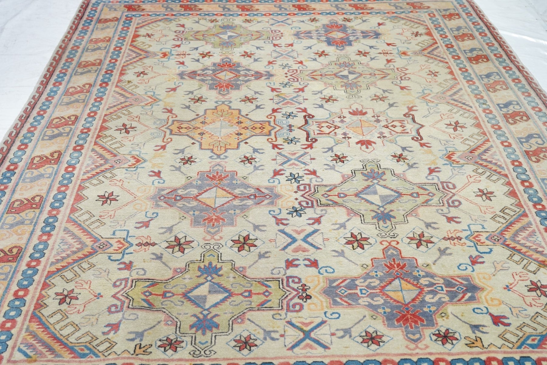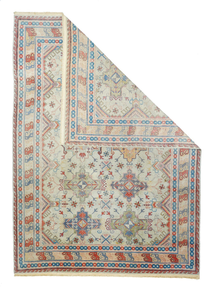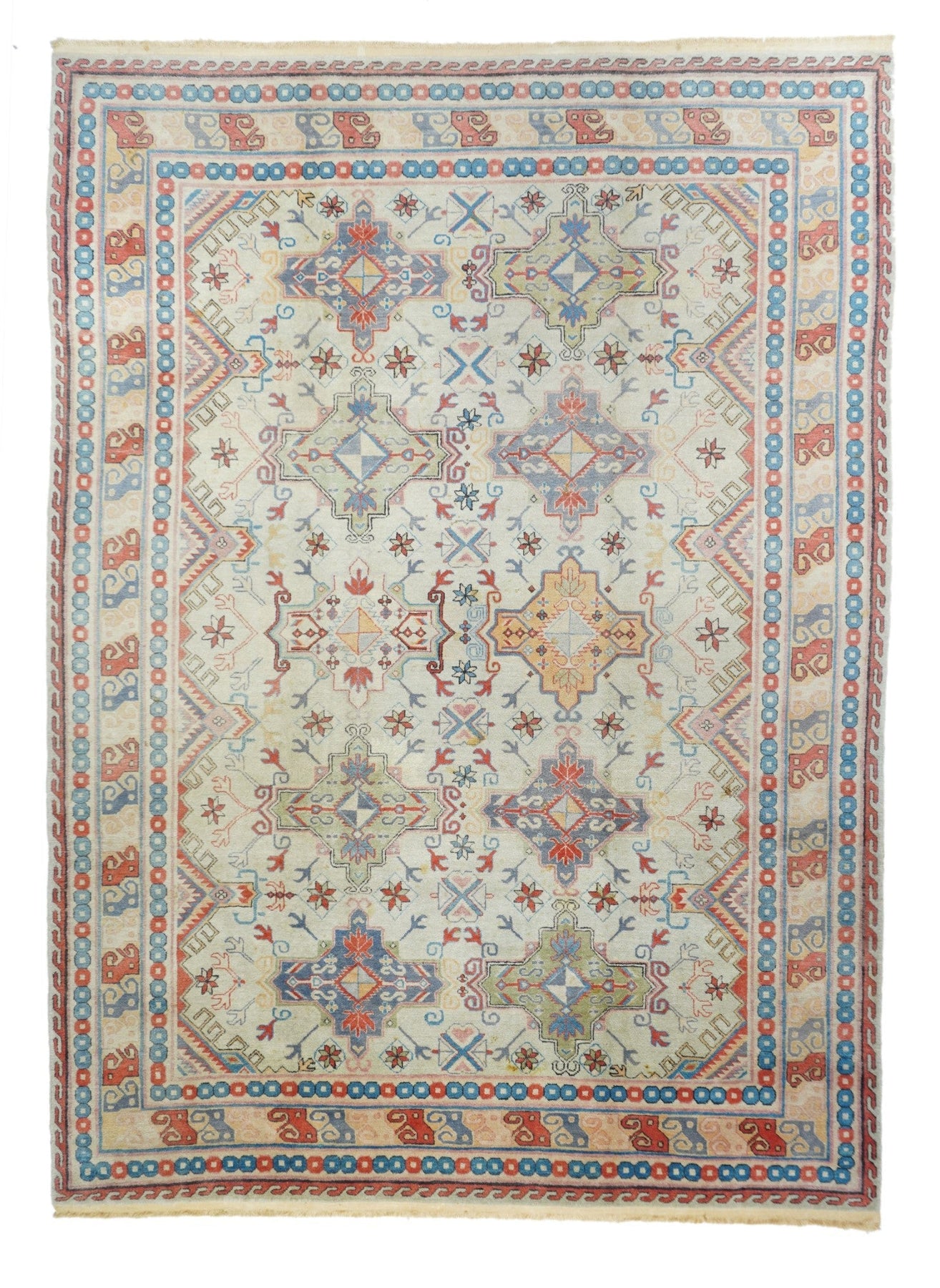 The light straw field show two columns, each of five variously colored, laterally extended, octogramme medallions, all sprouting thin floral extensions, with rainbow striped, nested lateral columns of triangles. Straw main border with red, cream and light blue details. Cotton foundation, medium weave. Versatile size. East Turkestan Xinjiang Province oasis town carpet.